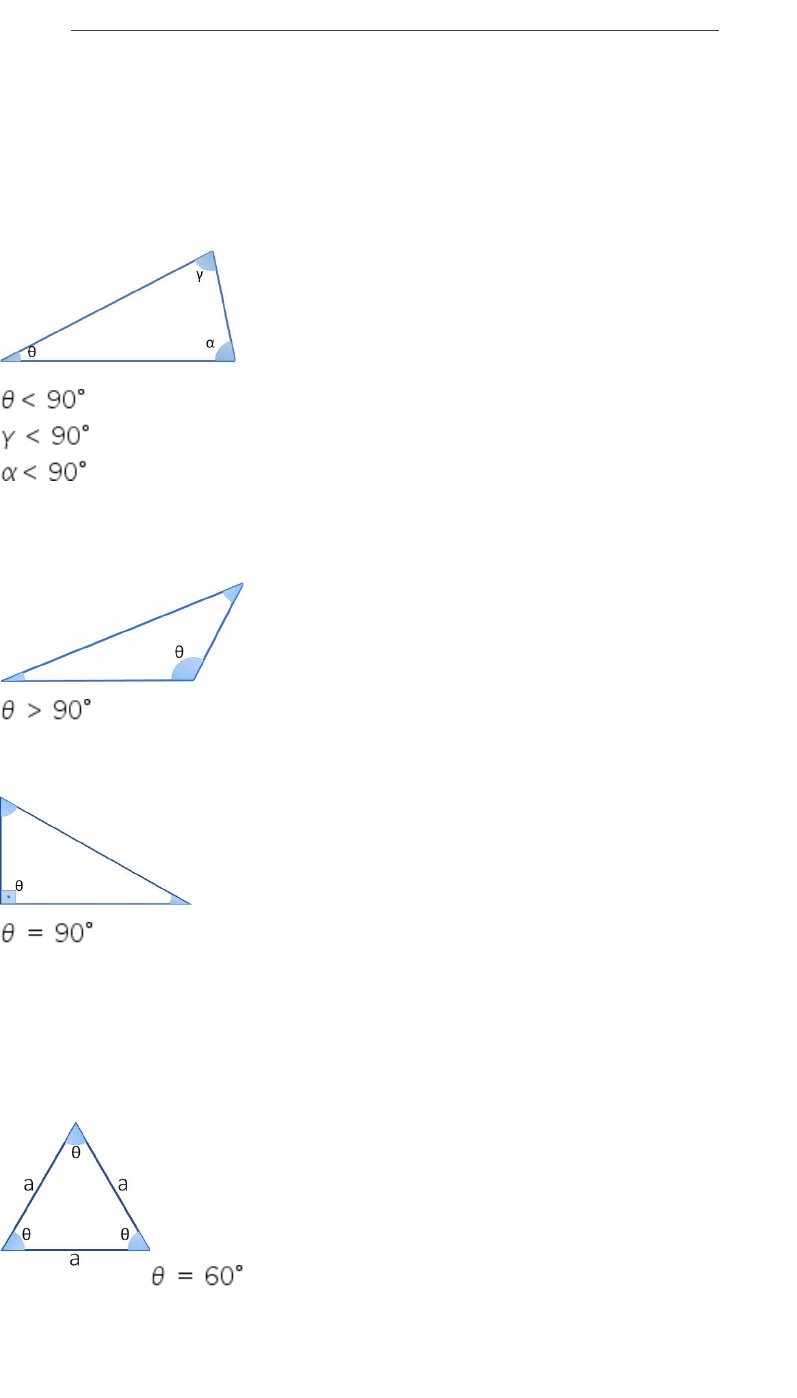 <p>GEOMETRIA: ESTUDANDO UM POUCO OS TRIÂNGULOS</p><p>Triângulo é um polígono de três lados e três ângulos. Há seis tipos de triângulos e sua classificação depende da disposição dos ângulos internos e das medidas de seus lados.</p><p>Tipos de triângulos em relação aos ângulos</p><p>Triângulo acutângulo: Um triângulo é acutângulo quando possui os três ângulos agudos, ou seja, com menos de 90°.</p><p>Teta, Gama e Alfa</p><p>Triângulo obtusângulo: Um triângulo é obtusângulo quando possui um ângulo obtuso, ou seja, com mais de 90°.</p><p>Triângulo retângulo: Um triângulo é retângulo quando possui um ângulo reto, de 90°.</p><p>Tipos de triângulos em relação às medidas dos lados:</p><p>Triângulo equilátero: Um triângulo equilátero possui os três lados com a mesma medida de comprimento. Por consequência, todo triângulo equilátero também é equiângulo e acutângulo, pois todos os seus ângulos são iguais a 60°.</p><p>Três lados iguais com medida a.</p><p>Três ângulos iguais com medida de 60°. Vértices: pontos A, B e C</p><p>Lados: segmentos de reta AB, BC, CD</p><p>Triângulo isósceles: Um triângulo isósceles possui dois lados com a mesma medida de comprimento. Por consequência, dois ângulos iguais.</p><p>Dois lados com medidas iguais a.</p><p>Dois ângulos com medidas iguais.</p><p>Triângulo escaleno: Um triângulo é escaleno quando seus três lados possuem medidas de comprimento diferentes. Por consequência, seus três ângulos possuem medidas diferentes.</p><p>Os lados a, b e c possuem medidas diferentes entre si.</p><p>Os ângulos e possuem medidas diferentes entre si.</p><p>Classificação dos triângulos</p><p>Um mesmo triângulo tem duas classificações: uma em relação aos lados e outra em relação aos ângulos.</p><p>· Todo triângulo equilátero também é acutângulo.</p><p>· Um triângulo isósceles pode ser retângulo, obtusângulo ou acutângulo.</p><p>· Um triângulo escaleno pode ser retângulo, obtusângulo ou acutângulo.</p><p>Examinando a figura acima, responda: a) Qual é o lado oposto ao ângulo C? AB</p><p>b) Qual é o ângulo oposto ao lado AB? C</p><p>image6.png</p><p>image7.jpeg</p><p>image8.png</p><p>image9.jpeg</p><p>image10.jpeg</p><p>image11.png</p><p>image12.png</p><p>image13.png</p><p>image1.jpeg</p><p>image2.png</p><p>image3.jpeg</p><p>image4.png</p><p>image5.jpeg</p>