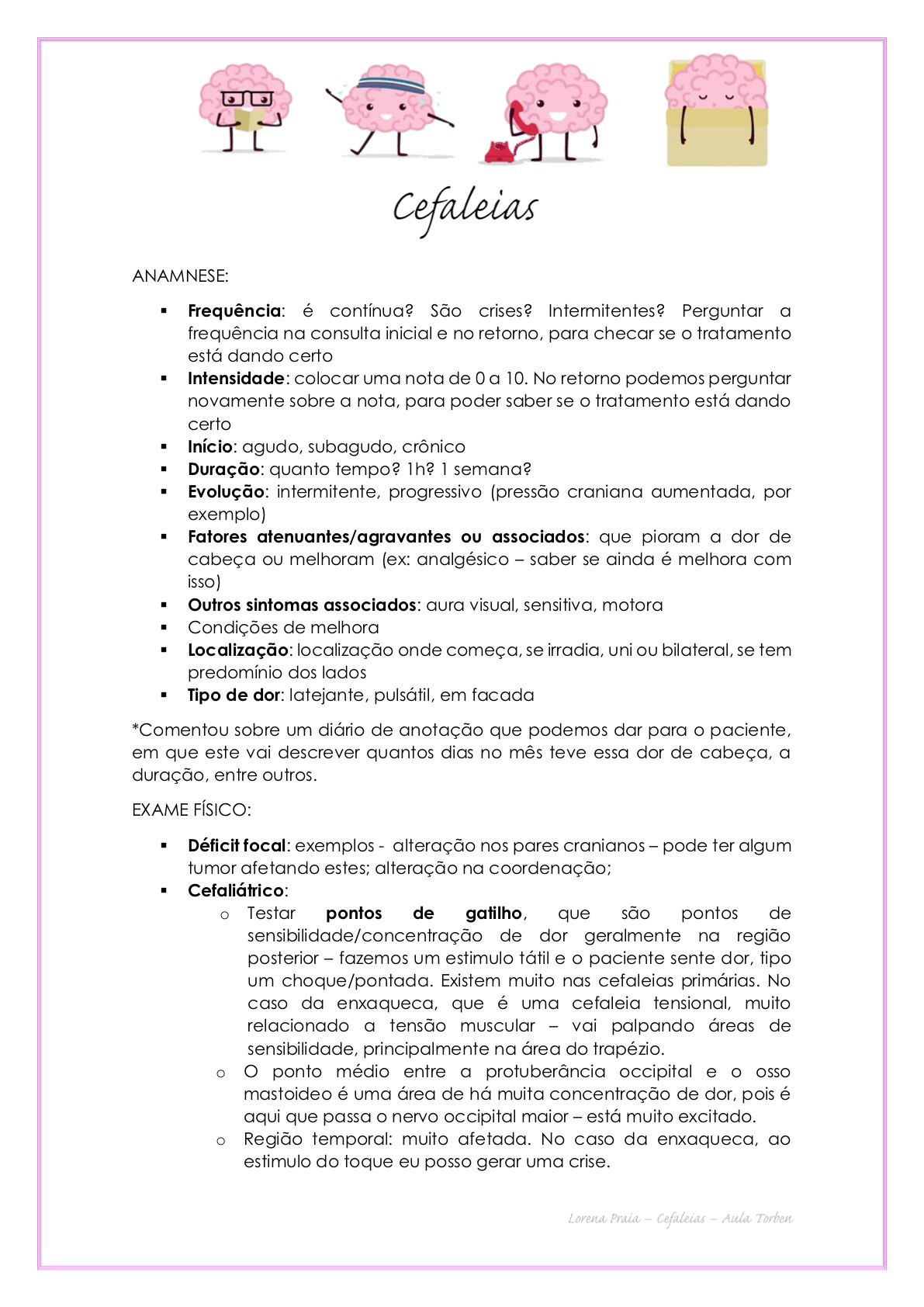 <p>Cefaleias ANAMNESE: Frequência: é contínua? São crises? Intermitentes? Perguntar a frequência na consulta inicial e no retorno, para checar se tratamento está dando certo Intensidade: colocar uma nota de 0 a 10. No retorno podemos perguntar novamente sobre a nota, para poder saber se tratamento está dando certo Início: agudo, subagudo, crônico Duração: quanto tempo? 1h? 1 semana? Evolução: intermitente, progressivo (pressão craniana aumentada, por exemplo) Fatores atenuantes/agravantes associados: que pioram a dor de cabeça ou melhoram (ex: analgésico - saber se ainda é melhora com isso) Outros sintomas associados: aura visual, sensitiva, motora Condições de melhora Localização: localização onde começa, se irradia, uni ou bilateral, se tem predomínio dos lados Tipo de dor: latejante, pulsátil, em facada *Comentou sobre um diário de anotação que podemos dar para paciente, em que este vai descrever quantos dias no mês teve essa dor de cabeça, a duração, entre outros. EXAME Déficit focal: exemplos alteração nos pares cranianos - pode ter algum tumor afetando estes; alteração na coordenação; Cefaliátrico: Testar pontos de gatilho, que são pontos de de dor geralmente na região posterior - fazemos um estimulo tátil e paciente sente dor, tipo um choque/pontada. Existem muito nas primárias. No caso da enxaqueca, que é uma cefaleia tensional, muito relacionado a tensão muscular - vai palpando áreas de sensibilidade, principalmente na área do trapézio. ponto médio entre a protuberância occipital e OSSO é uma área de há muita concentração de dor, pois é aqui que passa nervo occipital maior - está muito excitado. Região temporal: muito afetada. No caso da enxaqueca, ao estimulo do toque eu posso gerar uma crise. Lorena Praia Aula Torben</p><p>Região mais comum: occipital. Pesquisar causas secundárias, como a arterite temporal > 50 anos. Pode ser apresentada com nodulações em decorrência do processo inflamatório granulomatoso, então é importante palpar e checar se há nodulações. Na suspeita, podemos fazer prednisona. Articulação ATM - avaliar, pois a dor nesse local pode irradian (no caso de uma disfunção da ATM) e gerar uma cefaleia. Piora quando mastiga ou tem uma abertura mais ampla da ATM. Neuralgia do trigêmeo - fazer diagnóstico diferencial. É um "choque" que tem na face, até espasmos as vezes. CLASSIFICAÇÃO Segundo a etiologia: Cefaléias primárias: disfunções do sistema nervoso em si, como a enxaqueca (mais comum) Cefaléias secundárias: secundária a alguma coisa, como uma hemorragia ou processo infeccioso. Tende a ter um pior prognostico, pode deixar sequelas, tratamento mais prolongado Segundo a instalação da dor: Cefaléias explosivas Cefaléias agudas Cefaléias subagudas crônicas Recidivantes/persistente CEFALÉIAS PRIMÁRIAS: Mais de 200 tipos, mas vamos estudar as mais comuns Enxaqueca: 90% dos casos. Lembrar que dor de cabeça não é a mesma coisa que enxaqueca, visto que enxaqueco é uma doença neurológica, no qual a principal manifestação é a dor de cabeça Episódica ou crônica Com aura ou sem aura tipo tensional Episódica ou crônica Cefaléias em salvas e outras cefalalgias trigemino-autonômicas (lacrimejamento, hiperemia conjuntival) diversas não associadas a lesão estrutural (idiopática após facadas, por estímulo frio - como tomando sorvete, da atividade sexual) ENXAQUECA Doença crônica subdiagnosticada ou quanto diagnosticada, não são tratadas de forma correta -> evolução crônica; Lorena Praia Aula Torben</p><p>FASES FASE 1 - PRÓDROMO: geralmente é de difícil reconhecimento Constipação Dificuldade de se concentrar Fadiga Bocejos constantes Aumento da sede FASE 2 AURA "Como se fosse um aviso que a crise vai vir" Pode durar de 5 a 60 minutos. Aura prolongada deve ser investigada com exame de imagem; Visual: mais comum. Enxergar formas, pontos de claridade escotomas ou raios de luz; ou "mosquinhas pretas" escotomas negativos. Fazer Dxd com alterações oftalmológicas - perguntar se tem somente nas crises. Perda de visão: amaurose. Paciente pode até ter sincope Sensações de agulhadas ou formigamento nos braços ou pernas Sensação de "dormência" na face Aura motora: pode ser uma paresia. Paciente pode apresentar uma hemiparesia e achar que está com AVC, entrando no diagnostico diferencial. Existe uma chamada enxaqueca hemiplégica - paciente tem crise de enxaqueca e está manifestando hemiplegia súbita, posso ter uma recuperação prévia ou pode demorar um pouco mais. Geralmente há uma história de hemiplegia não identificada em exames -> descartar infarto/alterações vasculares no exame de imagem (AIT). Se está muito na dúvida, podemos fazer um AAS. Exames de imagem para dxd: doppler transcraniano - investiga a circulação anterior e posterior. "Teste da - usado também para diferenciar essas situações. FASE 3 CRISE DE ENXAQUECA Dor latejante e pulsante geralmente de um lado, mas pode ocorrer em ambos os lados da cabeça Pode ser incapacitante, e pode até que in para pronto socorro Sensibilidade a luz, sons (fonofotofobia): pode ter que ficar 100% no escuro, 0 barulho. Comentou que uma medida interessante é pedir para paciente comprimir as artérias temporais, pois diminui a pulsação. Além disso, pode-se utilizar gelo na cabeça; Piora com atividade física Confusão Tontura: existe a enxaqueca vertiginosa, em que paciente pode apresentar um quadro de vertigem associado a enxaqueca Náusea/vomito Visão turva Lorena Praia Aula</p><p>FASE 4 - PÓSDROMO Fadiga, dor no corpo Diminuição da capacidade cognitiva ENXAQUECA SEM AURA Os critérios servem para fechar critério, saber se é secundário, entre outros. A Pelo menos 5 Ataques/crises que preenchem os critérios B e D; B Cefaléia que dura de 4 a 72 horas (sem tratamento ou tratamento ineficaz) - se passou de 3 dias, posso ter estado enxaquecoso, necessitando de exames de imagem; - Cefal