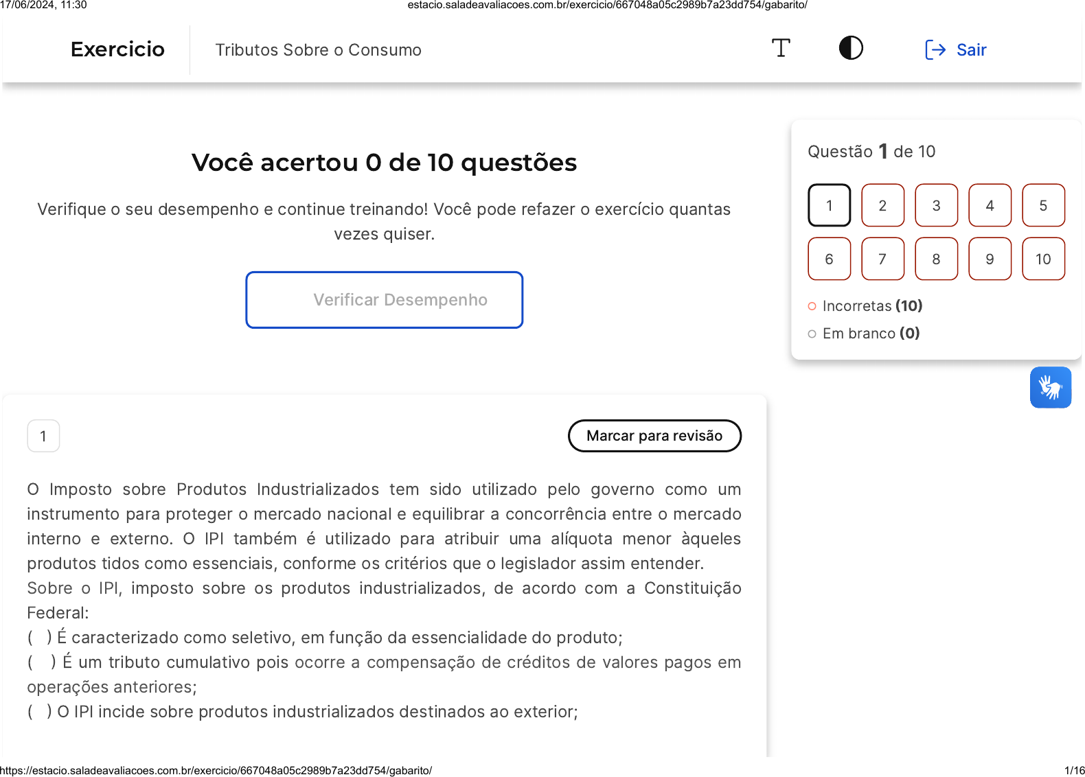 <p>Você acertou 0 de 10 questões</p><p>Verifique o seu desempenho e continue treinando! Você pode refazer o exercício quantas</p><p>vezes quiser.</p><p>Verificar Desempenho</p><p>1 Marcar para revisão</p><p>O Imposto sobre Produtos Industrializados tem sido utilizado pelo governo como um</p><p>instrumento para proteger o mercado nacional e equilibrar a concorrência entre o mercado</p><p>interno e externo. O IPI também é utilizado para atribuir uma alíquota menor àqueles</p><p>produtos tidos como essenciais, conforme os critérios que o legislador assim entender.</p><p>Sobre o IPI, imposto sobre os produtos industrializados, de acordo com a Constituição</p><p>Federal:</p><p>( � É caracterizado como seletivo, em função da essencialidade do produto;</p><p>( � É um tributo cumulativo pois ocorre a compensação de créditos de valores pagos em</p><p>operações anteriores;</p><p>( � O IPI incide sobre produtos industrializados destinados ao exterior;</p><p>Questão 1 de 10</p><p>Incorretas �10�</p><p>Em branco �0�</p><p>1 2 3 4 5</p><p>6 7 8 9 10</p><p>Exercicio Tributos Sobre o Consumo Sair</p><p>17/06/2024, 11:30 estacio.saladeavaliacoes.com.br/exercicio/667048a05c2989b7a23dd754/gabarito/</p><p>https://estacio.saladeavaliacoes.com.br/exercicio/667048a05c2989b7a23dd754/gabarito/ 1/16</p><p>A</p><p>B</p><p>C</p><p>D</p><p>E</p><p>( � O ICMS �Imposto sobre Circulação de Mercadorias e Serviços) está incluído na base de</p><p>cálculo do IPI.</p><p>Julgue os itens acima em verdadeiro �V� ou falso �F� e, em seguida, assinale a alternativa</p><p>contendo a ordem correta das respostas, de cima para baixo.</p><p>V � V � V � F.</p><p>V � V � F � F.</p><p>F � F � V � V.</p><p>V � F � V � V.</p><p>V � F � F � V.</p><p>Resposta incorreta</p><p>Opa! A alternativa correta é a letra E. Confira o gabarito comentado!</p><p>Gabarito Comentado</p><p>O IPI é caracterizado como seletivo, em função da essencialidade do produto, ou seja,</p><p>produtos considerados essenciais possuem uma alíquota menor. No entanto, o IPI não</p><p>é um tributo cumulativo, pois ocorre a compensação de créditos de valores pagos em</p><p>17/06/2024, 11:30 estacio.saladeavaliacoes.com.br/exercicio/667048a05c2989b7a23dd754/gabarito/</p><p>https://estacio.saladeavaliacoes.com.br/exercicio/667048a05c2989b7a23dd754/gabarito/ 2/16</p><p>A</p><p>B</p><p>operações anteriores, o que significa que o imposto pago em uma etapa de produção</p><p>pode ser compensado na etapa seguinte. Além disso, o IPI não incide sobre produtos</p><p>industrializados destinados ao exterior, ou seja, as exportações são isentas deste</p><p>imposto. Por fim, o ICMS �Imposto sobre Circulação de Mercadorias e Serviços) não</p><p>está incluído na base de cálculo do IPI. Portanto, a sequência correta é V �Verdadeiro)</p><p>� F �Falso) � F �Falso) � V �Verdadeiro).</p><p>2 Marcar para revisão</p><p>O Imposto sobre operações relativas à circulação de mercadorias e sobre prestações de</p><p>serviços de transporte interestadual e intermunicipal e de comunicação � ICMS é</p><p>reconhecido como o tributo com maior arrecadação do Brasil. Quanto ao ICMS, é correto</p><p>afirmar:</p><p>O imposto incidirá sobre o valor total da operação, quando mercadorias forem</p><p>fornecidas com serviços não compreendidos na competência tributária dos</p><p>Municípios.</p><p>A Difal é o resultado da soma entre as alíquotas interna e interestadual de ICMS,</p><p>incidente nas operações interestaduais de bens ou serviços destinados à</p><p>consumidor final, contribuinte ou não do ICMS.</p><p>17/06/2024, 11:30 estacio.saladeavaliacoes.com.br/exercicio/667048a05c2989b7a23dd754/gabarito/</p><p>https://estacio.saladeavaliacoes.com.br/exercicio/667048a05c2989b7a23dd754/gabarito/ 3/16</p><p>C</p><p>D</p><p>E</p><p>Compete aos municípios e ao distrito federal fixar as alíquotas do ICMS nas</p><p>operações interestaduais e, também regular as alíquotas mínimas e do tributo.</p><p>O ICMS incide sobre transportes de passageiros de ônibus urbanos.</p><p>O ICMS é um imposto por fora, isso significa que a alíquota incide sobre o preço</p><p>do bem ou serviço, mas que integra o próprio preço.</p><p>Resposta incorreta</p><p>Opa! A alternativa correta é a letra A. Confira o gabarito comentado!</p><p>Gabarito Comentado</p><p>O ICMS incide nos termos do art. 155, § 2º , IX , b da CF , o ICMS incidirá sobre o valor</p><p>total da operação quando as mercadorias forem fornecidas com serviços não</p><p>compreendidos na competência tributária dos Municípios.</p><p>3 Marcar para revisão</p><p>O Imposto sobre Produtos Industrializados �IPI� é um tributo de competência federal que</p><p>incide sobre os produtos da indústria nacional ou na importação de produtos estrangeiros</p><p>17/06/2024, 11:30 estacio.saladeavaliacoes.com.br/exercicio/667048a05c2989b7a23dd754/gabarito/</p><p>https://estacio.saladeavaliacoes.com.br/exercicio/667048a05c2989b7a23dd754/gabarito/ 4/16</p><p>A</p><p>B</p><p>C</p><p>D</p><p>E</p><p>no desembaraço aduaneiro. Considere as afirmações sobre o Imposto sobre Produtos</p><p>Industrializados:</p><p>I� O IPI é um tributo não cumulativo, ou seja, ocorre a compensação de créditos de valores</p><p>pagos em operações anteriores.</p><p>II� O IPI adota alíquotas inversamente proporcionais à essencialidade do produto com o</p><p>objetivo de atender ao Princípio Constitucional da Capacidade Contributiva.</p><p>II� O Imposto sobre Produtos Industrializados tem como único fato gerador a sua saída de</p><p>produtos industrializados dos estabelecimentos industriais ou equiparados.</p><p>V� A base de cálculo no IPI, nas operações internas (ocorridas dentro do país) é o valor da</p><p>operação pela qual a mercadoria deixa o estabelecimento do industrial ou do</p><p>comerciante a ele equiparado.</p><