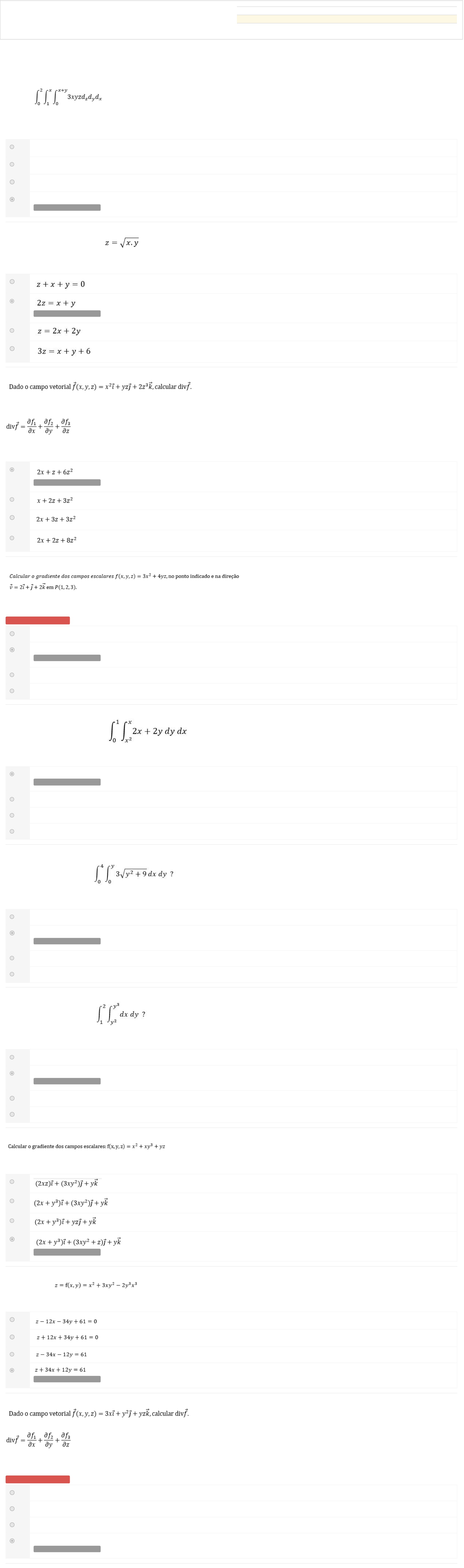 <p>Voltar</p><p>JUAN CUNHA</p><p>RU: 614094Avisos </p><p>CURSO: BACHARELADO EM ENGENHARIA DE PRODUÇÃO - DISTÂNCIA</p><p>AVALIAÇÃO » NOVO</p><p>Gabarito completo disponível somente após prazo final da avaliação ou quando esgotar todas as tentativas.</p><p>Atenção. Este gabarito é para uso exclusivo do aluno e não deve ser publicado ou compartilhado em redes sociais ou grupo de mensagens.</p><p>O seu compartilhamento infringe as políticas do Centro Universitário UNINTER e poderá implicar sanções disciplinares, com possibilidade de desligamento do quadro de alunos do Centro Universitário, bem como responder</p><p>ações judiciais no âmbito cível e criminal.</p><p> ××</p><p>PROTOCOLO: 202408306140947195CE6 JUAN PABLO CHIARATO CUNHA - RU: 614094 Nota: 80</p><p>Disciplina(s):</p><p>Cálculo Diferencial e Integral a Várias Variáveis</p><p>Data de início: 30/08/2024 18:19</p><p>Prazo máximo entrega: -</p><p>Data de entrega: 30/08/2024 19:03</p><p>Questão 1/10 - Cálculo Diferencial e Integral a Várias Variáveis</p><p>Calculando obtém-se:</p><p>A 427/60</p><p>B 1854/75</p><p>C 2157/60</p><p>D 195/12</p><p>Você assinalou essa alternativa (D)</p><p>Questão 2/10 - Cálculo Diferencial e Integral a Várias Variáveis</p><p>Calcular o plano tangente à superfície no ponto P( 2; 2; 2 )</p><p>A .</p><p>B .</p><p>Você assinalou essa alternativa (B)</p><p>C .</p><p>D .</p><p>Questão 3/10 - Cálculo Diferencial e Integral a Várias Variáveis</p><p>.</p><p>Fórmula:</p><p>A</p><p>Você assinalou essa alternativa (A)</p><p>B</p><p>C</p><p>D</p><p>Questão 4/10 - Cálculo Diferencial e Integral a Várias Variáveis</p><p>.</p><p>Você não pontuou essa questão</p><p>A 21,11</p><p>B 33,33</p><p>Você assinalou essa alternativa (B)</p><p>C 15,55</p><p>D 13,33</p><p>Questão 5/10 - Cálculo Diferencial e Integral a Várias Variáveis</p><p>Calculando a integral a seguir, obtém-se:</p><p>A 3/10</p><p>Você assinalou essa alternativa (A)</p><p>B 3/5</p><p>C 7/20</p><p>D -7/20</p><p>Questão 6/10 - Cálculo Diferencial e Integral a Várias Variáveis</p><p>Qual valor obtém-se para a integral :</p><p>A 125</p><p>B 98</p><p>Você assinalou essa alternativa (B)</p><p>C 89</p><p>D 102</p><p>Questão 7/10 - Cálculo Diferencial e Integral a Várias Variáveis</p><p>Qual o resultado obtido a integração</p><p>A 19/4</p><p>B 17/12</p><p>Você assinalou essa alternativa (B)</p><p>C 19/6</p><p>D 19/12</p><p>Questão 8/10 - Cálculo Diferencial e Integral a Várias Variáveis</p><p>.</p><p>A</p><p>B</p><p>C</p><p>D</p><p>Você assinalou essa alternativa (D)</p><p>Questão 9/10 - Cálculo Diferencial e Integral a Várias Variáveis</p><p>Considere a função . Determine a equação do plano tangente à superfície no ponto P (1, 2, 3).</p><p>A</p><p>B</p><p>C</p><p>D</p><p>Você assinalou essa alternativa (D)</p><p>Questão 10/10 - Cálculo Diferencial e Integral a Várias Variáveis</p><p>.</p><p>Fórmula:</p><p>Você não pontuou essa questão</p><p>A 3y + 5</p><p>B 3y + 3</p><p>C 5y + 6</p><p>D 4y + 2</p><p>Você assinalou essa alternativa (D)</p><p></p><p>Roteiro de Estudo</p><p></p><p>Avaliações</p><p></p><p>Trabalhos</p><p></p><p>Livro da Disciplina</p><p></p><p>Central de Vídeos</p><p></p><p>Aula Ao Vivo</p><p></p><p>Tutoria</p><p></p><p>Fórum</p><p></p><p>Chat</p><p></p><p>Avisos</p><p>CÁLCULO DIFERENCIAL E INTEGRAL</p><p>A VÁRIAS VARIÁVEIS</p><p>1</p><p>javascript: void(0)</p><p>http://www.uninter.com/</p>
