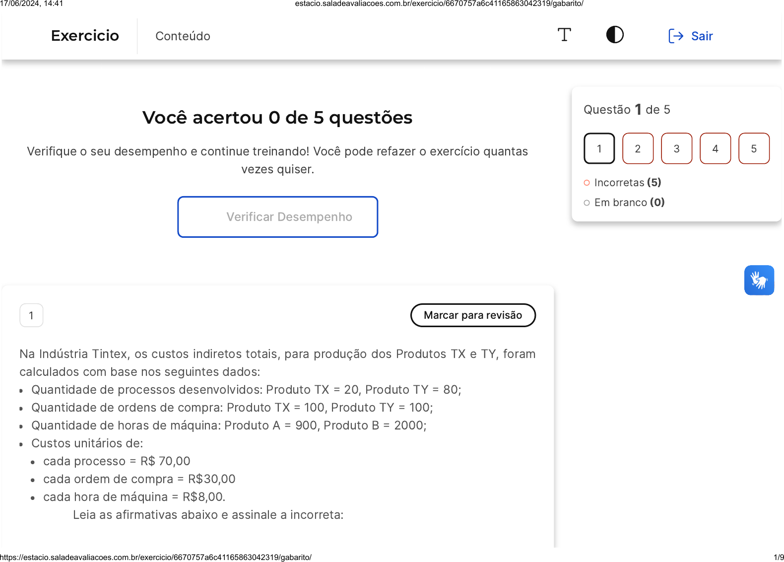 <p>Você acertou 0 de 5 questões</p><p>Verifique o seu desempenho e continue treinando! Você pode refazer o exercício quantas</p><p>vezes quiser.</p><p>Verificar Desempenho</p><p>1 Marcar para revisão</p><p>Na Indústria Tintex, os custos indiretos totais, para produção dos Produtos TX e TY, foram</p><p>calculados com base nos seguintes dados:</p><p>Quantidade de processos desenvolvidos: Produto TX � 20, Produto TY � 80;</p><p>Quantidade de ordens de compra: Produto TX � 100, Produto TY � 100;</p><p>Quantidade de horas de máquina: Produto A � 900, Produto B � 2000;</p><p>Custos unitários de:</p><p>cada processo � R$ 70,00</p><p>cada ordem de compra � R$30,00</p><p>cada hora de máquina � R$8,00.</p><p>Leia as afirmativas abaixo e assinale a incorreta:</p><p>Questão 1 de 5</p><p>Incorretas �5�</p><p>Em branco �0�</p><p>1 2 3 4 5</p><p>Exercicio Conteúdo Sair</p><p>17/06/2024, 14:41 estacio.saladeavaliacoes.com.br/exercicio/6670757a6c41165863042319/gabarito/</p><p>https://estacio.saladeavaliacoes.com.br/exercicio/6670757a6c41165863042319/gabarito/ 1/9</p><p>A</p><p>B</p><p>C</p><p>D</p><p>E</p><p>O Método a ser utilizado para rateio dos custos indiretos é o de custeio por</p><p>atividades, ou método ABC, porque a informação dada são as quantidades</p><p>consumidas pelos direcionadores de custos e quanto cada produto consumiu</p><p>dessas atividades.</p><p>O custo a ser apropriado ao produto TX é 11600,00.</p><p>O custo a ser apropriado ao Produto TY é 24600,00.</p><p>O custo com horas de máquina para produzir todos os produtos TX é 7200,00.</p><p>Não é possível realizar o rateio dos custos indiretos pelo Método ABC porque</p><p>faltam dados para os cálculos.</p><p>Resposta incorreta</p><p>Opa! A alternativa correta é a letra E. Confira o gabarito comentado!</p><p>Gabarito Comentado</p><p>A alternativa incorreta é a E pois o Método ABC é o indicado, por serem fornecidas as</p><p>quantidades consumidas pelos direcionadores de custos e quanto cada produto</p><p>consumiu dessas atividades. Estão, portanto, corretas as letras: A, B (custo TX�</p><p>17/06/2024, 14:41 estacio.saladeavaliacoes.com.br/exercicio/6670757a6c41165863042319/gabarito/</p><p>https://estacio.saladeavaliacoes.com.br/exercicio/6670757a6c41165863042319/gabarito/ 2/9</p><p>A</p><p>B</p><p>C</p><p>1400�3000�7200�, C (custo TY�5600�3000�16000� e D �Custo Horas de Máq TX� 8</p><p>x 900�.</p><p>2 Marcar para revisão</p><p>Marque a alternativa que apresenta afirmação INCORRETA relacionada ao Método de</p><p>Custeio por Absorção:</p><p>Atende às normas da contabilidade financeira. Tem como regra que os produtos</p><p>absorvem todos os custos, sem necessidade de separação contábil em custos</p><p>fixos ou custos variáveis.</p><p>Os custos dos produtos são contabilizados em uma conta de estoque e são</p><p>apresentados no demonstrativo de resultados quando são vendidos.</p><p>As despesas são lançadas diretamente no Resultado do período.</p><p>17/06/2024, 14:41 estacio.saladeavaliacoes.com.br/exercicio/6670757a6c41165863042319/gabarito/</p><p>https://estacio.saladeavaliacoes.com.br/exercicio/6670757a6c41165863042319/gabarito/ 3/9</p><p>D</p><p>E</p><p>Esse método atende ao princípio da confrontação da receita e do regime contábil</p><p>de competência, estabelecido pela contabilidade.</p><p>Os gastos fixos, tanto custos quanto despesas, são apresentados diretamente no</p><p>resultado, de forma independente ao evento da venda do produto.</p><p>Resposta incorreta</p><p>Opa! A alternativa correta é a letra E. Confira o gabarito comentado!</p><p>Gabarito Comentado</p><p>Os gastos fixos, tanto custos quanto despesas, são apresentados diretamente no</p><p>resultado, de forma independente ao evento da venda do produto - esta afirmativa</p><p>configura o Método de Custeio Variável.</p><p>3 Marcar para revisão</p><p>Marque a alternativa que apresenta afirmativa INCORRETA relacionada aos relacionada aos</p><p>Métodos de Rateio dos custos indiretos:</p><p>17/06/2024, 14:41 estacio.saladeavaliacoes.com.br/exercicio/6670757a6c41165863042319/gabarito/</p><p>https://estacio.saladeavaliacoes.com.br/exercicio/6670757a6c41165863042319/gabarito/ 4/9</p><p>A</p><p>B</p><p>C</p><p>D</p><p>E</p><p>ABC �Activity Based Costing) é um método que reconhece o relacionamento</p><p>causal dos direcionadores de custos para custear atividades, através da</p><p>mensuração do custo e do desempenho do processo relativo às atividades e aos</p><p>objetos de custos (produtos e serviços).</p><p>No Método ABC, os custos são atribuídos às atividades com base no uso dos</p><p>recursos para posterior atribuição ao objeto de custo, por meio de seus</p><p>direcionadores de custos.</p><p>Diferentemente dos critérios tradicionais, no que tange à alocação de custos aos</p><p>seus objetos, o ABC tem como foco os recursos alocados às atividades e estas</p><p>como consumidoras de custos, enquanto as sistemáticas tradicionais focalizam os</p><p>produtos como geradores de custos.</p><p>O método de rateio dos custos indiretos com departamentalização identifica os</p><p>departamentos produtivos dos departamentos de apoio. Os departamentos</p><p>auxiliares transferem seus custos para os departamentos para os quais prestaram</p><p>serviços e não para os produtos.</p><p>Na departamentalização dos custos indiretos não é possível apropriar aos</p><p>produtos somente os custos indiretos dos departamentos que tiveram atividades</p><p>executadas para eles.</p><p>17/06/2024, 14:41 estacio.saladeavaliacoes.com.br/exercicio/6670757a6c41165863042319/gabarito/</p><p>https://estacio.saladeavaliacoes.com.br/exercicio/6670757a6c41165863042319/gabarito/ 5/9</p><p>A</p><p>B</p><p>Resposta incorreta</p><p>Opa! A alternativa correta é a letra E. Confira o gabarito comentado!</p><p>Gabarito Comentado</p><p>A alternativa incorreta é a E pois a departamentalização dos cus