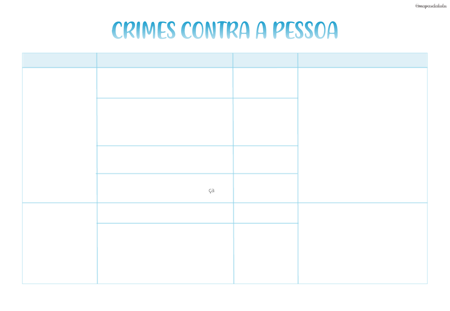 <p>TIPO PENAL CONDUTA PENA OBSERVAÇÕES IMPORTANTES</p><p>Homicídio simples</p><p>Matar alguém</p><p>Reclusão</p><p>(6 a 20 anos)</p><p>e multa</p><p>Crime material</p><p>Crime comum</p><p>Se o agente comete o crime:</p><p>• Impelido por motivo de relevante valor social</p><p>ou moral</p><p>• Sob domínio de violenta emoção, logo em</p><p>seguida a injusta provocação da vítima</p><p>O juiz pode reduzir a</p><p>pena de 1/6 a 1/3</p><p>Se praticado contra:</p><p>• < 14 anos</p><p>• > 60 anos</p><p>Aumentada de 1/3</p><p>Se praticado por:</p><p>• Milícia privada</p><p>• Grupo de extermínio</p><p>Sob pretexto de prestação</p><p>de serviço de segurança( ) Aumentada de 1/3</p><p>até a metade</p><p>Homicídio culposo</p><p>Se culposo</p><p>Detenção</p><p>(1 a 3 anos)</p><p>Se culposo e:</p><p>• Resulta da inobservância de regra técnica de</p><p>profissão, arte ou ofício</p><p>• O agente deixa de prestar imediato socorro à</p><p>vítima</p><p>• Foge para evitar prisão em flagrante</p><p>Aumentada de 1/3</p><p>O juiz pode deixar de aplicar a pena se as</p><p>consequências da infração atingirem o próprio</p><p>agente de forma tão grave que a sanção penal</p><p>seja desnecessária</p><p>crimes contra a pessoa</p><p>TIPO PENAL CONDUTA PENA OBSERVAÇÕES IMPORTANTES</p><p>Homicídio qualificado</p><p>Homicídio cometido:</p><p>Reclusão</p><p>(12 a 30 anos)</p><p>• Mediante paga ou promessa de recompensa,</p><p>ou motivo torpe</p><p>• Por motivo fútil</p><p>• Com emprego de veneno, fogo, explosivo,</p><p>asfixia, tortura ou meio insidioso ou cruel, ou</p><p>que possa resultar perigo comum</p><p>• À traição, de emboscada ou dissimulação</p><p>• Para assegurar a execução, ocultação,</p><p>impunidade ou vantagem de outro crime</p><p>• Contra autoridade ou agente do Sistema</p><p>Prisional e da Força Nacional de Segurança</p><p>Pública</p><p>Feminicídio</p><p>Homicídio praticado contra a mulher por razões</p><p>da condição do sexo feminino</p><p>Reclusão</p><p>(12 a 30 anos)</p><p>Se praticado:</p><p>• Durante a gestação ou ≤ 3 meses após o parto</p><p>• Contra pessoa:</p><p>• < 14 anos Aumentada de 1/3</p><p>até a metade</p><p>Há “razões da condição do sexo feminino”</p><p>quando o crime envolve:</p><p>• Violência doméstica e familiar</p><p>• Menosprezo/discriminação à condição de</p><p>mulher</p><p>• > 60 anos • C/ deficiência</p><p>• Portadora de doenças degenerativas</p><p>• Na presença física ou virtual de descendente/</p><p>ascendente</p><p>• Em descumprimento de medidas protetivas de</p><p>urgência</p><p>crimes contra a pessoa</p><p>TIPO PENAL CONDUTA PENA OBSERVAÇÕES IMPORTANTES</p><p>Induzimento, instigação</p><p>ou auxílio a suicídio ou a</p><p>automutilação</p><p>Induzir ou instigar alguém a suicidar-se ou a</p><p>praticar automutilação, ou prestar-lhe auxílio</p><p>material para que o faça</p><p>Reclusão</p><p>(6 meses a 2 anos) Se contra < 14 anos ou quem não tem</p><p>discernimento ou não pode oferecer</p><p>resistência: o agente responderá por</p><p>homicídio</p><p>Se o suicídio se consuma ou a automutilação</p><p>resulta em morte</p><p>Reclusão</p><p>(2 a 6 anos)</p><p>Se praticado por motivo egoístico, torpe ou fútil.</p><p>Se a vítima é menor, ou tem diminuída a</p><p>capacidade de resistência</p><p>É duplicada</p><p>Se realizada pela rede de computadores, por</p><p>rede social ou transmitida em tempo real</p><p>Aumentada</p><p>até o dobro</p><p>Infanticídio</p><p>Matar, sob o estado puerperal, o próprio filho,</p><p>durante o parto ou logo após.</p><p>Detenção</p><p>(2 a 6 anos)</p><p>Provocar aborto em si mesma ou consentir que</p><p>outrem o provoque</p><p>Detenção</p><p>(1 a 3 anos)</p><p>Não se pune se praticado por médico:</p><p>• Se não há outro meio de salvar a vida da</p><p>gestante</p><p>• Se a gravidez resulta de estupro</p><p>)Lei 13.964/2019(</p><p>Se da tentativa ou da automutilação resulta lesão</p><p>corporal de natureza grave/gravíssima</p><p>Reclusão</p><p>(1 a 3 anos)</p><p>Se contra < 14 anos ou quem não tem</p><p>discernimento ou não pode oferecer</p><p>resistência: o agente responderá pelo art.</p><p>129, §2º</p><p>Se o agente é líder ou coordenador de grupo ou</p><p>rede social</p><p>Aumentada</p><p>em metade</p><p>Crime próprio</p><p>Terceiro pode cometê-lo em concurso de</p><p>pessoas com a mãe</p><p>Não admite forma culposa</p><p>)Pela mãe(</p><p>Seria homicídio</p><p>culposo( )</p><p>Aborto</p><p>Pela gestante ou com</p><p>seu consentimento( )</p><p>crimes contra a pessoa</p><p>TIPO PENAL CONDUTA PENA OBSERVAÇÕES IMPORTANTES</p><p>Aborto</p><p>Sem o consentimento da gestante ou</p><p>Com o consentimento da gestante se:</p><p>Reclusão</p><p>(3 a 10 anos)</p><p>Se em consequência a gestante sofre lesão</p><p>corporal grave, a pena é aumentada de 1/3.</p><p>Se em consequência a gestante falece, a pena</p><p>é duplicada</p><p>• Gestante ≤ 14 anos ou alienada/débil mental</p><p>• Consentimento obtido mediante fraude, grave</p><p>ameaça ou violência</p><p>Lesão corporal</p><p>Ofender a integridade corporal ou a saúde de</p><p>outrem</p><p>Detenção</p><p>(3 meses a 1 ano)</p><p>Resulta em morte + circunstâncias que indicam</p><p>que o agente: Reclusão</p><p>(4 a 12 anos)</p><p>)Por terceiro(</p><p>Com o consentimento da gestante</p><p>Reclusão</p><p>(1 a 4 anos)</p><p>Lesão corporal seguida</p><p>de morte</p><p>Lesão corporal de</p><p>natureza grave</p><p>Se resulta:</p><p>• Incapacidade > 30 dias p/ ocupações habituais</p><p>• Perigo de vida</p><p>• Debilidade permanente de membro, sentido</p><p>ou função • Aceleração de parto</p><p>Reclusão</p><p>(1 a 5 anos)</p><p>Se resulta:</p><p>• Incapacidade permanente para o trabalho</p><p>• Enfermidade incurável</p><p>• Perda ou inutilização de membro, sentido ou</p><p>função</p><p>•
