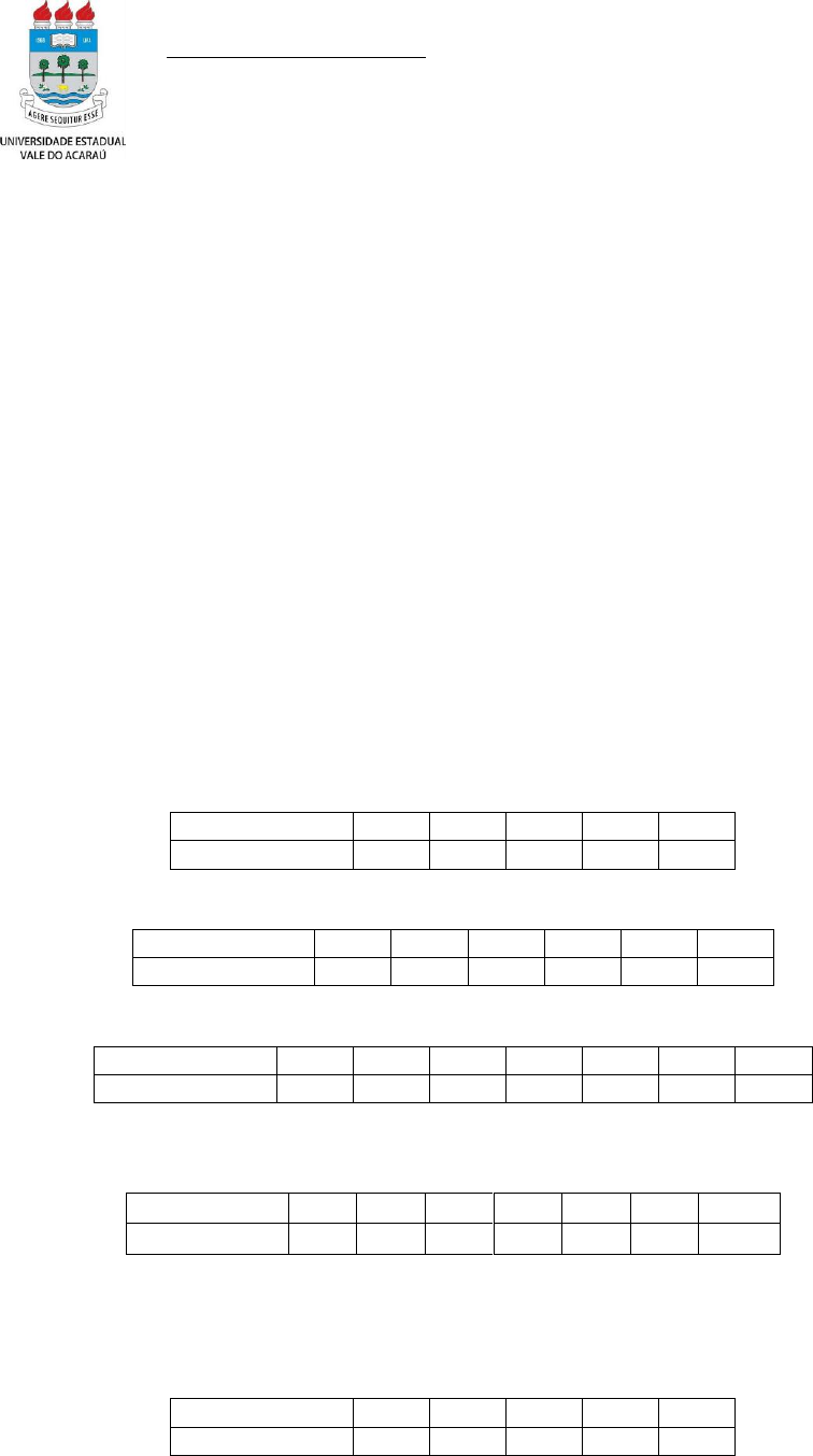 <p>Universidade Estadual Vale do Acaraú</p><p>Prof. Leandro Mendonça</p><p>1º Lista de exercícios de Físico Química Experimental 1.</p><p>Aluno(a): ______________________________________________________________</p><p>* Esta lista de exercícios é uma cortesia e apenas um material para fixação dos</p><p>conteúdos abordados em sala de aula, não sendo obrigado o professor a colocar</p><p>questões desta em suas avaliações.</p><p>* Esta lista pode não conter todos os detalhes de todos os assuntos abordados em</p><p>sala, para tal, faz-se necessário que o aluno assista as aulas e estude nos materiais</p><p>indicados.</p><p>* A resolução destes exercícios não substitui o estudo, aprofundamento e resolução</p><p>de exercícios em livros.</p><p>------------------------------------------------ // -- // --------------------------------------------------</p><p>1 – Diga a diferença entre regressão linear e equação de reta.</p><p>2 – Diferencie a variável independente de variável dependente.</p><p>3 – Dê a interpretação geométrica de coeficiente linear.</p><p>4 – Dê a interpretação geométrica de coeficiente angular.</p><p>5 – Comente sobre o que devemos analisar na hora de escolher um método de regressão</p><p>linear.</p><p>6 – Comente como os valores analisados se correlacionam com a escala escolhida.</p><p>7 – Utilizando uma escala de 10 x 10 cm, faça o gráfico referente ao conjunto de dados</p><p>apresentado abaixo:</p><p>X 0,00 0,25 0,50 0,750 1,00</p><p>Y 0,0 4,0 8,0 12,0 16,0</p><p>8 – Utilizando uma escala de 12 x 8 cm (X,Y), faça o gráfico referente ao conjunto de</p><p>dados apresentado abaixo:</p><p>X 0 12 24 36 48 60</p><p>Y 1,6 1,1 0,8 0,6 0,5 0,45</p><p>9 – Utilizando uma escala de 12 x 12 cm (X,Y), faça o gráfico referente ao conjunto de</p><p>dados apresentado abaixo:</p><p>X 0 8 16 32 40 48 64</p><p>Y 12 6 2 0 1 5 15</p><p>10 – Para avaliar a resistência elétrica de um material, uma corrente elétrica foi forçada</p><p>a passar por um filamento e a temperatura observada foi medida. Utilizando uma escala</p><p>de 15 x 15 cm, faça o gráfico referente aos dados apresentados abaixo.</p><p>T (ºC) 44,8 48,4 51,2 59,7 75,1 89,6 110,5</p><p>I (A) 5,0 6,0 7,0 10,0 15,0 20,0 30,0</p><p>11 – Com a finalidade de avaliar a eficiência de uma dieta em bovinos, o responsável técnico</p><p>começou a avaliar a quantidade de proteína nas fezes dos animais utilizando a técnica de</p><p>espectrofotometria. Para isso, ele fez uma “curva analítica” utilizando soluções de concentração</p><p>conhecida. Utilizando uma escala de 15 x 10 cm, faça o gráfico referente aos dados</p><p>apresentados abaixo.</p><p>Absorbância 0,197 0,212 0,228 0,244 0,260</p><p>[proteína] g/ L 0,200 0,400 0,600 0,800 1,000</p><p>12 – Utilizando uma escala de 15 x 15 cm, faça o gráfico referente aos dados</p><p>apresentados abaixo.</p><p>T (min) 0,0 1,0 2,0 3,0 4,0 5,0 6,0 7,0 8,0</p><p>[A] (mol L-1) 1,0 0,6 0,35 0,28 0,24 0,22 0,21 0,2 0,19</p><p>13 – Utilizando o método gráfico, determine a equação de reta dos dados apresentados</p><p>na questão 7.</p><p>14 – Utilizando o método das médias, determine a equação de reta dos dados</p><p>apresentados na questão 8.</p><p>15 – Utilizando o método dos mínimos quadrados, determine a equação de reta dos</p><p>dados apresentados na questão 9.</p><p>16 – Discuta a diferença das equações de reta encontrados na questão 8 quando</p><p>utilizamos diferentes métodos de regressão linear.</p><p>17 – Comente a diferença entre interpolação e extrapolação linear.</p><p>18 – Na questão 7, determine o valor de Y quando X = 4 e quando X = 2,5.</p><p>19 – Na questão 8, utilizando o método da equação de reta, determine o valor de Y</p><p>quando X = 55. Utilizando o método da igualdade de triângulos, determine o valor de Y</p><p>quando X = 18.</p><p>20 – Na questão 9, utilizando o método da equação de reta, determine o valor de X</p><p>quando Y = 0,5. Utilizando o método da igualdade de triângulos, determine o valor de</p><p>X quando Y = 0,05.</p><p>21 – Comente sobre linearidade e por que não utilizamos os dados da questão 10 na</p><p>análise de dados.</p><p>22 – Em que condição a equação de reta deverá ser exatamente igual em todos os</p><p>métodos avaliados?</p><p>23 – Foi realizado um experimento para avaliar a decomposição de uma enzina frente à</p><p>mudança de temperatura do meio. (a) Determine a taxa de desnaturação da enzima (não</p><p>esquecer as unidades) (b) Determine a quantidade inicial da enzima no experimento</p><p>(Temperatura de zero ºC).</p><p>24 – Diferentes composições metálicas foram testadas como catalizadores de automóveis na</p><p>reação 2CO(g) + O2(g) → 2CO2(g), o gráfico abaixo mostra a concentração de CO(g) consumido no</p><p>catalisador em função do tempo de contato com sua superfície. (a) Determine a taxa de</p><p>consumo de CO(g) entre 0 e 2 min e entre 10 e 12 min (b) Analisando o gráfico, em quanto</p><p>tempo a concentração de CO2(g) cai pela metade?</p><p>25 – Com a finalidade de avaliar a eficiência da degradação de corantes em efluentes têxteis,</p><p>um pesquisador utilizou a técnica de espectrofotometria. Para isso, ele fez uma “curva analítica”</p><p>medindo a absorbância de soluções com concentração conhecida. Os resultados obtidos foram:</p><p>Absorbância 0,070 0,171 0,413 0,651 0,794</p><p>[corante] g/ L 0,02 0,71 0,96 1,19 1,34</p><p>(a) Utilizando uma escala de 10 x 10 cm, faça o gráfico referente aos dados apresentados abaixo</p><p>(b) Determine a taxa de variação da absorbância em função da concentração do corante. (não</p><p>esquecer as unidades)</p><p>26 – A dilatação de um material foi estudada analisando como o volume varia em função da</p><p>temperatura, a tabela abaixo apresenta os valores obtidos:</p><p>V / cm3 8,52 9,16 9,65 10,33 10,9