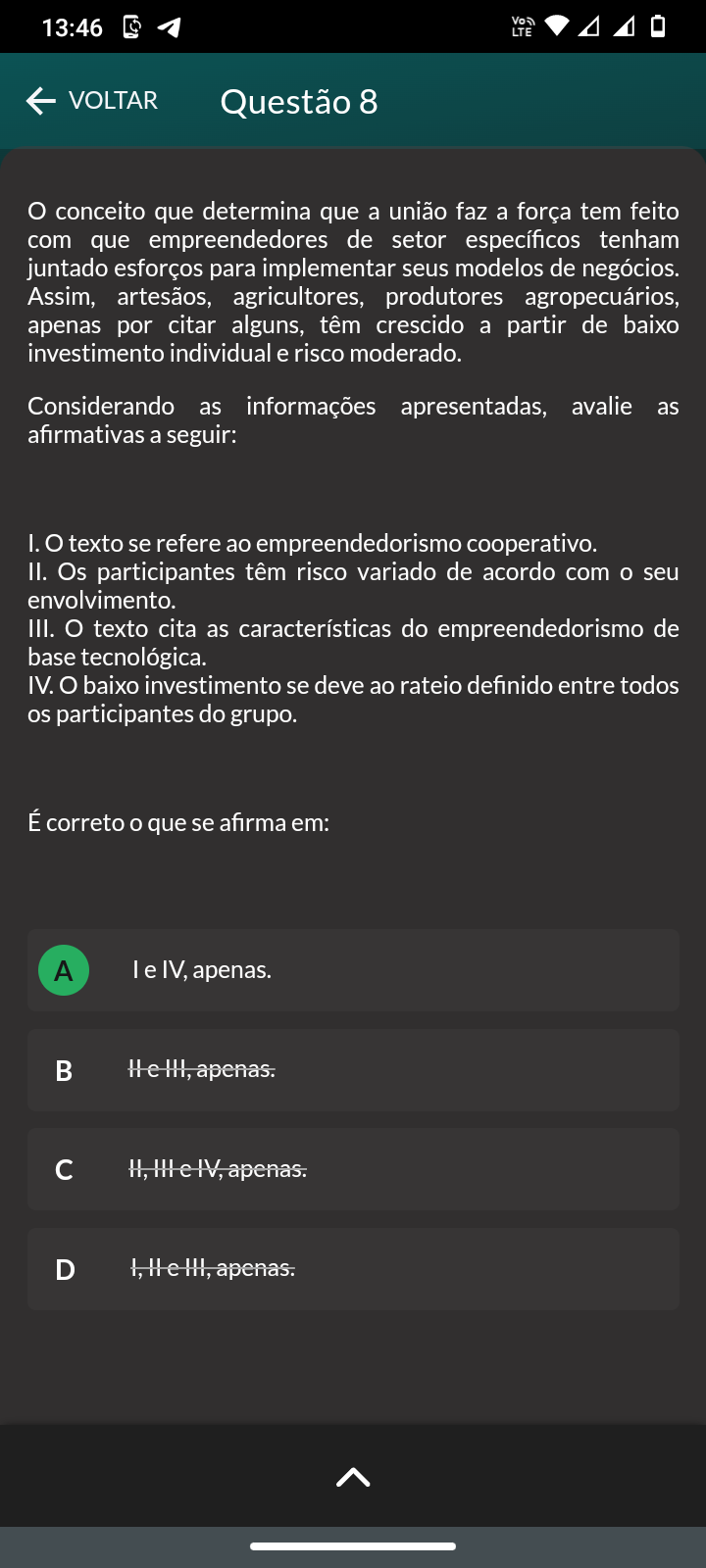 <p>13:46 A LTE VOLTAR Questão 8 O conceito que determina que a união faz a força tem feito com que empreendedores de setor específicos tenham juntado esforços para implementar seus modelos de negócios. Assim, artesãos, agricultores, produtores agropecuários, apenas por citar alguns, têm crescido a partir de baixo investimento individual e risco moderado. Considerando as informações apresentadas, avalie as afirmativas a seguir: I. O texto se refere ao empreendedorismo cooperativo. II. Os participantes têm risco variado de acordo com seu envolvimento. III. O texto cita as características do empreendedorismo de base tecnológica. IV. O baixo investimento se deve ao rateio definido entre todos os participantes do grupo. É correto que se afirma em: A I e IV, apenas. D</p>
