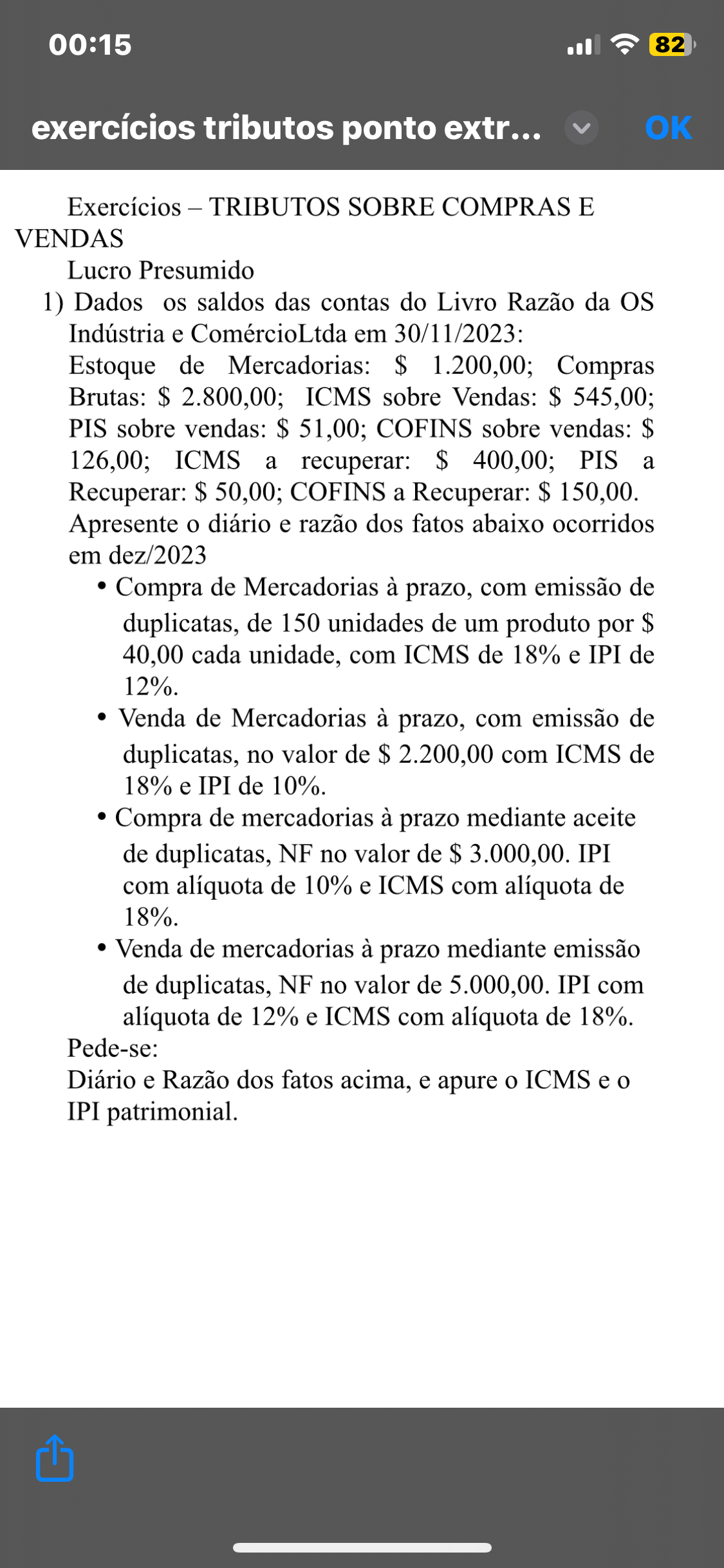 <p>00:15 82 exercícios tributos ponto extr... ... OK Exercícios - TRIBUTOS SOBRE COMPRAS E VENDAS Lucro Presumido 1) Dados os saldos das contas do Livro Razão da os Indústria e ComércioLtda em 30/11/2023: Estoque de Mercadorias: $ 1.200,00; Compras Brutas: $ 2.800,00; ICMS sobre Vendas: $ 545,00; PIS sobre vendas: $ 51,00; COFINS sobre vendas: $ 126,00; ICMS a recuperar: $ 400,00; PIS a Recuperar: $ 50,00; COFINS a Recuperar: $ 150,00. Apresente o diário e razão dos fatos abaixo ocorridos em dez/2023 Compra de Mercadorias à prazo, com emissão de duplicatas, de 150 unidades de um produto por $ 40,00 cada unidade, com ICMS de 18% e IPI de 12%. Venda de Mercadorias à prazo, com emissão de duplicatas, no valor de com ICMS de 18% e IPI de 10%. Compra de mercadorias à prazo mediante aceite de duplicatas, NF no valor de $ 3.000,00. IPI com alíquota de 10% e ICMS com alíquota de Venda de mercadorias à prazo mediante emissão de duplicatas, NF no valor de 5.000,00. IPI com alíquota de 12% e ICMS com alíquota de Pede-se: Diário e Razão dos fatos acima, e apure o ICMS e o IPI patrimonial.</p>