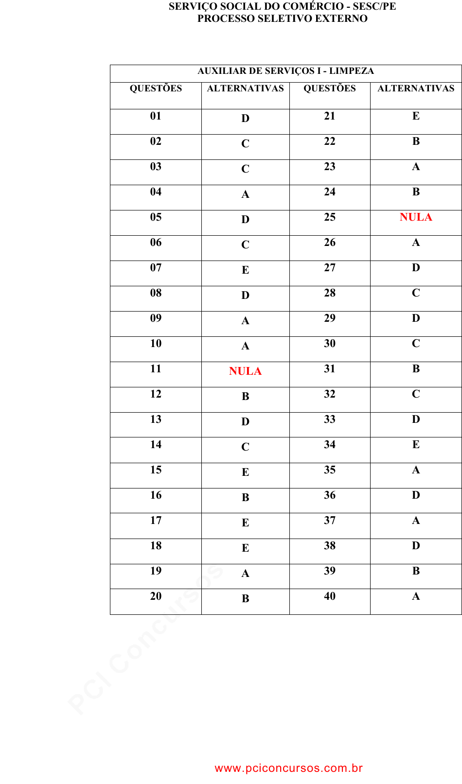 <p>pcimarkpci MjgwNDowN2Y3OmQ0ODM6ZmZmMTozNTc4OjIzYTY6ZDIyODphNWYz:V2VkLCAwMyBBcHIgMjAyNCAxMzoyOTo1OSAtMDMwMA==</p><p>www.pciconcursos.com.br</p><p>SERVIÇO SOCIAL DO COMÉRCIO - SESC/PE</p><p>PROCESSO SELETIVO EXTERNO</p><p>AUXILIAR DE SERVIÇOS I - LIMPEZA</p><p>QUESTÕES ALTERNATIVAS QUESTÕES ALTERNATIVAS</p><p>01 D 21 E</p><p>02 C 22 B</p><p>03 C 23 A</p><p>04 A 24 B</p><p>05 D 25 NULA</p><p>06 C 26 A</p><p>07 E 27 D</p><p>08 D 28 C</p><p>09 A 29 D</p><p>10 A 30 C</p><p>11 NULA 31 B</p><p>12 B 32 C</p><p>13 D 33 D</p><p>14 C 34 E</p><p>15 E 35 A</p><p>16 B 36 D</p><p>17 E 37 A</p><p>18 E 38 D</p><p>19 A 39 B</p><p>20 B 40 A</p><p>www.pciconcursos.com.br</p><p>pcimarkpci MjgwNDowN2Y3OmQ0ODM6ZmZmMTozNTc4OjIzYTY6ZDIyODphNWYz:V2VkLCAwMyBBcHIgMjAyNCAxMzoyOTo1OSAtMDMwMA==</p><p>www.pciconcursos.com.br</p><p>SERVIÇO SOCIAL DO COMÉRCIO - SESC/PE</p><p>PROCESSO SELETIVO EXTERNO</p><p>2</p><p>AUXILIAR DE SERVIÇOS I - PORTARIA</p><p>QUESTÕES ALTERNATIVAS QUESTÕES ALTERNATIVAS</p><p>01 D 21 A</p><p>02 C 22 C</p><p>03 C 23 D</p><p>04 A 24 B</p><p>05 D 25 E</p><p>06 C 26 D</p><p>07 E 27 D</p><p>08 D 28 E</p><p>09 A 29 C</p><p>10 A 30 A</p><p>11 NULA 31 C</p><p>12 B 32 B</p><p>13 D 33 A</p><p>14 C 34 D</p><p>15 E 35 C</p><p>16 B 36 A</p><p>17 E 37 E</p><p>18 E 38 B</p><p>19 A 39 B</p><p>20 B 40 E</p><p>www.pciconcursos.com.br</p><p>pcimarkpci MjgwNDowN2Y3OmQ0ODM6ZmZmMTozNTc4OjIzYTY6ZDIyODphNWYz:V2VkLCAwMyBBcHIgMjAyNCAxMzoyOTo1OSAtMDMwMA==</p><p>www.pciconcursos.com.br</p><p>SERVIÇO SOCIAL DO COMÉRCIO - SESC/PE</p><p>PROCESSO SELETIVO EXTERNO</p><p>3</p><p>AUXILIAR DE SERVIÇOS I - MANUTENÇÃO</p><p>QUESTÕES ALTERNATIVAS QUESTÕES ALTERNATIVAS</p><p>01 D 21 E</p><p>02 C 22 E</p><p>03 C 23 A</p><p>04 A 24 B</p><p>05 D 25 D</p><p>06 C 26 B</p><p>07 E 27 A</p><p>08 D 28 C</p><p>09 A 29 D</p><p>10 A 30 D</p><p>11 NULA 31 A</p><p>12 B 32 B</p><p>13 D 33 C</p><p>14 C 34 C</p><p>15 E 35 B</p><p>16 B 36 E</p><p>17 E 37 B</p><p>18 E 38 A</p><p>19 A 39 E</p><p>20 B 40 A</p><p>www.pciconcursos.com.br</p><p>pcimarkpci MjgwNDowN2Y3OmQ0ODM6ZmZmMTozNTc4OjIzYTY6ZDIyODphNWYz:V2VkLCAwMyBBcHIgMjAyNCAxMzoyOTo1OSAtMDMwMA==</p><p>www.pciconcursos.com.br</p><p>SERVIÇO SOCIAL DO COMÉRCIO - SESC/PE</p><p>PROCESSO SELETIVO EXTERNO</p><p>4</p><p>AUXILIAR DE SERVIÇOS I - CAMAREIRA</p><p>QUESTÕES ALTERNATIVAS QUESTÕES ALTERNATIVAS</p><p>01 D 21 D</p><p>02 C 22 C</p><p>03 C 23 E</p><p>04 A 24 D</p><p>05 D 25 A</p><p>06 C 26 E</p><p>07 E 27 E</p><p>08 D 28 C</p><p>09 A 29 E</p><p>10 A 30 C</p><p>11 NULA 31 B</p><p>12 B 32 B</p><p>13 D 33 B</p><p>14 C 34 C</p><p>15 E 35 A</p><p>16 B 36 A</p><p>17 E 37 B</p><p>18 E 38 A</p><p>19 A 39 D</p><p>20 B 40 E</p><p>www.pciconcursos.com.br</p><p>pcimarkpci MjgwNDowN2Y3OmQ0ODM6ZmZmMTozNTc4OjIzYTY6ZDIyODphNWYz:V2VkLCAwMyBBcHIgMjAyNCAxMzoyOTo1OSAtMDMwMA==</p><p>www.pciconcursos.com.br</p><p>SERVIÇO SOCIAL DO COMÉRCIO - SESC/PE</p><p>PROCESSO SELETIVO EXTERNO</p><p>5</p><p>AUXILIAR DE SERVIÇOS I – ATENDENTE DE COPA E COZINHA</p><p>QUESTÕES ALTERNATIVAS QUESTÕES ALTERNATIVAS</p><p>01 D 21 C</p><p>02 C 22 C</p><p>03 C 23 B</p><p>04 A 24 D</p><p>05 D 25 B</p><p>06 C 26 NULA</p><p>07 E 27 NULA</p><p>08 D 28 NULA</p><p>09 A 29 B</p><p>10 A 30 B</p><p>11 NULA 31 C</p><p>12 B 32 A</p><p>13 D 33 C</p><p>14 C 34 B</p><p>15 E 35 D</p><p>16 B 36 NULA</p><p>17 E 37 E</p><p>18 E 38 D</p><p>19 A 39 D</p><p>20 B 40 D</p><p>www.pciconcursos.com.br</p><p>pcimarkpci MjgwNDowN2Y3OmQ0ODM6ZmZmMTozNTc4OjIzYTY6ZDIyODphNWYz:V2VkLCAwMyBBcHIgMjAyNCAxMzoyOTo1OSAtMDMwMA==</p><p>www.pciconcursos.com.br</p><p>SERVIÇO SOCIAL DO COMÉRCIO - SESC/PE</p><p>PROCESSO SELETIVO EXTERNO</p><p>6</p><p>AUXILIAR DE SERVIÇOS I - COZINHEIRO</p><p>QUESTÕES ALTERNATIVAS QUESTÕES ALTERNATIVAS</p><p>01 D 21 C</p><p>02 C 22 E</p><p>03 C 23 B</p><p>04 A 24 D</p><p>05 D 25 A</p><p>06 C 26 D</p><p>07 E 27 D</p><p>08 D 28 E</p><p>09 A 29 C</p><p>10 A 30 D</p><p>11 NULA 31 A</p><p>12 B 32 C</p><p>13 D 33 C</p><p>14 C 34 C</p><p>15 E 35 B</p><p>16 B 36 A</p><p>17 E 37 E</p><p>18 E 38 D</p><p>19 A 39 E</p><p>20 B 40 A</p><p>www.pciconcursos.com.br</p><p>pcimarkpci MjgwNDowN2Y3OmQ0ODM6ZmZmMTozNTc4OjIzYTY6ZDIyODphNWYz:V2VkLCAwMyBBcHIgMjAyNCAxMzoyOTo1OSAtMDMwMA==</p><p>www.pciconcursos.com.br</p><p>SERVIÇO SOCIAL DO COMÉRCIO - SESC/PE</p><p>PROCESSO SELETIVO EXTERNO</p><p>7</p><p>AUXILIAR DE SERVIÇOS I - GARÇOM</p><p>QUESTÕES ALTERNATIVAS QUESTÕES ALTERNATIVAS</p><p>01 D 21 A</p><p>02 C 22 C</p><p>03 C 23 C</p><p>04 A 24 D</p><p>05 D 25 C</p><p>06 C 26 E</p><p>07 E 27 D</p><p>08 D 28 B</p><p>09 A 29 D</p><p>10 A 30 C</p><p>11 NULA 31 E</p><p>12 B 32 B</p><p>13 D 33 D</p><p>14 C 34 A</p><p>15 E 35 C</p><p>16 B 36 B</p><p>17 E 37 E</p><p>18 E 38 A</p><p>19 A 39 D</p><p>20 B 40 E</p><p>www.pciconcursos.com.br</p><p>pcimarkpci MjgwNDowN2Y3OmQ0ODM6ZmZmMTozNTc4OjIzYTY6ZDIyODphNWYz:V2VkLCAwMyBBcHIgMjAyNCAxMzoyOTo1OSAtMDMwMA==</p><p>www.pciconcursos.com.br</p><p>SERVIÇO SOCIAL DO COMÉRCIO - SESC/PE</p><p>PROCESSO SELETIVO EXTERNO</p><p>8</p><p>AUXILIAR DE SERVIÇOS I - MOTORISTA</p><p>QUESTÕES ALTERNATIVAS QUESTÕES ALTERNATIVAS</p><p>01 D 21 NULA</p><p>02 C 22 A</p><p>03 C 23 E</p><p>04 A 24 A</p><p>05 D 25 B</p><p>06 C 26 D</p><p>07 E 27 A</p><p>08 D 28 C</p><p>09 A 29 A</p><p>10 A 30 C</p><p>11 NULA 31 B</p><p>12 B 32 E</p><p>13 D 33 C</p><p>14 C 34 A</p><p>15 E 35 D</p><p>16 B 36 C</p><p>17 E 37 B</p><p>18 E 38 B</p><p>19 A 39 C</p><p>20 B 40 E</p><p>www.pciconcursos.com.br</p><p>pcimarkpci MjgwNDowN2Y3OmQ0ODM6ZmZmMTozNTc4OjIzYTY6ZDIyODphNWYz:V2VkLCAwMyBBcHIgMjAyNCAxMzoyOTo1OSAtMDMwMA==</p><p>www.pciconcursos.com.br</p><p>SERVIÇO SOCIAL DO COMÉRCIO - SESC/PE</p><p>PROCESSO SELETIVO EXTERNO</p><p>9</p><p>AUXILIAR DE SERVIÇOS I - ROUPEIRO</p><p>QUESTÕES ALTERNATIVAS QUESTÕES ALTERNATIVAS</p><p>01 D 21 D</p><p>02 C 22 D</p><p>03 C 23 E</p><p>04 A 24 B</p><p>05 D 25 B</p><p>06 C 26 C</p><p>07 E 27 E</p><p>08 D 28 A</p><p>09 A 29 B</p><p>10 A 30 B</p><p>11 NULA 31 D</p><p>12 B 32 E</p><p>13 D 33 C</p><p>14 C 34 E</p><p>15