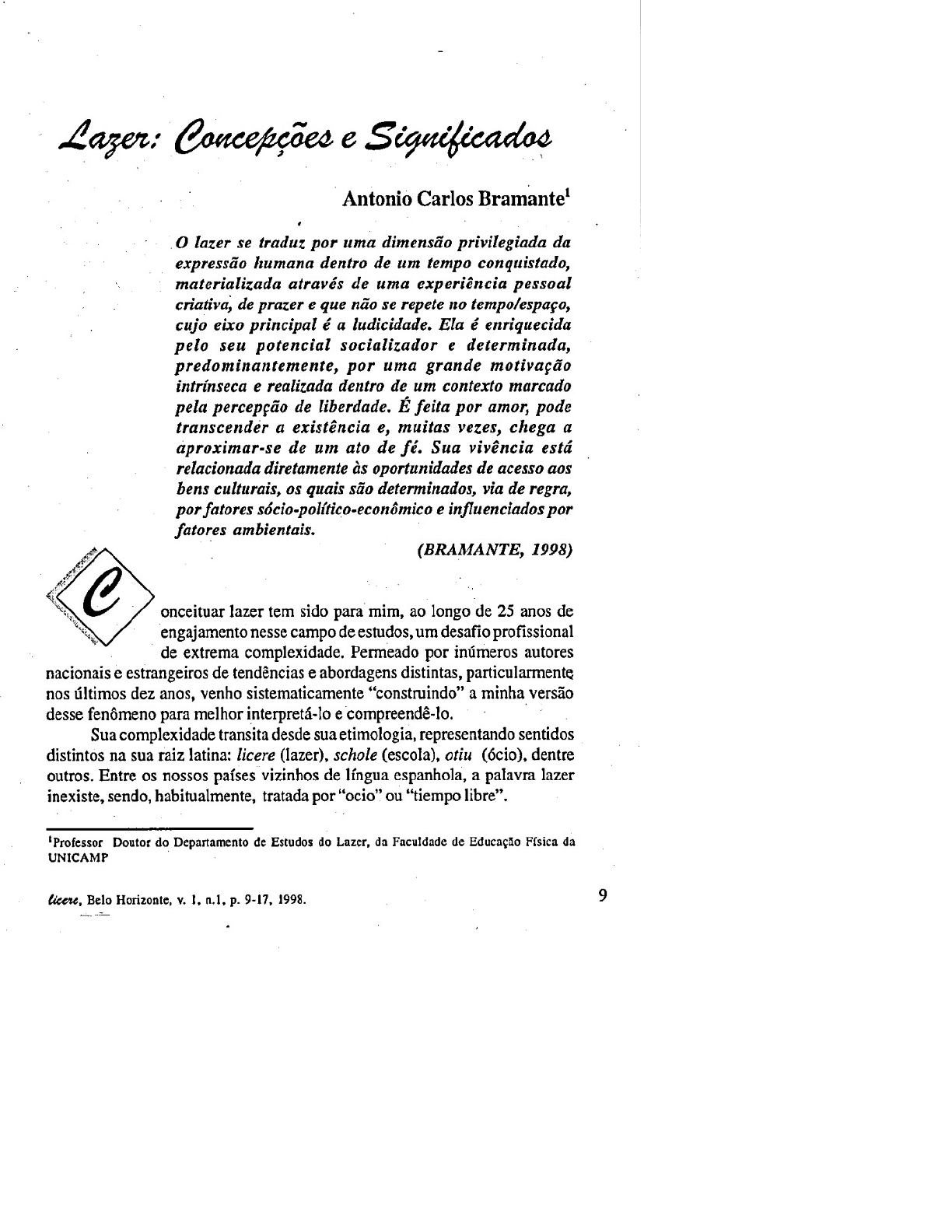 <p>Lazer: e Significados Antonio Carlos o lazer se traduz por uma dimensão privilegiada da expressão humana dentro de um tempo conquistado, materializada através de uma experiência pessoal criativa, de prazer e que não se repete no tempo/espaço, cujo eixo principal é a ludicidade. Ela é enriquecida pelo seu potencial socializador e determinada, predominantemente, por uma grande motivação intrínseca e realizada dentro de um contexto marcado pela percepção de liberdade. É feita por amor, pode transcender a existência e, muitas vezes, chega a aproximar-se de um ato de fé. Sua vivência está relacionada diretamente às oportunidades de acesso aos bens culturais, os quais são determinados, via de regra, por fatores e influenciados por fatores ambientais. (BRAMANTE, 1998) C onceituar lazer tem sido para mim, ao longo de 25 anos de engajamento nesse campo de estudos, um desafio profissional de extrema complexidade. Permeado por inúmeros autores nacionais e estrangeiros de tendências e abordagens distintas, particularmente nos últimos dez anos, venho sistematicamente "construindo" a minha versão desse fenômeno para melhor interpretá-lo e compreendê-lo. Sua complexidade transita desde sua etimologia, representando sentidos distintos na sua raiz latina: licere (lazer), schole (escola), otiu dentre outros. Entre os nossos países vizinhos de língua espanhola, a palavra lazer inexiste, sendo, habitualmente, tratada por "ocio" ou "tiempo libre". Doutor do Departamento de Estudos do Lazer, da Faculdade de Educação Física da UNICAMP licere, Belo Horizonte, p. 9-17, 1998. 9</p><p>Fenômeno típico decorrente, sobretudo, dos efeitos da revolução industrial e, agravado pelo crescente processo de urbanização das cidades, o lazer vem sendo também, ao longo do tempo, conceitualmente confundido com outros derivativos, tais como recreação, jogo, esporte, etc. A partir dos anos 50 o lazer começa ocupar espaço de relevância no seio acadêmico internacional para tornar-se um amplo campo de estudos, pesquisas e aplicação. Seu caráter interdisciplinar tem sido uma tônica, que busca facilitar a compreensão do lazer, exposto pelos mais diversos enfoques profissionais. Filosofia, história, antropologia, sociologia, psicologia, geografia, são algumas das áreas do conhecimento que têm contribuído de maneira expressiva para facilitar a compreensão do lazer. Muito embora a obra "Lazer Operário" de Acácio Ferreira, editada em 1959, seja reconhecida por muitos estudiosos do assunto como o marco inicial das reflexões dessa problemática social no Brasil, somente a partir dos anos 70 essa temática começa a receber maior atenção dos pesquisadores. Da influência européia dos anos 70/80, vindo principalmente do ramo da sociologia, para a influência norte-americana dos anos 80/90, construída particularmente a partir da psicologia, vivemos hoje uma pluralidade de conceitos, na qual os autores das mais variadas matizes ideológicas tendem a concordar tão somente com um conjunto de características advindas da vivência do lúdico, eixo fundamental do lazer. Uma vez apresentada essa breve evolução do tema, optei por discutir meu próprio conceito de lazer para inaugurar essa publicação específica dentro desta seção Olhares", sobre concepções e significados do lazer e recreação. 10 Belo Horizonte, 1, n.1, p. 9-17, 1998.</p><p>lazer se traduz por uma dimensão privilegiada da expressão humana dentro de um tempo conquistado... Dadas as características da sociedade capitalista contemporânea, na qual instrumentalizou-se o tempo e a atividade recreativa tende a transformar- se em mera mercadoria, a dimensão do "não trabalho" pode assumir uma nuança extraordinária para a vivência da essência humana, através da conquista de um tempo da "não utilidade" frente às pressões crescentes de se dar sempre uma certa finalidade ao uso do tempo. o tempo, conceito objetivamente inelástico, vem se tornando uma "mercadoria" de luxo, em que a máxima "tempo é dinheiro" chega a refletir o seu verdadeiro significado, dado por segmentos significativos da nossa sociedade. Portanto, "conquistar" um tempo da não obrigação vem se impondo como um desafio para todos que desejam exercitar a face humana da vida plena. materializada através de uma experiência pessoal criativa, de prazer e que não se repete no tempo/espaço, cujo eixo principal é a ludicidade... Tenho optado, ultimamente, pelo conceito de experiência ao invés de atividade, considerando o componente de qualidade que caracteriza o primeiro. o conceito de atividade, no meu entender, é mais apropriado quando associado à recreação, por exemplo, a um "programa de atividades recreativas para pré- escolares". e assim por diante. Com a crescente aplicação da psicologia nos estudos do lazer, durante os anos 70, incorporou-se ao binômio tempo/atividade - atributos principais na conceituação do lazer o caráter atitudinal ao indivíduo que o vive, tornando o lazer, antes de tudo, um fenômeno pessoal e com alguns atributos básicos, destacando-se dois: a criatividade e o prazer. A explicação da dimensão tempo residual das obrigações pessoais e sociais para caracterizar o lazer foi se esgotando na era denominada onde a vida, como um todo, perde a sua linearidade e ganha novos enfoques nas relações sociais entre o indivíduo consigo, com o próximo e com o meio ambiente. Entra em vigor o conceito mais elástico de tempo social, na qual a oscilação entre obrigação e não obrigação, característica do contexto humano, extrapola a dimensão objetiva de tempo. A categoria atividade, enquanto traço definidor do que seja ou não lazer, pode auxiliar e favorecer o entendimento de algumas taxionomias, mas, Belo Horizonte, 1. p. 9-17, 1998. 11</p><p>de longe, oferece qualquer sustentação teórica, pois, o que pode ser lazer para um, pode não ser para outras pessoas. Além disso, para aquela mesma pesso