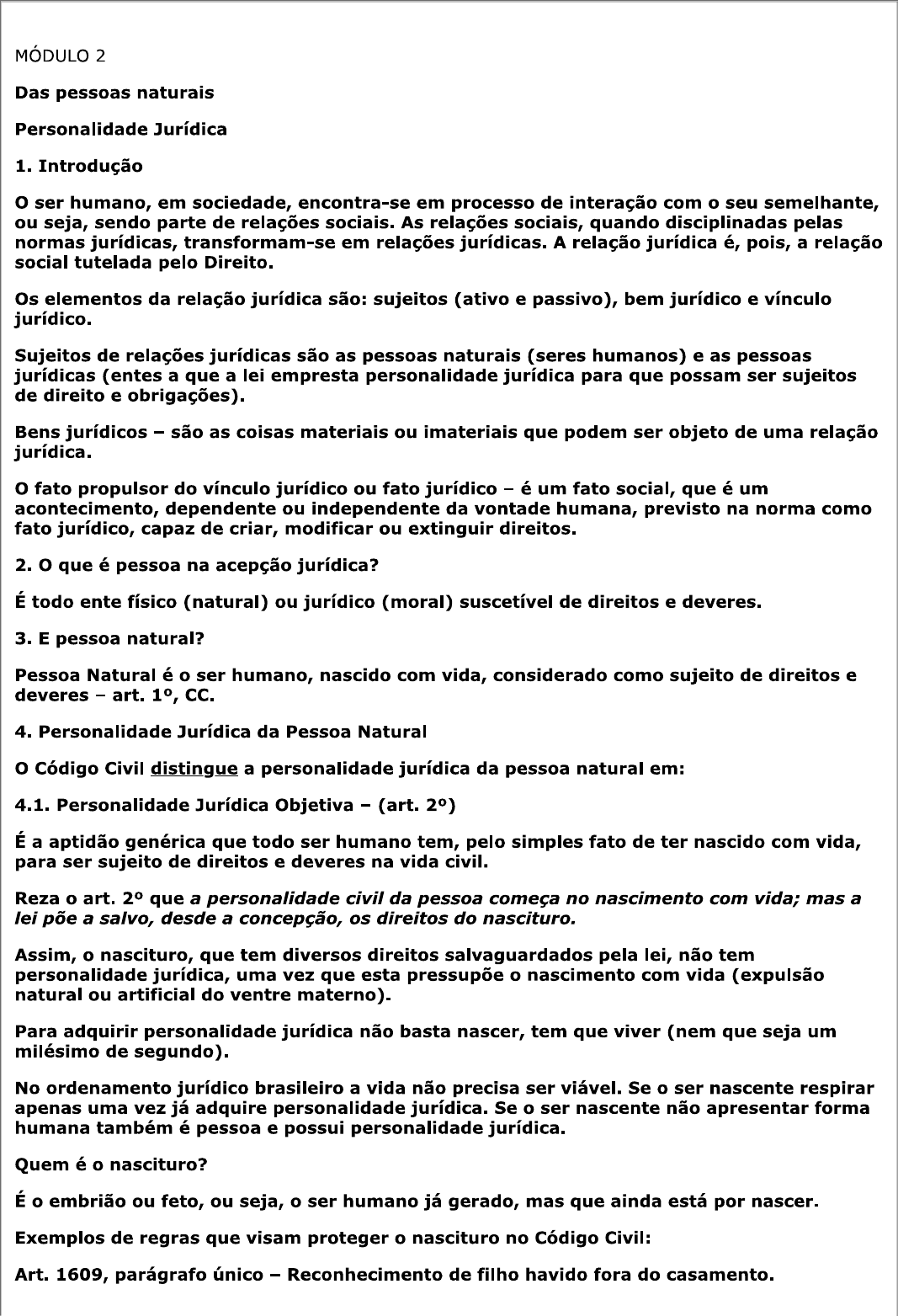 <p>MÓDULO 2 Das pessoas naturais Personalidade Jurídica 1. Introdução o ser humano, em sociedade, encontra-se em processo de interação com o seu semelhante, ou seja, sendo parte de relações sociais. As relações sociais, quando disciplinadas pelas normas jurídicas, transformam-se em relações jurídicas. A relação jurídica é, pois, a relação social tutelada pelo Direito. Os elementos da relação jurídica são: sujeitos (ativo e passivo), bem jurídico e vínculo jurídico. Sujeitos de relações jurídicas são as pessoas naturais (seres humanos) e as pessoas jurídicas (entes a que a lei empresta personalidade jurídica para que possam ser sujeitos de direito e obrigações). Bens jurídicos são as coisas materiais ou imateriais que podem ser objeto de uma relação jurídica. o fato propulsor do vínculo jurídico ou fato jurídico é um fato social, que é um dependente ou independente da vontade humana, previsto na norma como fato jurídico, capaz de criar, modificar ou extinguir direitos. 2. o que é pessoa na acepção jurídica? É todo ente físico (natural) ou jurídico (moral) suscetível de direitos e deveres. 3. E pessoa natural? Pessoa Natural é o ser humano, nascido com vida, considerado como sujeito de direitos e deveres art. 1°, CC. 4. Personalidade Jurídica da Pessoa Natural o Código Civil distingue a personalidade jurídica da pessoa natural em: 4.1. Personalidade Jurídica Objetiva (art. 2°) É a aptidão genérica que todo ser humano tem, pelo simples fato de ter nascido com vida, para ser sujeito de direitos e deveres na vida civil. Reza o art. 2° que a personalidade civil da pessoa começa no nascimento com vida; mas a lei a salvo, desde a concepção, os direitos do nascituro. Assim, o nascituro, que tem diversos direitos salvaguardados pela lei, não tem personalidade jurídica, uma vez que esta pressupõe o nascimento com vida (expulsão natural ou artificial do ventre materno). Para adquirir personalidade jurídica não basta nascer, tem que viver (nem que seja um milésimo de segundo). No ordenamento jurídico brasileiro a vida não precisa ser viável. Se o ser nascente respirar apenas uma vez já adquire personalidade jurídica. Se o ser nascente não apresentar forma humana também é pessoa e possui personalidade jurídica. Quem é o nascituro? É embrião ou feto, ou seja, o ser humano já gerado, mas que ainda está por nascer. Exemplos de regras que visam proteger o nascituro no Código Civil: Art. 1609, parágrafo único Reconhecimento de filho havido fora do casamento.</p><p>Art. 1779 - Curatela do nascituro. Art. 542 Doação feita ao nascituro. Art. 1799, I Sucessão testamentária do nascituro (pode ser beneficiário em testamento). 4.2. Personalidade Jurídica Subjetiva (art. 11 ao art. 21) Direitos da Personalidade Para satisfazer suas necessidades nas relações sociais, o ser humano adquire direitos e assume obrigações, sendo, pois, sujeito ativo e passivo de relações jurídicas de ordem econômica. Contudo, além dos direitos patrimoniais, a pessoa natural tem direitos da personalidade, os quais se ligam a ela de maneira perpétua. Os direitos da personalidade são os direitos subjetivos da pessoa natural defender o que lhe é próprio, ou seja, a sua integridade física (vida, alimentos, próprio corpo vivo ou morto, corpo alheio vivo ou morto, partes separadas do corpo vivo ou morto); sua integridade intelectual (liberdade de pensamento, autoria artística, científica ou literária) e sua integridade moral (honra, identidade pessoal, familiar e social, privacidade, intimidade). Assim a personalidade jurídica subjetiva é composta dos direitos da personalidade, isto é, o conjunto de caracteres próprios e exclusivos do ser humano. A personalidade jurídica subjetiva não é um direito que a lei concede. É direito inato e, portanto, natural do ser humano, protegido pela Saliente-se que a enumeração constante do Capítulo II, do Título I, da Parte Geral, do Código Civil não é taxativa (numerus clausus), mas tão somente exemplificativa. a) Características art. 11 - são intransmissíveis e Doutrina: Os direitos da personalidade são intransmissíveis, irrenunciáveis, ilimitados, indisponíveis, impenhoráveis, imprescritíveis, extrapatrimoniais e vitalícios. Ressalte-se que a indisponibilidade dos direitos da personalidade é relativa. Exemplos: disponibilidade da imagem dos modelos, mediante remuneração; doação de órgãos ou tecidos com finalidade terapêutica ou científica (art. 13. par. único). b) Classificação b.1. Direito à integridade física art.13, 14 e 15 c.c. Lei n. 9434/97- Transplante de Órgãos. b.2. Direito à integridade intelectual - liberdade de pensamento, autoria científica, artística e literária. b.3. Direito à integridade moral - liberdade civil, política e religiosa; direito à identidade (art.16, 17, 18 e 19); direito à imagem (art. 20) etc. c) Limitações do Direito à Imagem art. 20, parte: Salvo se autorizadas*, ou se necessárias à administração da justiça ou à manutenção da ordem pública... pessoas notórias a difusão de sua imagem sem seu consenso deve estar relacionada à atividade, sem invasão da sua privacidade. cargos públicos idem atendimento ao serviço da administração da justiça ou da polícia ex. "procura-se" interesse público - fins científicos, doenças raras que levem à exposição necessária das partes do corpo de alguém contaminado, sem que seja possível a sua identificação. imagem como parte de um cenário shows, desfile de carnaval etc. identificação compulsória - documentos de identidade.</p><p>* Obs.: o direito à privacidade não se sobrepõe à liberdade de expressão. Por unanimidade, em 10 de junho de 2015 o Plenário do Supremo Tribunal Federal julgou procedente a Ação Direta de Inconstitucionalidade (ADI) 4815 e declarou inexigível a autorização prévia para a publicação de biografias. Seguindo o voto
