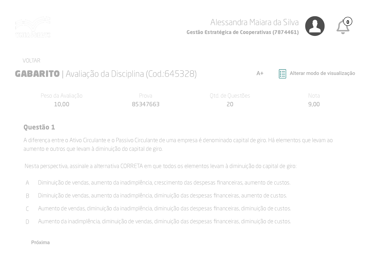 <p>02/09/2024 16:14 AVA</p><p>https://ava2.uniasselvi.com.br/subject/grades-and-tests/answer-book/eyJ0ZXN0Ijp7InRlc3RDb2RlIjoiNjQ1MzI4IiwiZGVzY3JpcHRpb24iOiJBdmFsaWHDp8OjbyBkYSBEaXNjaXBsaW5hIiwicGFyYW1ldGVyIjpudWxsL… 1/1</p><p>GABARITO | Avaliação da Disciplina (Cod.:645328)</p><p>Peso da Avaliação</p><p>10,00</p><p>Prova</p><p>85347663</p><p>Qtd. de Questões</p><p>20</p><p>Nota</p><p>9,00</p><p>Questão 1</p><p>A diferença entre o Ativo Circulante e o Passivo Circulante de uma empresa é denominado capital de giro. Há elementos que levam ao</p><p>aumento e outros que levam à diminuição do capital de giro.</p><p>Nesta perspectiva, assinale a alternativa CORRETA em que todos os elementos levam à diminuição do capital de giro:</p><p>A Diminuição de vendas, aumento da inadimplência, crescimento das despesas financeiras, aumento de custos.</p><p>B Diminuição de vendas, aumento da inadimplência, diminuição das despesas financeiras, aumento de custos.</p><p>C Aumento de vendas, diminuição da inadimplência, diminuição das despesas financeiras, diminuição de custos.</p><p>D Aumento da inadimplência, diminuição de vendas, diminuição das despesas financeiras, diminuição de custos.</p><p>VOLTAR</p><p>A+ Alterar modo de visualização</p><p>Próxima</p><p>Alessandra Maiara da Silva</p><p>Gestão Estratégica de Cooperativas (7874461) </p><p>0</p>