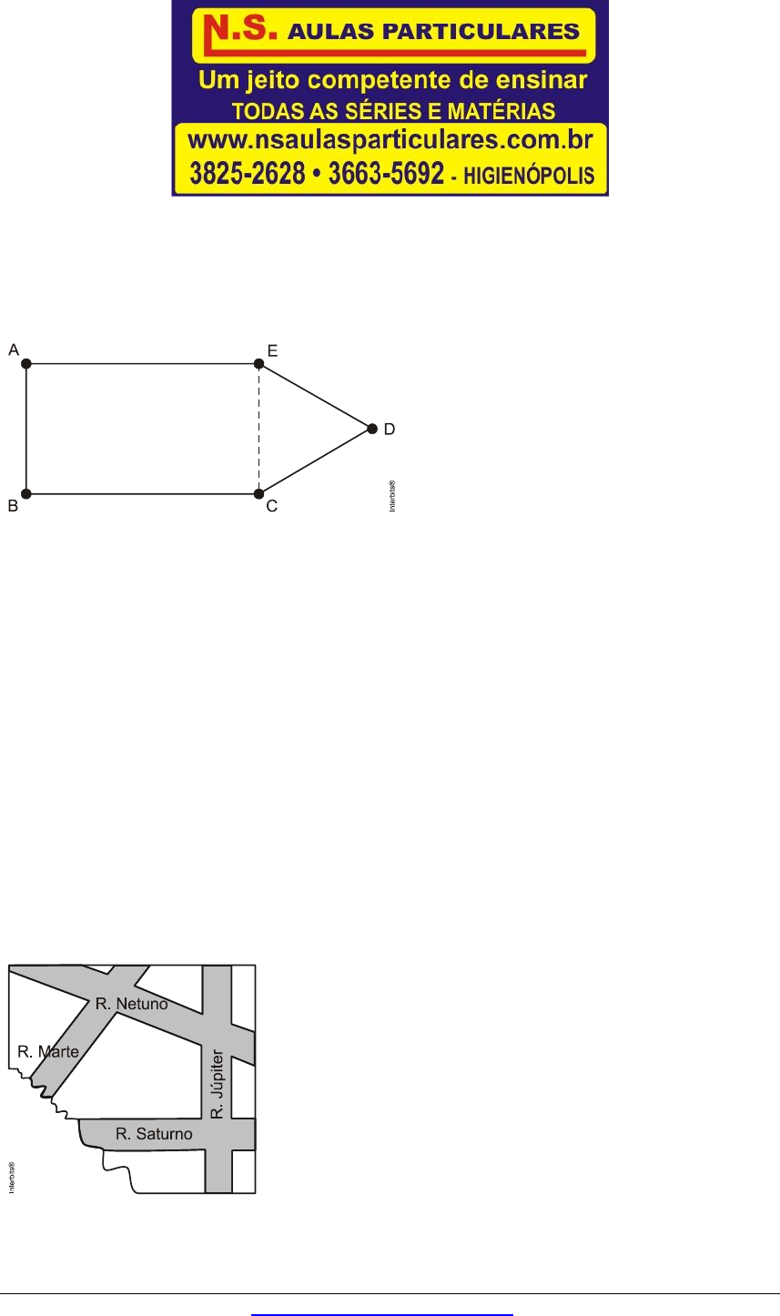 <p>www.nsaulasparticulares.com.br Página 1 de 8</p><p>Polígonos Regulares</p><p>1. (G1 - cftrj 2014) Na figura abaixo, ABCE é um retângulo e CDE é um triângulo equilátero.</p><p>Sabendo que o perímetro do polígono ABCDE é 456 cm e CD mede 68 cm, qual é a medida do</p><p>lado BC?</p><p>a) 118 cm</p><p>b) 126 cm</p><p>c) 130 cm</p><p>d) 142 cm</p><p>2. (Uece 2014) Se, em um polígono convexo, o número de lados n é um terço do número de</p><p>diagonais, então o valor de n é</p><p>a) 9.</p><p>b) 11.</p><p>c) 13.</p><p>d) 15.</p><p>3. (G1 - ifsp 2013) Uma pessoa pegou um mapa rasgado em que constava um terreno</p><p>delimitado por quatro ruas. Na parte visível do mapa, vê-se que o ângulo formado pela rua</p><p>Saturno e pela rua Júpiter é 90°; o ângulo formado pela rua Júpiter e pela rua Netuno é 110° e</p><p>o ângulo formado pela rua Netuno e pela rua Marte é 100°. Nessas condições, a medida de um</p><p>ângulo formado pelas ruas Marte e Saturno, na parte rasgada do mapa, é de</p><p>a) 50°. b) 60°. c) 70°. d) 80°. e) 90°.</p><p>www.nsaulasparticulares.com.br Página 2 de 8</p><p>4. (G1 - cftrj 2013) Manuela desenha os seis vértices de um hexágono regular (figura abaixo) e</p><p>une alguns dos seis pontos com segmentos de reta para obter uma figura geométrica. Essa</p><p>figura não é seguramente um</p><p>a) retângulo</p><p>b) trapézio</p><p>c) quadrado</p><p>d) triângulo equilátero</p><p>5. (Espm 2013) Na figura abaixo, ABCD é um quadrado, BDE é um triângulo equilátero e BDF</p><p>é um triângulo isósceles, onde AF = AB. A medida do ângulo α é:</p><p>a) 120°</p><p>b) 135°</p><p>c) 127,5°</p><p>d) 122,5°</p><p>e) 110,5°</p><p>6. (G1 - ifce 2012) A respeito das diagonais de um hexágono regular de lado medindo 1 cm, é</p><p>correto afirmar-se que</p><p>a) são nove, de três comprimentos diferentes, e as menores medem 3 .cm</p><p>b) são nove, de dois comprimentos diferentes, e as maiores medem 3 .cm</p><p>c) são nove, de dois comprimentos diferentes, e as menores medem 3 .cm</p><p>d) são doze, de três comprimentos diferentes, e as maiores medem 3 .cm</p><p>e) são doze, de dois comprimentos diferentes, e as menores medem 3 .cm</p><p>7. (Uepg 2011) Três polígonos regulares A, B, e C, têm números de lados, respectivamente, a,</p><p>b, c, onde a > b > c. Sabendo-se que a, b e c estão em progressão aritmética de razão – 2 e</p><p>que a soma de todos os ângulos internos dos três polígonos é 3.240°, assinale o que for</p><p>correto.</p><p>01) O polígono A tem 35 diagonais.</p><p>02) O número de diagonais do polígono C é maior que 10.</p><p>04) A soma dos ângulos internos do polígono C é 720º.</p><p>08) Cada ângulo externo do polígono A mede 36º.</p><p>16) Cada ângulo interno do polígono B mede 135º.</p><p>www.nsaulasparticulares.com.br Página 3 de 8</p><p>8. (Uft 2011) Um polígono convexo de 6 lados tem as medidas de seus ângulos internos</p><p>formando uma progressão aritmética de razão igual a 6º. Logo, podemos afirmar que o seu</p><p>menor ângulo mede:</p><p>a) 90º</p><p>b) 105º</p><p>c) 115º</p><p>d) 118º</p><p>e) 120º</p><p>9. (G1 - cftmg 2011) No loteamento Recanto Verde, um professor comprou uma chácara, cujo</p><p>terreno tem forma retangular e dimensões 40m 90m . Ele pretende cercar essa área com</p><p>estacas de cimento distanciadas de 2,5muma da outra. O número de estacas necessário para</p><p>cercar todo esse terreno é</p><p>a) 102</p><p>b) 103</p><p>c) 104</p><p>d) 108</p><p>10. (G1 - utfpr 2010) A soma das medidas dos ângulos internos de um triângulo é 180º. A</p><p>soma das medidas dos ângulos internos de um hexágono é:</p><p>a) 180º</p><p>b) 360º</p><p>c) 540º</p><p>d) 720º</p><p>e) 900º</p><p>11. (Unifesp 2008) A soma de n - 1 ângulos internos de um polígono convexo de n lados é</p><p>1900</p><p>°</p><p>. O ângulo remanescente mede</p><p>a) 120</p><p>°</p><p>.</p><p>b) 105</p><p>°</p><p>.</p><p>c) 95</p><p>°</p><p>.</p><p>d) 80</p><p>°</p><p>.</p><p>e) 60</p><p>°</p><p>.</p><p>12. (G1 - cftce 2007) Se a razão entre o número de diagonais d e de lados n, com n > 3, de um</p><p>polígono, é um número inteiro positivo, então o número de lados do polígono:</p><p>a) é sempre par</p><p>b) é sempre ímpar</p><p>c) é sempre múltiplo de 3</p><p>d) não existe</p><p>e) é sempre primo</p><p>www.nsaulasparticulares.com.br Página 4 de 8</p><p>13. (Ufsc 2006) Considere um hexágono equiângulo (ângulos internos iguais) no qual quatro</p><p>lados consecutivos medem 20 cm, 13 cm, 15 cm e 23 cm, conforme figura a seguir. Calcule o</p><p>perímetro do hexágono.</p><p>14. (Ita 2005) Considere um prisma regular em que a soma dos ângulos internos de todas as</p><p>faces é 7200</p><p>°</p><p>. O número de vértices deste prisma é igual a</p><p>a) 11.</p><p>b) 32.</p><p>c) 10.</p><p>d) 20.</p><p>e) 22.</p><p>15. (Pucrj 2005) Os ângulos internos de um quadrilátero medem 3x - 45, 2x + 10, 2x + 15 e x +</p><p>20 graus. O menor ângulo mede:</p><p>a) 90</p><p>°</p><p>b) 65</p><p>°</p><p>c) 45</p><p>°</p><p>d) 105</p><p>°</p><p>e) 80</p><p>°</p><p>www.nsaulasparticulares.com.br Página 5 de 8</p><p>Gabarito:</p><p>Resposta da questão 1:</p><p>[B]</p><p>AB = ED = CD = 68 e AE = BC = x</p><p>Logo,</p><p>2x + 68 + 68 + 68 = 252</p><p>2x = 252</p><p>x = 126, ou seja, BC = 126 cm.</p><p>Resposta da questão 2:</p><p>[A]</p><p>Admitindo que n seja o número de lados de um polígono e de o número de diagonais, temos:</p><p>2 21 n (n 3)</p><p>n d d 3 n 3n n 3 n 6n n 9 n 0</p><p>3 2</p><p>n 0 (não convém) ou</p><p>n 9.</p><p> </p><p> </p><p> </p><p></p><p></p><p>Logo, o valor de n é 9.</p><p>Resposta da questão 3:</p><p>[B]</p><p>No quadrilátero formado pelas ruas, temos:</p><p>90° + 110° + 100° + x = 360°</p><p>x = 360° – 300°</p><p>x = 60°</p><p>www.nsaulasparticulares.com.br Página 6 de 8</p><p>Resposta da questão 4:</p><p>[C]</p><p>Não se