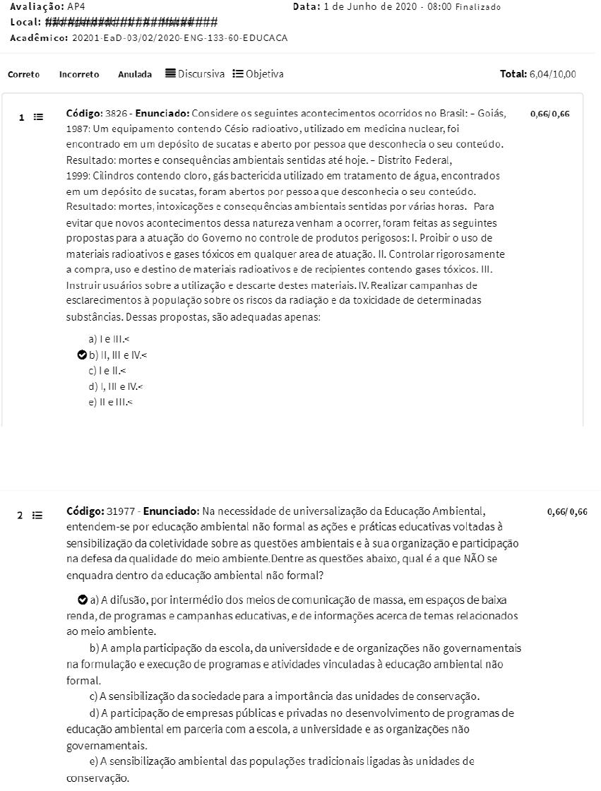<p>Avaliação: AP4 Data: 1 de Junho de 2020 08:00 Finalizado Local: Acadêmico: 20201-EaD-03/02/2020-ENG-133-60-EDUCACA Correto Incorreto Anulada Discursiva Objetiva Total: 6,04/10,00 Código: 3826 - Enunciado: Considere os seguintes acontecimentos ocorridos no Brasil: - Goias, 0,66/0,66 1987: Um equipamento contendo Césio radioativo, utilizado em medicina nuclear, foi encontrado em um depósito de sucatas e aberto por pessoa que desconhecia o seu conteúdo. Resultado: mortes e consequências ambientais sentidas até hoje. Distrito Federal, 1999: Cilindros contendo cloro, gás bactericida utilizado em tratamento de água, encontrados em um depósito de sucatas, foram abertos por pessoa que desconhecia o seu conteúdo. Resultado: mortes, intoxicações e consequências ambientais sentidas por várias horas. Para evitar que novos acontecimentos dessa natureza venham a ocorrer, foram feitas as seguintes propostas para a atuação do Governo no controle de produtos perigosos: I. Proibir uso de materiais radioativos e gases tóxicos em qualquer area de atuação. II. Controlar rigorosamente a compra, uso e destino de materiais radioativos e de recipientes contendo gases III. Instruir usuários sobre a utilização e descarte destes materiais. IV. Realizar campanhas de esclarecimentos à população sobre os riscos da radiação e da toxicidade de determinadas substâncias. Dessas propostas, são adequadas apenas: a) III.< b) II, III e IV.< c) d) I, III e IV.< e) Código: 31977 Enunciado: Na necessidade de universalização da Educação Ambiental, 0,66/0,66 entendem-se por educação ambiental não formal as ações e práticas educativas voltadas à sensibilização da coletividade sobre as questões ambientais e à sua organização e participação na defesa da qualidade do meio as questões abaixo, qual é a que NÃO se enquadra dentro da educação ambiental não formal? a) A difusão, por intermédio dos meios de comunicação de massa, em espaços de baixa renda, de programas e campanhas educativas, e de informações acerca de temas relacionados ao meio ambiente. b) A ampla participação da escola, da universidade e de organizações não governamentais na formulação e execução de programas e atividades vinculadas à educação ambiental não formal. c) A sensibilização da sociedade para a importância das unidades de conservação. d) A participação de empresas públicas e privadas no desenvolvimento de programas de educação ambiental em parceria com a escola, a universidade e as organizações não governamentais. e) A sensibilização ambiental das populações tradicionais ligadas às unidades de conservação.</p><p>3 Código: 713 Enunciado: Mecanismo de Desenvolvimento Limpo MDL foi estabelecido 0,66/0,66 pelo protocolo de Kyoto, a fim de ajudar países desenvolvidos a atingirem suas metas de redução dos gases do efeito estufa. Baseado nessa informação, qual dos pontos abaixo não se enquadra nos benefícios do MDL?< a) Ajuda a reduzir as emissões globais de gases causadores de efeito estufa, que provocam o aquecimento global. b) Beneficia os países em desenvolvimento, que passam a contar com tecnologias de baixo carbono para executar os projetos sustentáveis. c) Geram recurso pelos créditos de carbono que são utilizados no combate às mudanças climáticas. d) Auxilia os países desenvolvidos a cumprirem suas metas estipuladas pelo protocolo de Kyoto.< e) Beneficia os países desenvolvidos, que passam a contar com tecnologias de baixo carbono para executar os projetos sustentáveis.< Alternativa marcada: e) Beneficia os países desenvolvidos, que passam a contar com tecnologias de baixo carbono para executar os projetos sustentáveis.< 4 Código: 2593 Enunciado: A expressão "economia verde" substituiu conceito de 0,66/0,66 "ecodesenvolvimento" usado pelo canadense Maurice Strong, primeiro diretor-executivo do PNUMA e secretário-geral da Conferência de Estocolmo (1972) e da Rio-92. Com base no Relatório Bruntland, de 1987, a partir da Rio-92, a expressão "economia verde" foi aceita oficialmente pela comunidade internacional e popularizada no mundo. Depois da conferência, a expressão foi absorvida por governos, empresas e pela sociedade civil e empregada na formulação e execução tanto de políticas públicas quanto de iniciativas privadas ligadas à responsabilidade socioambiental. Como podemos definir a economia verde? a) Uma redução dos impostos nos produtos produzidos sem uso de agrotóxicos;< b) Uma redução dos impostos nos produtos reciclados, diminuindo seu valor e aumentando a oferta.< c) Uma economia que resulta em melhoria do bem-estar da humanidade, com atividades voltadas para a natureza, com menor impacto e menor custo.< d) Uma economia que resulta em melhoria do bem-estar da humanidade e igualdade social, ao mesmo tempo em que reduz os riscos ambientais e a escassez ecológica;< e) Uma economia baseada em melhoria do bem-estar da humanidade e igualdade social, ao mesmo tempo em que reduz os impactos ambientais e aumento na produção de alimentos;< Alternativa marcada: d) Uma economia que resulta em melhoria do bem-estar da humanidade e igualdade social, ao mesmo tempo em que reduz os riscos ambientais e a escassez ecológica;<</p><p>5 Código: 2545 - Enunciado: conceito de Educação Ambiental tem diversas interpretações. 0,66/0,66 Escolha, nas opções abaixo, a que melhor se enquadra na atualidade. a) Atualmente a Educação Ambiental assume o papel de desenvolvimento de novo caráter nos indivíduos, com vistas à construção de um futuro planejado sob uma ótica de desenvolvimento e progresso. b) A educação se restringe a desenvolver temas relacionados à natureza, como lixo e preservação das paisagens naturais. c) A Educação Ambiental tem a função de planejar novas estratégias pedagógicas para implantação nas escolas e compromisso com a sociedade. d) A Educação Ambiental, após a conferência de Tbilisi, na 