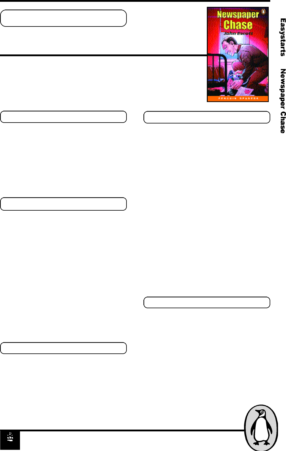Penguin Readers Factsheets Teacher’s Notes N ew s p aper Chase by John Escott About Easystarts Communicative activities Background and themes Extra words Easystarts are Penguin Readers written to the lowest level in the Penguin Readers series. They are specially written originals, using 200 headwords and the simplest grammatical structures. There are more than twenty titles to choose from across a range of styles and subject matter. All titles are in full colour, with carefully selected photos and/or artwork which helps to guide early learners of English. There is one page of activities at the back of each book. Penguin Readers Easystarts provide pleasurable reading for all tastes at an appropriate level of difficulty. Justice: Harry does a bad thing. He steals a painting to make money for himself. He is very greedy and the public can no longer see and admire the painting. But at the end of the story justice prevails and he gets what he deserves. Social responsibility: Janey knows that Harry has done something very wrong so she calls the police. She is socially responsible and helps get the painting back for everyone to admire. Responsibility for the environment: recycling is very important. Without it the world’s natural resources will eventually run out. It is not good to waste anything that can be recycled. © Pearson Education Limited 2002 Summary Newspaper Chase is a fictional story about a thief who steals a very expensive painting from an art gallery. At the beginning of the story Harry, the thief, comes into the art gallery and cuts the painting from its frame. On the way out he knocks over a table and breaks a beautiful vase. He laughs because he has broken a very expensive object. Harry goes back to the rooming house where he rents a room, and hides the painting under his bed. Janey, the daughter of the rooming house owner, thinks recycling is very important – she always recycles bottles and newspapers. On Friday in the story she collects old newspapers from the house, including the newspaper under Harry’s bed! She puts them in a box to give to the recycling van. Harry is not at home. He is trying to sell the painting. He comes home as Janey is putting the box in the van. He gets very worried and jumps into the van to find his newspaper. Janey sees a piece of broken glass in his shoe. It is the glass from the beautiful vase and Janey has seen the vase on the news on television. She calls the police and they come and take Harry away. The following teacher-led activities cover the same sections of text as the exercises at the back of the Reader. BEFORE YOU READ 1 Students look at the front of the book. Ask them the following questions: What is the man doing? Where is he? Why is he looking at the newspaper? AFTER YOU READ 1 Show students the pictures on the following pages. How are the characters feeling? page 2 – Harry page 4 – Harry page 7 – Harry page 10 – Jenny page 13 – the men in the recycling truck page 14 – Harry 2 Ask students: You win 1 million pounds. What do you want to buy? A painting? A boat? There are twenty extra words, in addition to the 200 headwords, used in each Easystart title. The extra words used in this title are highlighted in question 1 at the back of the Reader. They are: art gallery box break chase dollar frame glass jump rooming house million painting piece recycling remember reporter reward thief thousand truck vase Penguin Readers Factsheets Student’s activities ACTIVITIES BEFORE READING THE BOOK 1 Look at the front of the book. Think about the title of the book (Newspaper Chase). What does it mean? ACTIVITIES WHILE READING THE BOOK Pages 1–3 1 Write the correct word in the sentences below: art galleries thief breaks million frame vase dollar (a) Harry takes the painting from its ______. (b) American money is the ______. (c) I like paintings. I often go to ______ ______. (d) Harry is a ______. (e) The beautiful ______ is blue. (f) I have a lot of money. I buy paintings for one ______ d o l l a r s . (g) Harry ______ the vase into pieces. 2 Answer the questions: (a) What time is it when Harry goes to the art gallery? (b) How does Harry see the painting in the dark? (c) What does Harry take from his coat, when he takes the painting from its frame? (d) What colour is the beautiful vase? (e) Why does Harry smile? Pages 4–7 1 Write the correct words in the sentences below: rooming house thousand reporter painting piece truck (a) The building is one ______ years old. (b) Harry tries to get money for the ______. (c) The recycling ______ comes on Fridays. (d) I have a room in a ______ ______. (e) I am a ______ for a newspaper. (f) I like this cake, can I have a big ______ please. 2 Are the questions right or wrong? (a) Harry puts the painting in the kitchen. (b) Mrs Allen and Janey hear Harry come home. (c) Janey thinks recycling is important. (d) The vase is in a thousand pieces now. (e) Harry wants fifty-five thousand dollars for the painting? Pages 8–11 1 Write the correct word in the sentences below: recycling chases box jumps shoe (a) Janey puts the newspapers into a _ _ _ _ _ _. (b) Janey is looking at Harry’s _ _ _ _ _ _. (c) Janey ______ bottles and newspapers. (d) Harry _ _ _ _ _ _ after the recycling truck. (e) Harry _ _ _ _ _ _ into the recycling truck. 2 Answer the questions: (a) Why does Janey look for old newspapers? (b) Where does Janey see the newspaper in Harry’s room? (c) What colour is Janey’s recycling box? (d) What are the men from the recycling truck doing? (e) How many newspapers are in the truck? (f) How old is Harry’s newspaper? Pages 12–15 1 Write the correct word in the sentences below: glass remember angry reward (a) I am one of the men from the recycling truck. Aman is in my truck. I am very ______. (b) She is telling the police about the thief. Maybe she can get a ______. (c) I can’t ______ his name. (d) The vase breaks into a hundred pieces of ______. 2 Answer the questions: (a) Where doe