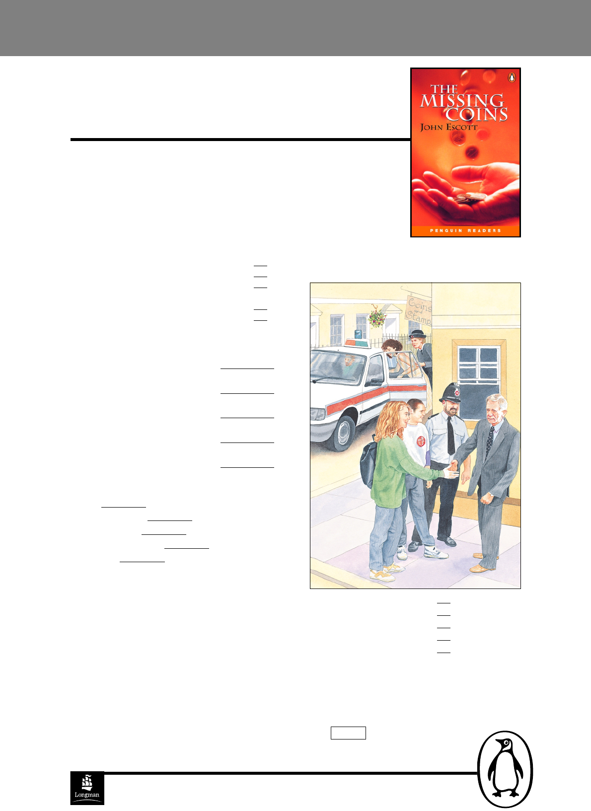 © Pearson Education Limited 2003 The Missing Coins by John Escott 1 True (T) or False (F)? (10 marks) (a) Carla gives the flute player some money. (b) Carla is going to start collecting coins. (c) Tracy is not very friendly. (d) The shopkeeper finds Carla and Pete in the Abbey. (e) Tracy runs away from the policeman. 2 Look at the words in italics below. Who or what are they? (10 marks) (a) He likes beautiful old buildings. (b) The shopkeeper thinks they had his coins last week. (c) The policeman takes them from the flute player. (d) She’s a clever student. She knows the answer to the missing coins. (e) It takes Tracy and the flute player to the police station. 3 Complete the sentences. Use some, any, many, much, a little or a lot. (10 marks) (a) of people visit Bath every year. (b) There aren’t people near the shop. (c) There isn’t money in the hat. (d) Pete doesn’t buy stamps. (e) How coins does Tracy steal? 4 Correct the mistakes in this text. There are five mistakes. (10 marks) Carla and Pete look at some valuable stamps and old coins in a small shop. Pete does not buy any coins, but he wants them. Later, the shopkeeper finds them outside. ‘You’ve got my coins!’ he says. But he’s wrong. The girl, Tracy, takes the coins and puts them in her friend’s pocket. He plays his flute near the shop door. Tourists don’t think the flutes are valuable. But Carla understands and she speaks to a policeman. He takes the stamps from the flute player, and the shopkeeper is happy. 5 Look at this picture. What are the people (a)–(e) saying or thinking? Write the numbers, 1–5. (10 marks) (a) Carla (b) Pete (c) The policeman (d) The shopkeeper (e) Tracy (1) ‘I don’t want to get in.’ (2) ‘I love Carla. She’s a clever friend.’ (3) ‘Good! Now the students and old man are happy.’ (4) ‘Thank you. What can I give you?’ (5) ‘Give Pete the stamps from South America.’ Total / 50 L e ve l 1 – B e g in n e r T h e M is s in g C o in s P E N G U I N R E A D E R S T E S T