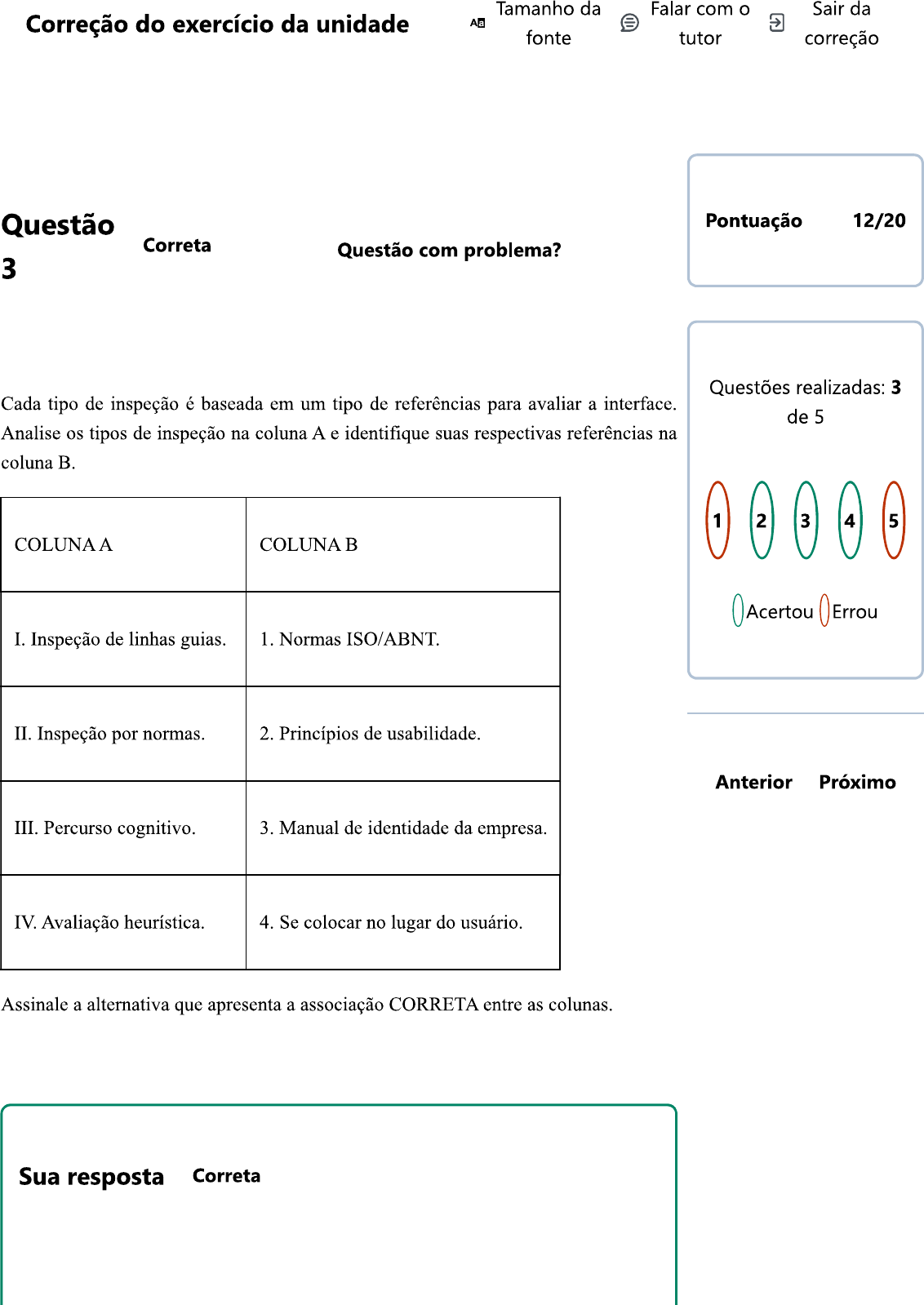 <p>Tamanho da Falar com o Sair da Correção do exercício da unidade fonte tutor correção Questão Pontuação 12/20 Correta Questão com problema? 3 Questões realizadas: 3 Cada tipo de inspeção é baseada em um tipo de referências para avaliar a interface. de 5 Analise os tipos de inspeção na coluna A e identifique suas respectivas referências na coluna B. 1 2 3 4 5 COLUNA A COLUNA B Acertou Errou I. Inspeção de linhas guias. 1. Normas ISO/ABNT. II. Inspeção por normas. 2. Princípios de usabilidade. Anterior Próximo III. Percurso cognitivo. 3. Manual de identidade da empresa. IV. Avaliação heurística. 4. Se colocar no lugar do usuário. Assinale a alternativa que apresenta a associação CORRETA entre as colunas. Sua resposta Correta</p><p>I-3; - II - 1; - Comentário A Inspeção de linhas guias é baseada em documentos da empresa, como o manual de identidade, a Inspeção por normas é baseada em normas, a avaliação heurística em princípios de usabilidade, e o Percurso cognitivo na simulação do avaliador se colocando no lugar do usuário.</p>