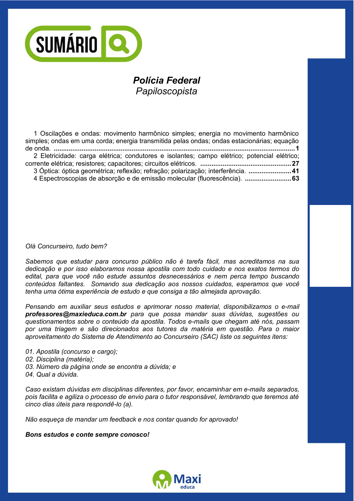 <p>1</p><p>Polícia Federal</p><p>Papiloscopista</p><p>1 Oscilações e ondas: movimento harmônico simples; energia no movimento harmônico</p><p>simples; ondas em uma corda; energia transmitida pelas ondas; ondas estacionárias; equação</p><p>de onda. .................................................................................................................................. 1</p><p>2 Eletricidade: carga elétrica; condutores e isolantes; campo elétrico; potencial elétrico;</p><p>corrente elétrica; resistores; capacitores; circuitos elétricos. ................................................. 27</p><p>3 Óptica: óptica geométrica; reflexão; refração; polarização; interferência. ....................... 41</p><p>4 Espectroscopias de absorção e de emissão molecular (fluorescência). ......................... 63</p><p>Olá Concurseiro, tudo bem?</p><p>Sabemos que estudar para concurso público não é tarefa fácil, mas acreditamos na sua</p><p>dedicação e por isso elaboramos nossa apostila com todo cuidado e nos exatos termos do</p><p>edital, para que você não estude assuntos desnecessários e nem perca tempo buscando</p><p>conteúdos faltantes. Somando sua dedicação aos nossos cuidados, esperamos que você</p><p>tenha uma ótima experiência de estudo e que consiga a tão almejada aprovação.</p><p>Pensando em auxiliar seus estudos e aprimorar nosso material, disponibilizamos o e-mail</p><p>professores@maxieduca.com.br para que possa mandar suas dúvidas, sugestões ou</p><p>questionamentos sobre o conteúdo da apostila. Todos e-mails que chegam até nós, passam</p><p>por uma triagem e são direcionados aos tutores da matéria em questão. Para o maior</p><p>aproveitamento do Sistema de Atendimento ao Concurseiro (SAC) liste os seguintes itens:</p><p>01. Apostila (concurso e cargo);</p><p>02. Disciplina (matéria);</p><p>03. Número da página onde se encontra a dúvida; e</p><p>04. Qual a dúvida.</p><p>Caso existam dúvidas em disciplinas diferentes, por favor, encaminhar em e-mails separados,</p><p>pois facilita e agiliza o processo de envio para o tutor responsável, lembrando que teremos até</p><p>cinco dias úteis para respondê-lo (a).</p><p>Não esqueça de mandar um feedback e nos contar quando for aprovado!</p><p>Bons estudos e conte sempre conosco!</p><p>Apostila gerada especialmente para: Celio Vanderlei Motta da Motta 949.916.260-72</p><p>1</p><p>MHS (Movimento Harmônico Simples)</p><p>Um fenômeno é periódico quando se repete, identicamente, em intervalos de tempo iguais. O período</p><p>T é o menor intervalo de tempo para uma repetição deste fenômeno.</p><p>Um oscilador harmônico efetua um movimento periódico, cujo intervalo é T para cada repetição do</p><p>fenômeno realizado. Para este tipo de fenômeno além de T é considerado um outro tipo de grandeza que</p><p>é a frequência f, que é o número de vezes que um movimento é repetido em um determinado intervalo de</p><p>tempo.</p><p>Assim podemos verificar que fT = 1 , assim : f = 1/T ou T = 1/f</p><p>A unidade de T é segundos e de f é 1/segundo que é denominado hertz (Hz).</p><p>Diz-se que um corpo está em MHS quando, em uma determinada trajetória, oscila periodicamente em</p><p>torno de uma posição de equilíbrio.</p><p>Observe a figura: Um corpo sob uma superfície sem atrito preso a uma mola ideal. Posto a oscilar com</p><p>uma amplitude de módulo A, assim indo de – A até A.</p><p>1 – Inicialmente a mola está em repouso sendo que a energia potencial do corpo é zero e a cinética é</p><p>máxima. Sua velocidade é máxima e sua aceleração é zero.</p><p>2 – O corpo está com amplitude A, com energia potencial máxima e cinética zero. Sua velocidade é</p><p>zero e sua aceleração é mínima. (Note que a força está sendo dirigida para o sentido negativo.)</p><p>3 – O corpo está com sua amplitude em – A, com energia potencial máxima e cinética zero. Sua</p><p>velocidade é zero e sua aceleração é máxima. (Note que a força está sendo dirigida para o sentido</p><p>positivo.)</p><p>4 – Para configurar o MHS o corpo retorna à sua posição inicial com todas suas características.</p><p>No caso de um corpo preso a uma mola podemos demonstrar como calcular o período do movimento.</p><p>Seja F = – kx e k = mw2 , como w =</p><p>Encontramos que onde m é a massa do corpo e k é a constante elástica da mola.</p><p>Vale salientar que o período T só depende da massa do corpo e da constante elástica da mola.</p><p>Exemplo:</p><p>A Terra demora 1 ano para completar uma volta ao redor do Sol. Este é chamado um movimento</p><p>periódico e 1 ano é o período do movimento. Qual é a frequência do movimento da Terra em torno do</p><p>Sol? Considere 1 ano = 365 dias.</p><p>Primeiramente devemos transformar a unidade de ano para a que se utiliza inversamente na</p><p>frequência, ou seja, segundo.</p><p>1 ano=365 dias</p><p>365 dias.24 horas=8760 horas</p><p>8760horas.3600 s=31536000segundos</p><p>Sendo a frequência igual ao inverso do período, temos que:</p><p>𝑓 =</p><p>1</p><p>𝑇</p><p>1 Oscilações e ondas: movimento harmônico simples; energia no movimento</p><p>harmônico simples; ondas em uma corda; energia transmitida pelas ondas;</p><p>ondas estacionárias; equação de onda.</p><p>Apostila gerada especialmente para: Celio Vanderlei Motta da Motta 949.916.260-72</p><p>2</p><p>𝑓 =</p><p>1</p><p>31536000</p><p>𝑓 = 3,17. 10− 𝐻𝑧</p><p>Funções Horárias</p><p>Chamamos um movimento de harmônico quando este pode ser descrito por funções horárias</p><p>harmônicas (seno ou cosseno), que são assim chamadas devido à sua representação gráfica:</p><p>Função Seno</p><p>Função Cosseno</p><p>Quando isto acontece, o movimento é chamado Movimento Harmônico Simples (MHS).</p><p>Para que o estudo desse movimento seja simplificado, é possível analisá-lo como uma projeção de um</p><p>movimento circular uniforme s