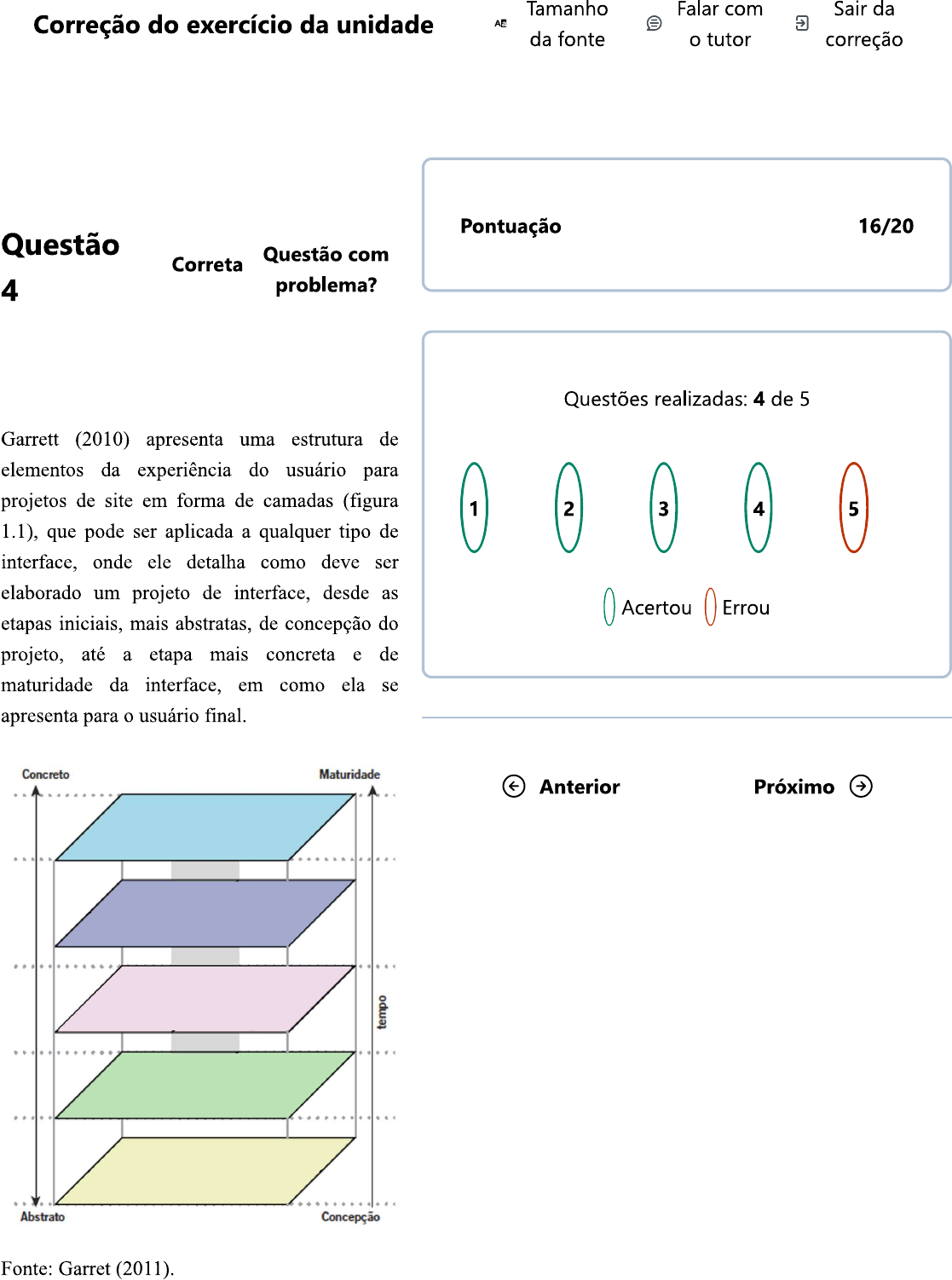 <p>Tamanho Falar com Sair da Correção do exercício da unidade da fonte o tutor correção Pontuação 16/20 Questão Questão com Correta 4 problema? Questões realizadas: 4 de 5 Garrett (2010) apresenta uma estrutura de elementos da experiência do usuário para projetos de site em forma de camadas (figura 1 2 3 4 5 1.1), que pode ser aplicada a qualquer tipo de interface, onde ele detalha como deve ser elaborado um projeto de interface, desde as Acertou Errou etapas iniciais, mais abstratas, de concepção do projeto, até a etapa mais concreta e de maturidade da interface, em como ela se apresenta para o usuário final. Concreto Maturidade Anterior Próximo Abstrato Concepção Fonte: Garret (2011).</p><p>Qual é a ordem correta dos elementos abaixo (da Concepção a Maturidade)? I. Design da informação, interface e navegação II. Necessidades do usuário e objetivos do site III. Design visual IV. Especificações funcionais e requisitos de conteúdo V. Design de interação e arquitetura da informação Assinale a alternativa CORRETA. Sua resposta Correta II - Comentário Os elementos da experiência do usuário apresentados por Garret (2011), da concepção à maturidade ficam na seguinte ordem: 1) Necessidades do usuário e objetivos do site; 2) Especificações funcionais e requisitos de conteúdo; 3) Design de interação e arquitetura da informação; 4) Design da informação, interface e navegação; 5) Design visual.</p>