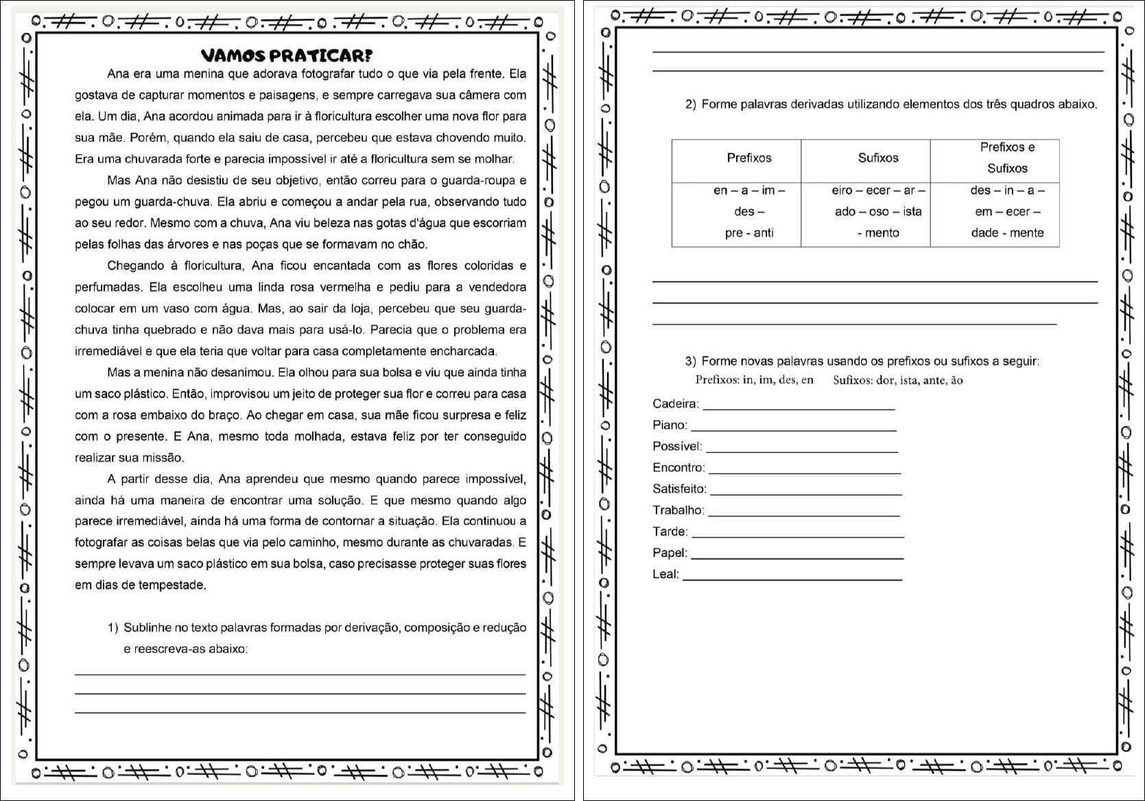 <p>VAMOS PRATICAR? Ana era uma menina que adorava fotografar tudo que via pela frente. Ela gostava de capturar momentos e paisagens, e sempre carregava sua câmera com 2) Forme palavras derivadas utilizando elementos dos três quadros ela. Um dia, Ana acordou animada para ir à floricultura escolher uma nova flor para sua mãe. Porém, quando ela saiu de casa, percebeu que estava chovendo muito. Prefixos e Era uma chuvarada forte e parecia impossível ir até a floricultura sem se molhar. Prefixos Sufixos Sufixos Mas Ana não desistiu de seu objetivo, então correu para o guarda-roupa e en-a-im- eiro - ecer - ar pegou um guarda-chuva. Ela abriu e começou a andar pela rua, observando tudo des - ado - oso - ista em - ecer ao seu redor. Mesmo com a chuva, Ana viu beleza nas gotas d'água que escorriam pre anti mento dade - mente pelas folhas das árvores e nas poças que se formavam no chão. Chegando à floricultura, Ana ficou encantada com as flores coloridas e perfumadas. Ela escolheu uma linda rosa vermelha e pediu para a vendedora colocar em um vaso com água. Mas, ao sair da loja, percebeu que seu guarda- chuva tinha quebrado e não dava mais para usá-lo. Parecia que o problema era irremediável e que ela teria que voltar para casa completamente encharcada. 3) Forme novas palavras usando os prefixos ou sufixos a seguir: Mas a menina não desanimou. Ela olhou para sua bolsa e viu que ainda tinha Prefixos: in, im, des, en Sufixos: dor, ista, ante, ão um saco plástico. Então, improvisou um jeito de proteger sua flor e correu para casa Cadeira: com a rosa embaixo do braço. Ao chegar em casa, sua mãe ficou surpresa e feliz Piano: com o presente. E Ana, mesmo toda molhada, estava feliz por ter conseguido Possível: realizar sua missão. Encontro: A partir desse dia, Ana aprendeu que mesmo quando parece impossível, Satisfeito: ainda há uma maneira de encontrar uma solução. E que mesmo quando algo Trabalho: parece irremediável, ainda há uma forma de contornar a situação. Ela continuou a Tarde: fotografar as coisas belas que via pelo caminho, mesmo durante as chuvaradas. E Papel: sempre levava um saco plástico em sua bolsa, caso precisasse proteger suas flores Leal: em dias de tempestade. 1) Sublinhe no texto palavras formadas por derivação, composição e redução e reescreva-as abaixo:</p><p>tudoportugues.com ATIVIDADE DE LÍNGUA PORTUGUESA ATIVIDADE DE LÍNGUA PORTUGUESA ESTUDANTE: ESTUDANTE: PROFESSOR (A): DATA: / / PROFESSOR (A): DATA: / / ESCOLA: TURMA: ESCOLA: TURMA: 1. Substantivo comum é uma palavra que se 3. Substantivo derivado é uma palavra o substantivo simples é um substantivo constituído por apenas um radical, que é a parte principal de refere a pessoas, lugares ou objetos. Nomeie formada a partir de outra palavra, como uma palavra. o substantivo composto é formado por mais de um radical, isto é, mais de uma palavra. corretamente os substantivos abaixo. papelaria, por exemplo. Leia o texto 1. Classifique as palavras abaixo destacando- 3. Ligue corretamente as palavras aos tipos de CIDADEZINHA QUALQUER as no quadro como substantivos simples ou substantivos. composto. Casas entre bananeiras Folha Vaivém Capim mulheres entre laranjeiras pomar amor cantar. Água Lua Corrida Bem-te-vi Um homem vai devagar. Sol Um cachorro vai Passatempo Amor Reco-Reco Um burro vai devagar. Girassol as janelas Embora Beija-Flor SIMPLES COMPOSTO Eta vida besta, meu Deus. SIMPLES COMPOSTO Carlos Drummond de Andrade Retire do texto dois substantivos derivados. Ultrassom Pedra Planalto 4. Circule as imagens cujos nomes são substantivos compostos. 2. o substantivo próprio se refere a nomes de pessoas, animais ou lugares. Reescreva as 4. o substantivo composto é formado por duas frases trocando as expressões grifadas por ou mais Escreva o nome dos um substantivo próprio. Siga o exemplo. substantivos compostos abaixo. 2. Reescreva os substantivos compostos abaixo de forma a) cachorro latiu alto. Arco + Lupy latiu alto Flor + cultura b) Aquela mulher correu muito. 5. Classifique as palavras abaixo com (S) para substantivo simples e para compostos. Guarda + Chuva ( ) Sábado ( ) Fome ( ) Dinheiro ( ) Passeio c) o garoto é amigo de Laura. Micro + ondas ( ) Saca-rolhas ( ) Varapau ( ) Panela ( ) Pontapé Água + ardente ( ) Paraquedas ( ) Professor ( ) Meio-dia ( ) Venda d) Adorei conhecer aquela cidade. Bate + papo ( ) Calor ( ) Terça-feira</p><p>tudoportugues.com tudoportugues.com ATIVIDADE DE LÍNGUA PORTUGUESA ATIVIDADE DE LÍNGUA PORTUGUESA ESTUDANTE: ESTUDANTE: PROFESSOR (A): DATA: / / PROFESSOR (A): DATA: / / ESCOLA: TURMA: ESCOLA: TURMA: o substantivo coletivo se refere a um grupo de pessoas, animais, objetos ou coisas em geral. Substantivo primitivo é a palavra que dá origem a outras palavras, sem derivar de nenhuma outra. 1. Para cada substantivo em destaque marque 5. Escreva os substantivos coletivos Leia o texto 4. Destaque os substantivos primitivos um X no coletivo correspondente. correspondentes às figuras. presentes nas frases abaixo. A FOLHA DE UMA ARVORE a) Frutas ( ) Cacho ( ) Ramos a) o vidro daquela escola quebrou. Era uma vez uma folha que vivia em uma b) Lenha ( ) Feixe ( ) Frota Ela passava seus dias balançando b) o cacho de banana já amadureceu. suavemente ao vento. A folha convivia com c) Amigos ( ) Multidão ( ) Galera outras folhas, mas era a mais brilhante e c) João Pedro é um menino muito bom. d) Cantores ( ) Bando ( ) Coral bonita de todas. A folha morava em uma e) Árvores ( ) Bosque ( ) Fardo árvore que servia de casa para muitos d) As flores do jardim são as mais belas. animais. Ela se sentia feliz por fazer parte de 2. Ligue corretamente os nomes dos animais um lugar tão especial. e) Maria escreveu uma carta para seu aos seus substantivos coletivos. 1. Retire do texto três substantivos primitivos. 5. Escreva as palavras que deram origem a cada substantivo abaixo. Bois Alcateia Pedreiro Casinha Cães Boiada Aves Revoada Gatos Matilha 