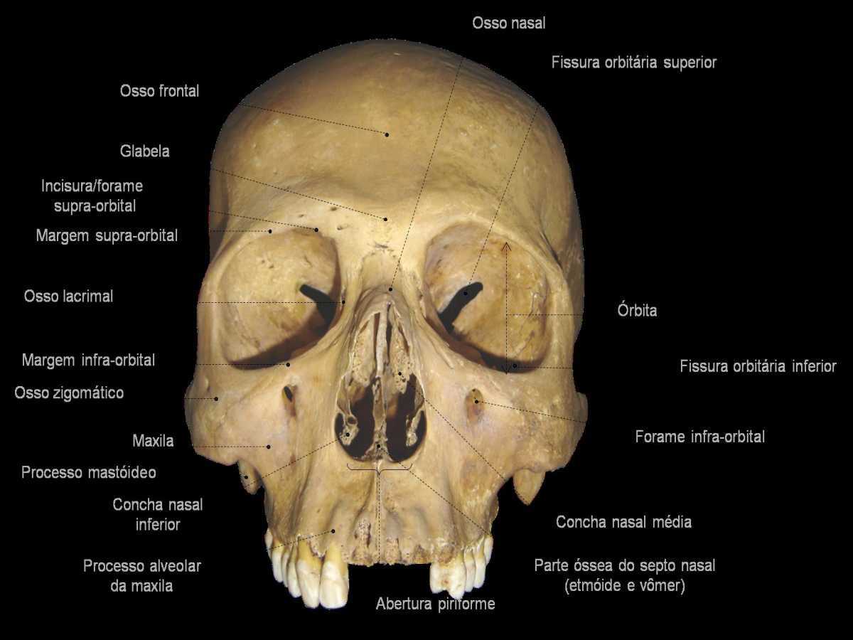 <p>Osso nasal Fissura orbitária superior Osso frontal Glabela Incisura/forame supra-orbital Margem supra-orbital Osso lacrimal Órbita Margem infra-orbital Fissura orbitária infer Osso zigomático Maxila Forame infra-orbital Processo mastóideo Concha nasal inferior Concha nasal média Processo alveolar Parte óssea do septo nasal da maxila (etmóide e vômer) Abertura piriforme</p>
