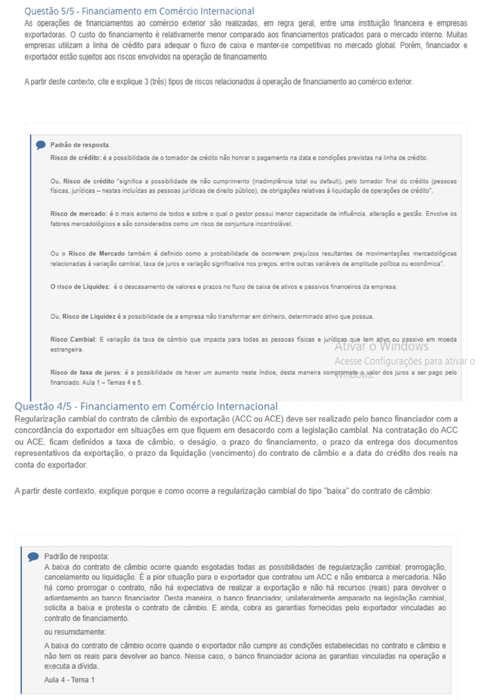 <p>Questão 5/5 Financiamento em Comércio Internacional As operações de financiamentos ao comércio exterior são realizadas, em regra geral, entre uma instituição financeira e empresas exportadoras. custo do financiamento é relativamente menor comparado aos financiamentos praticados para 0 mercado interno. Muitas empresas utilizam a linha de crédito para adequar 0 fluxo de caixa e manter-se competitivas no mercado global. Porém, financiador e exportador estão sujeitos aos riscos envolvidos na operação de financiamento. A partir deste contexto, cite e explique 3 (três) tipos de riscos relacionados à operação de financiamento ao comércio Padrão de resposta. Risco de crédito: é a possibilidade de tomador de crédito não honrar pagamento na data e condições previstas na linha de crédito. Risco de crédito "significa a possibilidade de não cumprimento (inadimplência total ou pelo tomador final do crédito (pessoas físicas, jurídicas nestas incluídas as pessoas jurídicas de direito de obrigações relativas à liquidação de operações de Risco de mercado: é mais externo de todos e sobre qual gestor possui menor capacidade de alteração e gestão. Envolve os fatores mercadológicos e são considerados como um risco de conjuntura Ou Risco de Mercado também é definido como a probabilidade de ocorrerem prejuízos resultantes de movimentações mercadológicas relacionadas à variação taxa de juros e variação significativa nos entre outras variáveis de amplitude política ou econômica". risco de Liquidez: é descasamento de valores e prazos no fluxo de caixa de ativos e passivos financeiros da empresa. Ou, Risco de Liquidez é a possibilidade de a empresa não transformar em determinado ativo que possua. Risco Cambial: E variação da taxa de câmbio que impacta para todas as pessoas físicas e tem ativo, ou passivo em moeda estrangeira. Ativar Windows Acesse Configurações para ativar Risco de taxa de juros: é a possibilidade de haver um aumento neste desta maneira compromete valor dos juros a ser pago pelo financiado. Aula 1 Temas 4 e 5. Questão 4/5 Financiamento em Comércio Internacional Regularização cambial do contrato de câmbio de exportação (ACC ou ACE) deve ser realizado pelo banco financiador com a concordância do exportador em situações em que fiquem em desacordo com a legislação Na contratação do ACC ou ACE, ficam definidos a taxa de câmbio, deságio, prazo do financiamento, prazo da entrega dos documentos representativos da prazo da liquidação (vencimento) do contrato de câmbio e a data do crédito dos reais na conta do exportador. A partir deste contexto, explique porque e como ocorre a regularização cambial do tipo "baixa" do contrato de câmbio: Padrão de resposta: A baixa do contrato de câmbio ocorre quando esgotadas todas as possibilidades de regularização cambial: prorrogação, cancelamento ou liquidação. É a situação para exportador que contratou um ACC e não embarca a mercadoria. Não há como prorrogar 0 contrato, não há expectativa de realizar a exportação e não há recursos (reais) para devolver 0 adiantamento ao banco financiador. Desta maneira, banco financiador, unilateralmente amparado na legislação cambial, solicita a baixa e protesta contrato de câmbio. E ainda, cobra as garantias fornecidas pelo exportador vinculadas ao contrato de ou resumidamente: A baixa do contrato de câmbio ocorre quando exportador não cumpre as condições estabelecidas no contrato e câmbio e não tem os reais para devolver ao banco. Nesse caso, 0 banco financiador as garantias vinculadas na operação e executa a Aula 4 Tema 1</p><p>Questão 3/5 Financiamento em Comércio Internacional Os financiamentos à exportação são linhas de crédito disponíveis pelas instituições financeiras às empresas exportadoras. Os financiamentos visam proporcionar vantagens financeiras e adequação ao fluxo de caixa às empresas que os utilizam. o Pré-Pagamento Exportação (PPE) consiste na antecipação de recursos em moeda estrangeira pelo importador, instituições financeiras ou outras pessoas jurídicas no exterior ao exportador brasileiro. A partir deste contexto, informe momento que é concedido financiamento ao exportador em relação à data de embarque e que diferencia financiamento "Pré-pagamento" do pagamento antecipado. Padrão de resposta o pré-pagamento de exportação é um financiamento concedido ao exportador na fase de produção; ou antes do embarque da mercadoria; ou simplesmente na fase pré-embarque; ou antes do embarque. o PPE se diferencia do pagamento antecipado devido à origem dos recursos. No pagamento antecipado, 0 importador paga 0 exportador com recursos próprios. Já no PPE, 0 importador os recursos junto ao seu banco de relacionamento no exterior para pagar 0 exportador brasileiro ou 0 exportador brasileiro negocia diretamente com 0 banco no exterior para receber os recursos antecipados, sendo que os recursos pagos pelo importador serão destinados para pagar 0 banco financiador. Aula 5 Tema 2. Questão 2/5 Financiamento em Comércio Internacional o financiamento à importação é ima linha de crédito disponível às empresas compradoras de produto no exterior. financiamento visa proporcionar aos importadores vantagens financeiras, entre elas a adequação ao fluxo de caixa. Desde início da operação até pagamento da dívida pelo importador ocorrem várias etapas realizadas pelos envolvidos (importador, exportador e banco). A partir deste contexto, apresente 5 (cinco) vantagens que importador procura obter ao contratar financiamento à importação: Padrão de resposta Alongar 0 prazo de pagamento; Não utilizar capital próprio para não descasar 0 fluxo de caixa; Aumentar 0 potencial de produção ou comercialização; Negociar taxas de juros similares às praticadas no mercado internacional; Manter-se competitivo no mercado interno ou externo para aquelas que se beneficiam do 