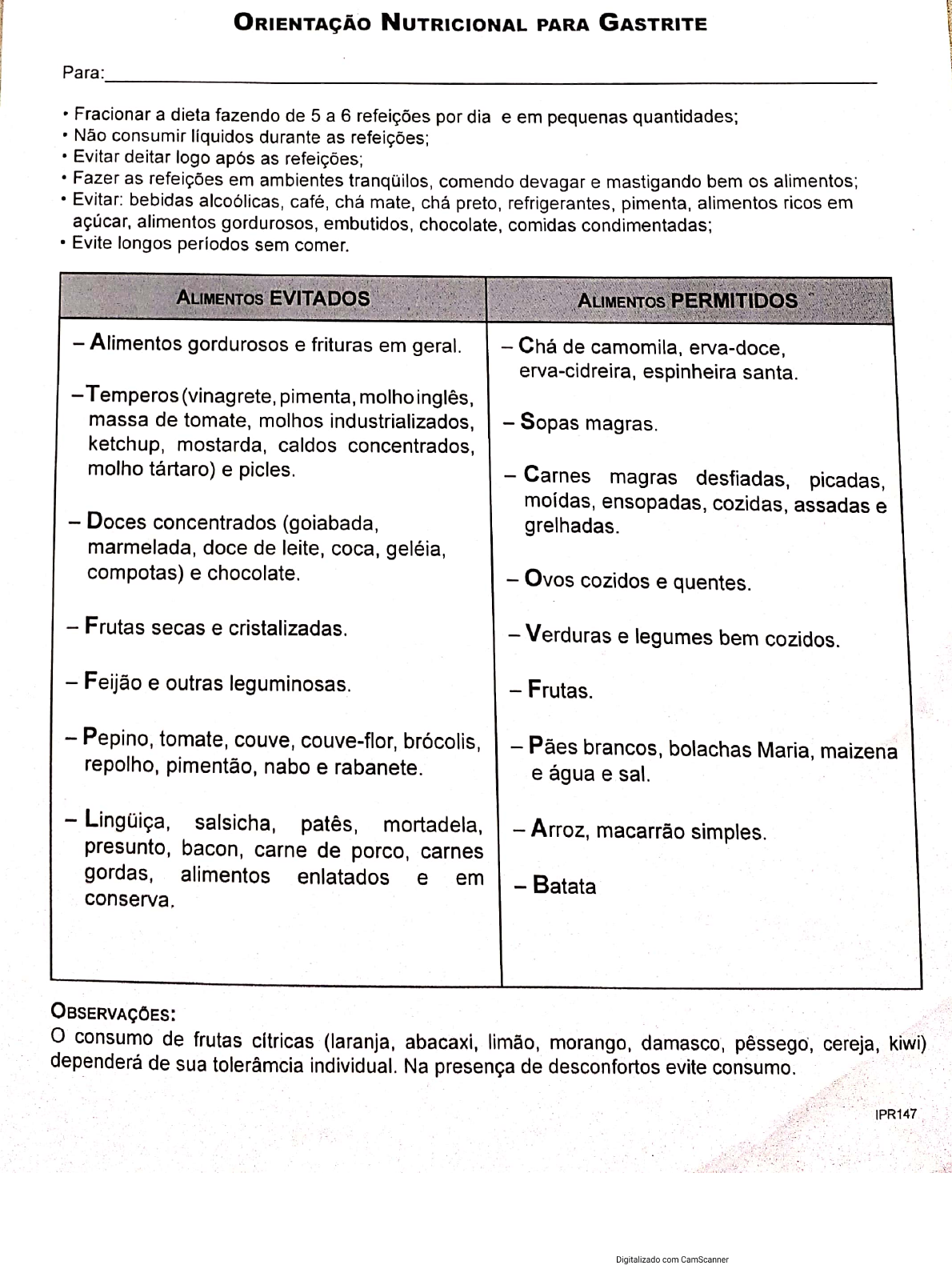 <p>ORIENTAÇÃO NUTRICIONAL PARA GASTRITE Para: Fracionar a dieta fazendo de 5 a 6 refeições por dia e em pequenas quantidades; Não consumir líquidos durante as refeições; Evitar deitar logo após as refeições; Fazer as refeições em ambientes comendo devagar e mastigando bem os alimentos; Evitar: bebidas alcoólicas, chá mate, chá preto, refrigerantes, pimenta, alimentos ricos em açúcar, alimentos gordurosos, embutidos, chocolate, comidas Evite longos períodos sem comer. ALIMENTOS EVITADOS ALIMENTOS PERMITIDOS - Alimentos gordurosos e frituras em geral. Chá de camomila, erva-doce, erva-cidreira, espinheira santa. Temperos (vinagrete, pimenta, massa de tomate, molhos industrializados, - Sopas magras. ketchup, mostarda, caldos concentrados, molho tártaro) e picles. - Carnes magras desfiadas, picadas, ensopadas, cozidas, assadas e Doces concentrados (goiabada, grelhadas. marmelada, doce de leite, coca, geléia, compotas) e chocolate. - Ovos cozidos e quentes. - Frutas secas e cristalizadas. Verduras e legumes bem cozidos. Feijão e outras leguminosas. - Frutas. Pepino, tomate, couve, couve-flor, brócolis, - Pães brancos, bolachas Maria, maizena repolho, pimentão, nabo e rabanete. e água e sal. salsicha, patês, mortadela, - Arroz, macarrão simples. presunto, bacon, carne de porco, carnes gordas, alimentos enlatados e em - Batata conserva. OBSERVAÇÕES: consumo de frutas (laranja, abacaxi, limão, morango, damasco, pêssego, cereja, kiwi) dependerá de sua tolerâmcia individual. Na presença de desconfortos evite IPR147 Digitalizado com CamScanner</p>