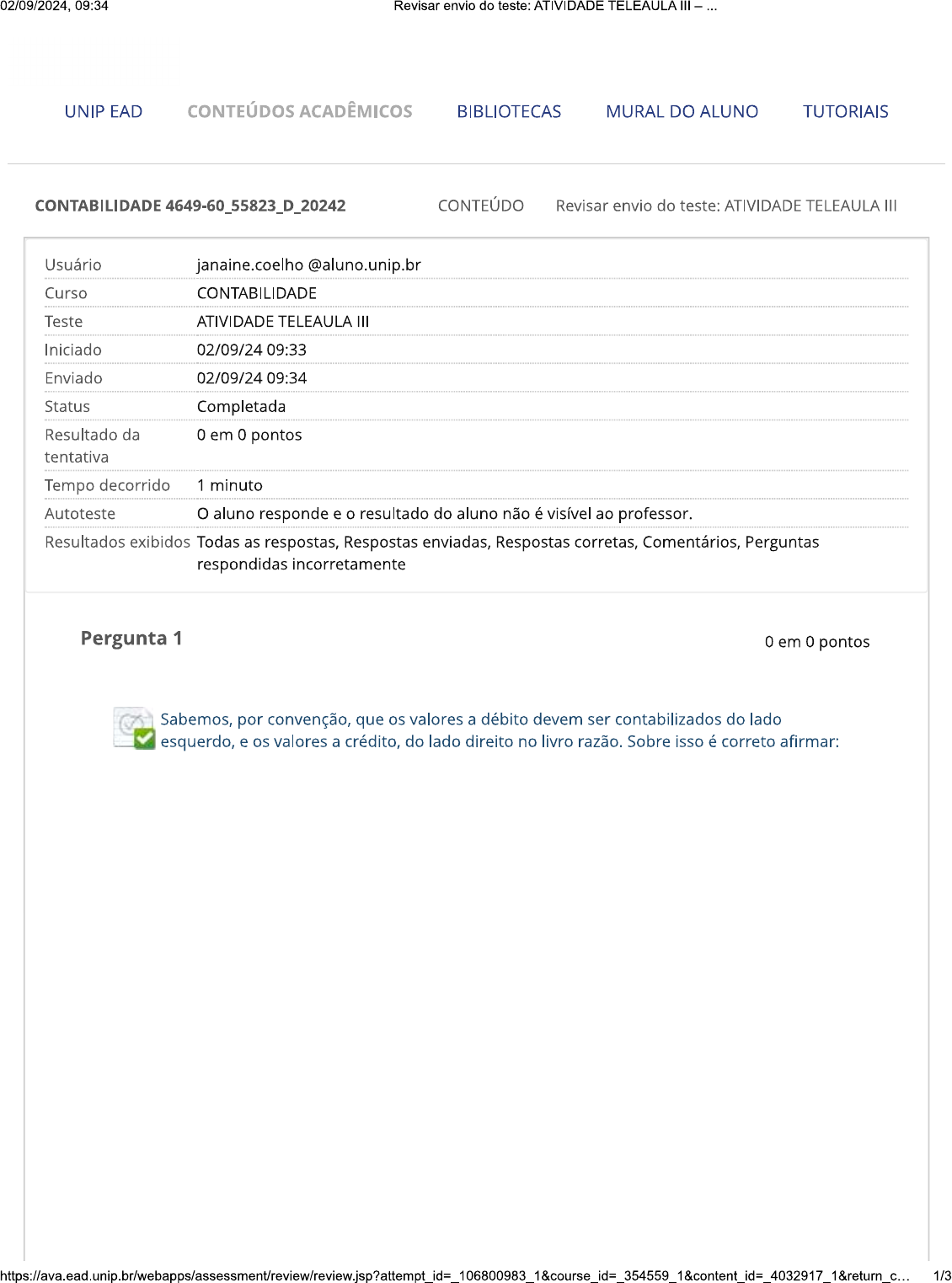 <p>02/09/2024, 09:34 Revisar envio do teste: ATIVIDADE TELEAULA III - UNIP EAD CONTEÚDOS ACADÊMICOS BIBLIOTECAS MURAL DO ALUNO TUTORIAIS CONTABILIDADE 4649-60_55823_D_20242 CONTEÚDO Revisar envio do teste: ATIVIDADE TELEAULA III Usuário janaine.coelho@aluno.unip.br Curso CONTABILIDADE Teste ATIVIDADE TELEAULA III Iniciado 02/09/24 09:33 Enviado 02/09/24 09:34 Status Completada Resultado da 0 em 0 pontos tentativa Tempo decorrido 1 minuto Autoteste O aluno responde e o resultado do aluno não é visível ao professor. Resultados exibidos Todas as respostas, Respostas enviadas, Respostas corretas, Comentários, Perguntas respondidas incorretamente Pergunta 1 0 em 0 pontos Sabemos, por convenção, que os valores a débito devem ser contabilizados do lado esquerdo, e os valores a crédito, do lado direito no livro razão. Sobre isso é correto afirmar: 1/3</p><p>02/09/2024, 09:34 Revisar envio do teste: ATIVIDADE TELEAULA III - ... Resposta d. Selecionada: Esta convenção é mantida devido ao fato de ser compreendida universalmente. Respostas: a. Esta forma facilita a compreensão para o professor e para o aluno. b. Dessa forma, as demonstrações contábeis são compreendidas por todo o Brasil. C. Esta forma facilita a vida dos usuários e profissionais da área. d. Esta convenção é mantida devido ao fato de ser compreendida universalmente. e. A convenção somente é válida para o estado de São Paulo, uma vez que cada estado tem uma convenção própria. Comentário da resposta: Resposta: d) Pergunta 2 0 em 0 pontos A equação fundamental do patrimônio pode ser enunciada como: Resposta Selecionada: Patrimônio líquido = ativo - passivo a. Respostas: a. Patrimônio líquido = ativo - passivo b. Patrimônio líquido = 2 X ativo - Patrimônio líquido = passivo C. d. Patrimônio líquido = capital nominal e. Patrimônio líquido = capital social Comentário da resposta: Resposta: a) Pergunta 3 0 em 0 pontos As receitas líquidas de vendas são compostas da seguinte forma:</p><p>02/09/2024, 09:34 Revisar envio do teste: ATIVIDADE TELEAULA III - Resposta C. Selecionada: Receita bruta deduzindo as devoluções e abatimentos, descontos comerciais e impostos sobre vendas. Respostas: Receita operacional - despesas operacionais. a. b. Receitas e despesas operacionais - receitas e despesa não operacionais. Receita bruta deduzindo as devoluções e abatimentos, descontos comerciais e impostos sobre vendas. d. Receita bruta - despesas totais. Receitas - descontos comerciais. e. Comentário da resposta: Resposta: c) Pergunta 4 0 em 0 pontos São exemplos de contas do subgrupo ativo circulante: Resposta Selecionada: Caixa, bancos, aplicações financeiras e estoques. a. Respostas: a. Caixa, bancos, aplicações financeiras e estoques. b. Investimento, imobilizado e caixa. Intangível, imobilizado e investimentos. C. d. Caixa, investimentos e bancos. Caixa e intangível. e. Comentário da resposta: Resposta: a) Segunda-feira, 2 de Setembro de 2024 09h34min53s BRT OK</p>