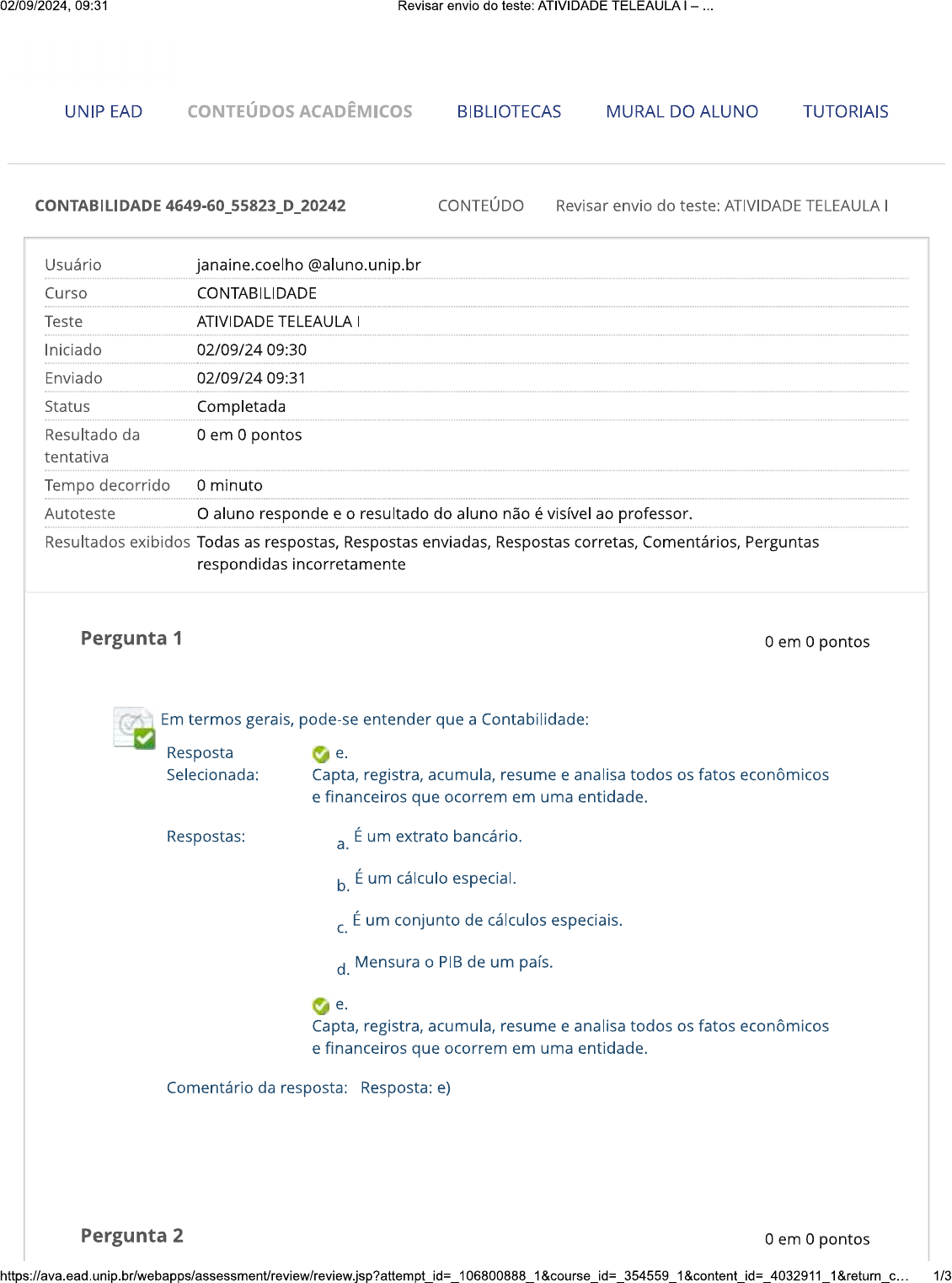 <p>02/09/2024, 09:31 Revisar envio do teste: ATIVIDADE TELEAULA - UNIP EAD CONTEÚDOS ACADÊMICOS BIBLIOTECAS MURAL DO ALUNO TUTORIAIS CONTABILIDADE D 20242 CONTEÚDO Revisar envio do teste: ATIVIDADE TELEAULA Usuário janaine.coelho@aluno.unip.br Curso CONTABILIDADE Teste ATIVIDADE TELEAULA Iniciado 02/09/24 09:30 Enviado 02/09/24 09:31 Status Completada Resultado da 0 em 0 pontos tentativa Tempo decorrido 0 minuto Autoteste O aluno responde e o resultado do aluno não é visível ao professor. Resultados exibidos Todas as respostas, Respostas enviadas, Respostas corretas, Comentários, Perguntas respondidas incorretamente Pergunta 1 0 em 0 pontos Em termos gerais, pode-se entender que a Contabilidade: Resposta e. Selecionada: Capta, registra, acumula, resume e analisa todos os fatos econômicos e financeiros que ocorrem em uma entidade. Respostas: É um extrato bancário. a. b. É um cálculo especial. É um conjunto de cálculos especiais. C. d. Mensura PIB de um país. e. Capta, registra, acumula, resume e analisa todos os fatos econômicos e financeiros que ocorrem em uma entidade. Comentário da resposta: Resposta: e) Pergunta 2 0 em 0 pontos 1/3</p><p>02/09/2024, 09:31 Revisar envio do teste: ATIVIDADE TELEAULAI-... Quando o conjunto de bens e direitos (ativo) é maior que o conjunto de obrigações. Por consequência, o patrimônio líquido é maior que zero, isso designa que tipo de situação? Resposta Selecionada: b. Positiva. Respostas: a. Negativa. b. Positiva. Mista. C. Neutra. d. NDA. e. Comentário da resposta: Resposta: b) Pergunta 3 0 em 0 pontos objeto da Contabilidade é: Resposta x O estudo sobre as variações ocorridas no patrimônio da empresa. a. Selecionada: Respostas: O estudo sobre as variações ocorridas no patrimônio da empresa. a. b. Proporcionar ganhos para a empresa. Ajudar os proprietários da empresa a aumentarem as vendas. C. O estudo sobre as variações ocorridas tanto no patrimônio da empresa, quanto no dos sócios, e registro de todas em demonstrações e. Atender somente ao fisco sobre os resultados gerados pela empresa. Pergunta 4 0 em 0 pontos Das alternativas a seguir, assinalar a que representa uma origem de terceiros: Resposta Selecionada: d. Fornecedores. 2/3</p><p>02/09/2024, 09:31 Revisar envio do teste: ATIVIDADE TELEAULAI- ... Respostas: Veículos. a. b. Capital social. Estoques. C. d. Fornecedores. Bancos. e. Comentário da resposta: Resposta: d) Segunda-feira, 2 de Setembro de 2024 09h31min06s BRT OK 3/3</p>