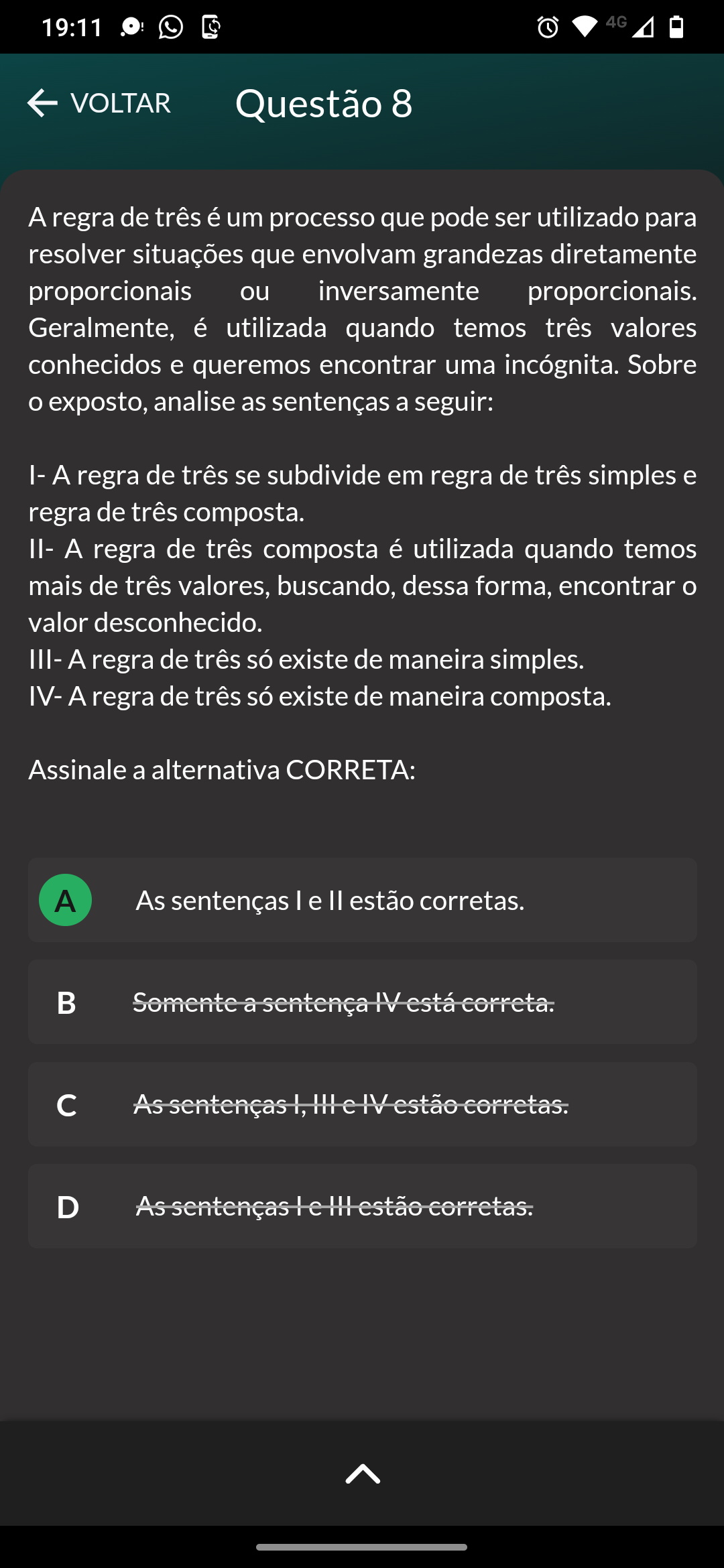 <p>19:11 4G VOLTAR Questão 8 A regra de três é um processo que pode ser utilizado para resolver situações que envolvam grandezas diretamente proporcionais ou inversamente proporcionais. Geralmente, é utilizada quando temos três valores conhecidos e queremos encontrar uma incógnita. Sobre exposto, analise as sentenças a seguir: I- A regra de três se subdivide em regra de três simples e regra de três composta. II- A regra de três composta é utilizada quando temos mais de três valores, buscando, dessa forma, encontrar O valor desconhecido. III- A regra de três só existe de maneira simples. IV- A regra de três só existe de maneira composta. Assinale a alternativa CORRETA: A As sentenças I e II estão corretas. B Somente a IV está correta. C IVestão corretas. D As estão corretas.</p>