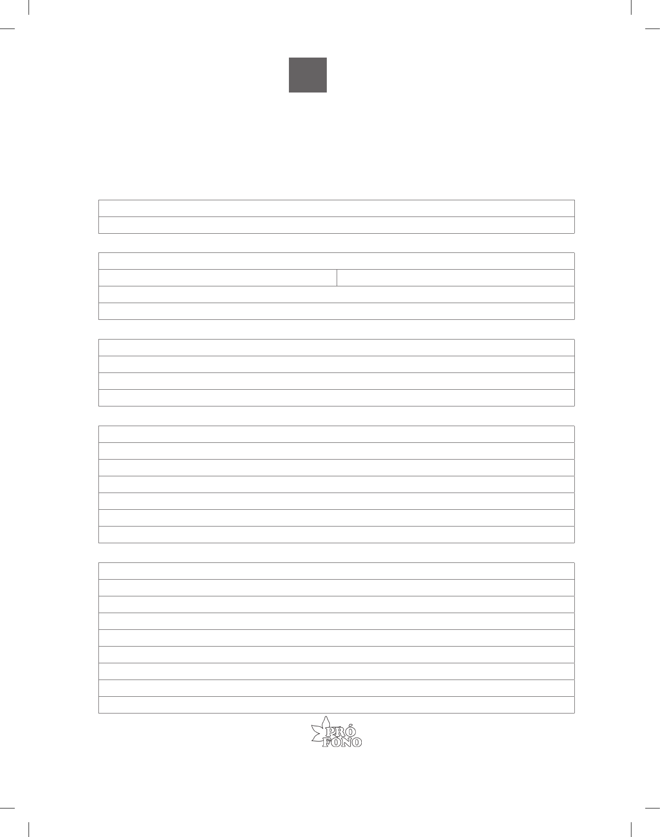 <p>Série Fonoaudiologia na Prática HoSPitalar</p><p>1</p><p>ANAMNESE</p><p>Data da avaliação:</p><p>Responsável:</p><p>1) Identificação.</p><p>Nome:</p><p>Data de Nascimento (DN): Idade:</p><p>Peso atual:</p><p>Nome da mãe:</p><p>2) Internação Hospitalar.</p><p>Tempo de internação:</p><p>Diagnósticos de internação:</p><p>Queixas relativas à deglutição:</p><p>Medicações atuais:</p><p>3) Antecedentes.</p><p>Internações prévias/motivos:</p><p>Intercorrências pré-natais:</p><p>Intercorrências perinatais:</p><p>Idade gestacional:</p><p>IOT:</p><p>Problemas cardíacos:</p><p>Problemas respiratórios:</p><p>4) Histórico Alimentar.</p><p>Posição:</p><p>Duração:</p><p>Via alternativa de alimentação:</p><p>Consistências introduzidas:</p><p>Quantidade:</p><p>Utensílios utilizados:</p><p>Intercorrências durante a alimentação:</p><p>Estado nutricional:</p><p>Alergias alimentares ou intolerância:</p><p>Editores Científicos: Claudia Regina Furquim de Andrade; Suelly Cecilia Olivan Limongi.</p><p>Número 1</p><p>PROtOCOLO PARA AvALiAçãO CLíNiCA dA diSFAgiA PEdiátRiCA (PAd-PEd)</p><p>Fabíola Custódio Flabiano-Almeida; Karina Elena Bernardis Bühler; Suelly Cecilia Olivan Limongi.</p><p>Sé</p><p>rie</p><p>FONO</p><p>AudiO</p><p>LOgiA</p><p>NA PRátiCA</p><p>hOSPitALAR</p><p>Número 1. Protocolo de AvAliAção clíNicA dA disfAgiA PediátricA (PAd-Ped)</p><p>2</p><p>AvALiAçãO CLíNiCA dA diSFAgiA PEdiátRiCA (PAd-PEd)</p><p>Data da avaliação:</p><p>Nome:</p><p>1) Condições Clínicas.</p><p>Via de alimentação: 5 SNG 5 SNE 5 SOG 5 SOE 5 VO</p><p>Respiração: 5 ar ambiente 5 suporte respiratório</p><p>5 CPAP 5 BIPAP 5 oxitenda</p><p>5 venturi ____ % 5 nebulização 5 catéter O2 ____ l/minuto</p><p>2) Sinais Vitais Prévios à Oferta.</p><p>FC ______ bpm (Referência: < 2 anos: 80 a 160; entre 2 e 10 anos: 70 a 120; > 10 anos: 60 a 100)</p><p>FR ______ rpm (Referência: < 1 ano: 30 a 40; entre 1 e 10 anos: 20 a 30; > 10 anos: 18 a 20)</p><p>SpO2 _____ % (Referência: > 95%)</p><p>Observação:</p><p>3) Exame Estrutural e Funcional.</p><p>Lábios:</p><p>Postura durante o repouso: 5 ocluídos 5 entreabertos</p><p>Tônus: 5 adequado 5 aumentado 5 diminuído</p><p>Mobilidade: 5 protrusão 5 retração simétrica</p><p>Língua:</p><p>Postura durante o repouso: 5 papila 5 assoalho bucal 5 interposta 5 simétrica 5 assimétrica</p><p>Tônus: 5 adequado 5 aumentado 5 diminuído</p><p>Mobilidade: 5 protrusão em linha média 5 desvio à _____________</p><p>Presença de: 5 tremores 5 fasciculações 5 atrofia</p><p>Bochechas:</p><p>Tônus: 5 adequado 5 aumentado 5 diminuído</p><p>Dentes:</p><p>5 ausência 5 presença 5 falhas 5 BEC 5 MEC</p><p>Palato duro:</p><p>5 adequado 5 alto</p><p>Palato mole:</p><p>5 adequado 5 alterado</p><p>Qualidade vocal:</p><p>5 normal 5 rouca 5 soprosa 5 molhada 5 anasalada</p><p>4) Avaliação da Deglutição de Saliva.</p><p>Aspecto da mucosa oral: 5 adequado 5 xerostomia</p><p>Frequência de deglutição de saliva: 5 adequada 5 sialoestase 5 sialorreia</p><p>Série Fonoaudiologia na Prática HoSPitalar</p><p>3</p><p>Ausculta cervical de base: 5 normal 5 alterada durante a deglutição 5 alterada após a deglutição</p><p>5 alterada sem piora após a deglutição 5 alterada com piora após a deglutição</p><p>Ocorrências: 5 tosse 5 engasgo 5 cianose 5 palidez 5 desconforto respiratório</p><p>5) Sucção Não Nutritiva - SNN (dedo enluvado ou chupeta).</p><p>Reflexo de procura: 5 presente 5 ausente (referência: presente até os três meses)</p><p>Pressão intraoral: 5 adequada 5 diminuída</p><p>Padrão de sucção: 5 adequado 5 inadequado</p><p>Frequência de deglutição de saliva: 5 adequada 5 inadequada</p><p>Ocorrências: 5 cianose 5 náusea 5 engasgo 5 tosse 5 palidez 5 desconforto respiratório</p><p>6) Avaliação com Alimento.</p><p>Seio materno:</p><p>5 vedamento labial adequado 5 escape oral pelas comissuras labiais</p><p>5 pega adequada 5 pega inadequada</p><p>5 relação frequência de sucções/deglutição ________________</p><p>5 pausas adequadas 5 ausência de pausas</p><p>5 coordenação sucção-respiração-deglutição 5 incoordenação</p><p>Ausculta cervical:</p><p>5 normal 5 alterada de base sem piora após a oferta</p><p>5 alterada de base com piora após a oferta 5 alterada durante a oferta</p><p>5 alterada após a oferta</p><p>Qualidade vocal:</p><p>5 não alterada após a oferta 5 alterada após a oferta com clareamento espontâneo</p><p>5 alterada após a oferta sem clareamento espontâneo</p><p>Sinais vitais:</p><p>5 manutenção durante a oferta (referência variação < 5% do valor basal)</p><p>5 alteração durante a oferta: FC ______ FR ______ SpO2 _____</p><p>Ocorrências:</p><p>5 tosse eficaz 5 tosse ineficaz ou tardia 5 engasgo 5 cianose 5 palidez</p><p>5 desconforto respiratório 5 náusea 5 vômito 5 refluxo nasal</p><p>5 recusa alimentar</p><p>Tempo de alimentação: ___________</p><p>Líquido fino (mamadeira ou canudo):</p><p>5 bico comum 5 bico ortodôntico 5 canudo</p><p>5 vedamento labial 5 escape oral pelas comissuras labiais</p><p>5 preensão adequada do bico/canudo 5 preensão inadequada do bico/ canudo</p><p>5 relação frequência de sucções/deglutição ________________</p><p>5 pausas adequadas 5 ausência de pausas</p><p>5 coordenação sucção-respiração-deglutição 5 incoordenação</p><p>5 tempo de trânsito oral adequado 5 tempo de trânsito oral aumentado</p><p>5 elevação laríngea presente 5 elevação laríngea ausente</p><p>Número 1. Protocolo de AvAliAção clíNicA dA disfAgiA PediátricA (PAd-Ped)</p><p>4</p><p>Ausculta cervical:</p><p>5 normal 5 alterada de base sem piora após a oferta</p><p>5 alterada de base com piora após a oferta 5 alterada durante a oferta</p><p>5 alterada após a oferta</p><p>Qualidade vocal:</p><p>5 não alterada após a oferta 5 alterada após a oferta com clareamento espontâneo</p><p>5 alterada após a oferta sem clareamento esp