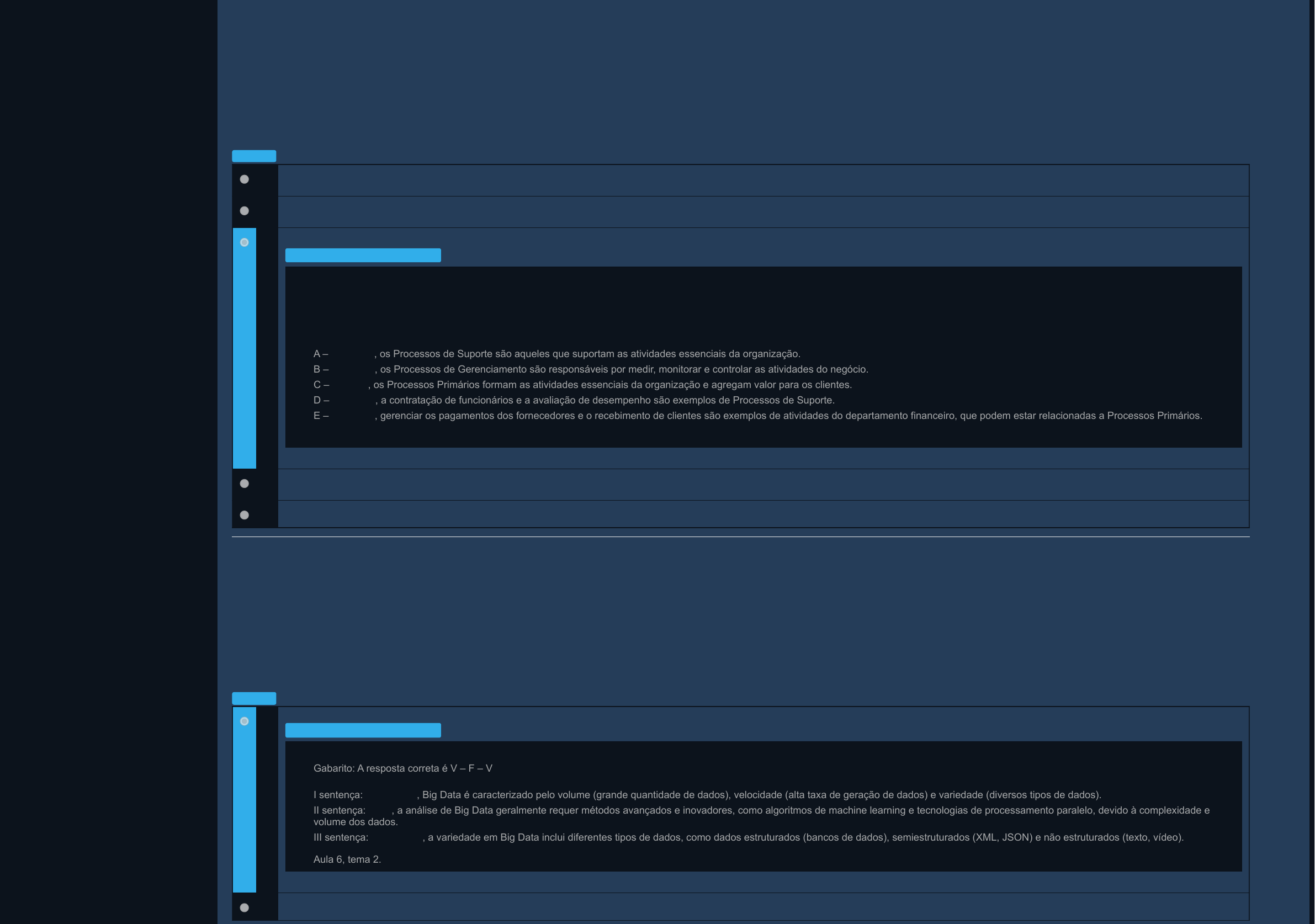 <p>Questão 1/10 - Sistemas de Informações Contábeis e Gerenciais</p><p>Leia o texto a seguir:</p><p>No contexto de gestão de processos, o BPM (Business Process Management) é um modelo de gestão que busca administrar todo o ciclo produtivo da organização e a melhoria contínua dos processos. O BPM classifica os</p><p>processos de negócios em três tipos principais: Processos Primários, Processos de Suporte e Processos de Gerenciamento. (Fonte: Rota de aula 4, tema 2)</p><p>COMANDO:</p><p>Com base no texto, os Processos Primários são aqueles que:</p><p>Nota: 10.0</p><p>A Suportam as atividades essenciais da organização.</p><p>B São responsáveis por medir, monitorar e controlar as atividades do negócio.</p><p>C Formam as atividades essenciais da organização e agregam valor para os clientes.</p><p>Você assinalou essa alternativa (C)</p><p>D Envolvem a contratação de funcionários e a avaliação de desempenho.</p><p>E Gerenciam os pagamentos dos fornecedores e o recebimento de clientes.</p><p>Questão 2/10 - Sistemas de Informações Contábeis e Gerenciais</p><p>Big Data refere-se à coleta, armazenamento e análise de grandes volumes de dados complexos, provenientes de diversas fontes e formatos, em alta velocidade. As empresas utilizam Big Data para melhorar a tomada de</p><p>decisões, identificar tendências de mercado, personalizar ofertas para clientes, otimizar operações, prever comportamentos futuros e desenvolver novos produtos e serviços.</p><p>Com base no texto, ANALISE as sentenças a seguir, assinalando V para as afirmativas verdadeiras e F para as afirmativas falsas em relação a esse contexto:</p><p>I. ( ) Big Data se caracteriza pelo volume, velocidade e variedade dos dados.</p><p>II. ( ) A análise de Big Data utiliza exclusivamente métodos tradicionais de processamento de dados.</p><p>III. ( ) A variedade em Big Data refere-se aos diferentes tipos de dados, como estruturados, semiestruturados e não estruturados.</p><p>Dessa maneira, a sequência correta é:</p><p>Nota: 10.0</p><p>A V – F – V</p><p>Você assinalou essa alternativa (A)</p><p>B F – V – F</p><p>Você acertou!</p><p>Gabarito:</p><p>A sequência correta é: Formam as atividades essenciais da organização e agregam valor para os clientes.</p><p>COMENTÁRIOS:</p><p>A – Incorreta, os Processos de Suporte são aqueles que suportam as atividades essenciais da organização.</p><p>B – Incorreta, os Processos de Gerenciamento são responsáveis por medir, monitorar e controlar as atividades do negócio.</p><p>C – Correta, os Processos Primários formam as atividades essenciais da organização e agregam valor para os clientes.</p><p>D – Incorreta, a contratação de funcionários e a avaliação de desempenho são exemplos de Processos de Suporte.</p><p>E – Incorreta, gerenciar os pagamentos dos fornecedores e o recebimento de clientes são exemplos de atividades do departamento financeiro, que podem estar relacionadas a Processos Primários.</p><p>Referências: Aula 4, tema 2.</p><p>Você acertou!</p><p>Gabarito: A resposta correta é V – F – V</p><p>COMENTÁRIOS</p><p>I sentença: verdadeira, Big Data é caracterizado pelo volume (grande quantidade de dados), velocidade (alta taxa de geração de dados) e variedade (diversos tipos de dados).</p><p>II sentença: falsa, a análise de Big Data geralmente requer métodos avançados e inovadores, como algoritmos de machine learning e tecnologias de processamento paralelo, devido à complexidade e</p><p>volume dos dados.</p><p>III sentença: verdadeira, a variedade em Big Data inclui diferentes tipos de dados, como dados estruturados (bancos de dados), semiestruturados (XML, JSON) e não estruturados (texto, vídeo).</p><p>Aula 6, tema 2.</p><p>C V – V – F</p><p>D F – F – V</p><p>E V – F – F</p><p>Questão 3/10 - Sistemas de Informações Contábeis e Gerenciais</p><p>Leia o texto a seguir:</p><p>O fluxo de informações das áreas operacionais para a contabilidade é um processo fundamental para garantir que as operações empresariais sejam refletidas com precisão nos relatórios financeiros. Esse fluxo envolve a</p><p>coleta, a transformação e a integração de dados de várias áreas operacionais, como vendas, produção e recursos humanos, para a contabilidade.</p><p>A integração eficiente dessas informações permite uma visão holística do desempenho organizacional, facilitando a tomada de decisões estratégicas e a conformidade regulatória. (Rota de aula 4, tema 3)</p><p>Considerando o contexto, AVALIE as afirmações seguintes.</p><p>I – A integração eficiente das informações operacionais com a contabilidade permite uma visão detalhada e precisa das operações empresariais, facilitando a tomada de decisões estratégicas.</p><p>II – O fluxo de informações das áreas operacionais para a contabilidade pode ser realizado de forma independente, sem a necessidade de integração com outros sistemas de informação.</p><p>III – A transformação dos dados operacionais em informações contábeis requer a aplicação de processos e procedimentos específicos para garantir a precisão e a relevância das informações.</p><p>É correto o que se afirma em:</p><p>Nota: 10.0</p><p>A I, apenas.</p><p>B III, apenas.</p><p>C I e III, apenas.</p><p>Você assinalou essa alternativa (C)</p><p>D II e III, apenas</p><p>E I, II e III</p><p>Questão 4/10 - Sistemas de Informações Contábeis e Gerenciais</p><p>No ambiente do Sistema de Informação Contábil, o sistema é definido por tudo aquilo que está fora dos limites de um sistema, composto por todos os demais sistemas que fornecem e recebem dados do sistema de referência.</p><p>Os sistemas de informação contábil se expandem até os limites do sistema empresa, consolidando-se como o maior e mais importante sistema de informação dentro da organização.</p><p>ENUNCIADO</p><p>ANALISE as sentenças a seguir, assinalando V para as afirmativa