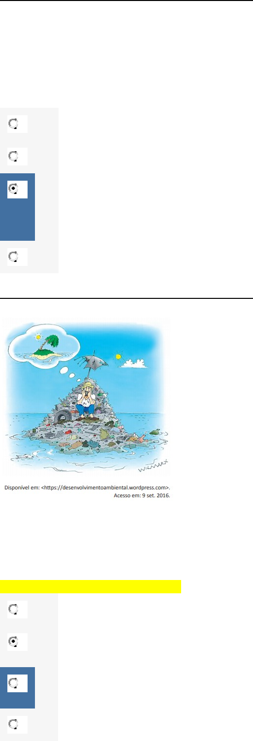 <p>Questão 1/10 - Ciências do Ambiente e Sustentabilidade</p><p>O que temos nós, os seres humanos, em comum com os porcos e com anchovas encontradas no Peru e no Chile? O fato de ocuparmos mais ou menos a mesma posição que eles na cadeia alimentar global. Esta é a conclusão de uma equipe de cientistas franceses que, pela primeira vez, avaliou o nosso ranking na grande teia mundial dos alimentos. Este ranking tem uma denominação teórica. Adaptado de https://www.publico.pt/2013/12/06/ciencia/noticia/cientistas-calcularam-ranking-dos-seres-humanos-na-cadeia-alimentar-1615179, para fins acadêmicos</p><p>Assinale a opção correta quanto à denominação teórica do ranking citado no caso:</p><p>Nota: 10.0</p><p>A</p><p>Bioma</p><p>B</p><p>Biosfera</p><p>C</p><p>Nível trófico</p><p>Você assinalou essa alternativa (C)</p><p>Você acertou!</p><p>De acordo com a Aula Teórica 2, Tema 3, Cadeias alimentares.</p><p>D</p><p>Ecossistema</p><p>Questão 2/10 - Ciências do Ambiente e Sustentabilidade</p><p>(ENADE – 2016)</p><p>A partir das ideias sugeridas pela charge, avalie as asserções a seguir e a relação proposta entre elas.</p><p>I. A adoção de posturas de consumo sustentável, com descarte correto dos resíduos gerados, favorece a preservação da diversidade biológica.</p><p>PORQUE</p><p>II. Refletir sobre os problemas socioambientais resulta em melhoria da qualidade de vida. A respeito dessas asserções, assinale a opção correta.</p><p>Nota: 0.0Você não pontuou essa questão</p><p>A</p><p>As asserções I e II são proposições verdadeiras, e a II é uma justificativa correta da I.</p><p>B</p><p>As asserções I e II são proposições verdadeiras, mas a II não é uma justificativa correta da I.</p><p>Você assinalou essa alternativa (B)</p><p>C</p><p>A asserção I é uma proposição verdadeira, e a II é uma proposição falsa.</p><p>Aula 1 - tema 1 - vídeo e material impresso</p><p>D</p><p>A asserção I é uma proposição falsa, e a II é uma proposição verdadeira.</p><p>Questão 3/10 - Ciências do Ambiente e Sustentabilidade</p><p>(Aula 1) Leia o trecho da notícia abaixo:</p><p>A fumaça possui poluentes tóxicos e pode causar danos ao sistema. Além de ser uma prática criminosa, a queimada causa danos ao meio ambiente e afeta diretamente a saúde da população.</p><p>A fumaça tóxica afeta os alvéolos pulmonares, causa infecções respiratórias como bronquite, asma, reações alérgicas e até câncer de pulmão devido ao dano genético que as partículas de queimada causam ao entrarem nos alvéolos pulmonares”, disse Jaqueline.</p><p>Ainda segundo Jaqueline, os idosos e as crianças ficam mais propensos a contraírem doenças em decorrência das queimadas. “Na criança, o sistema respiratório ainda está imaturo e suas vias respiratórias são mais estreitas. Já no idoso, seu sistema imunológico está reduzido, não responde da mesma forma que um adulto. Então essa é uma classe de pessoas mais propensa a ter uma infecção respiratória”, informou.</p><p>Qualquer pessoa que tenha inalado fumaça e resíduos provenientes de queimadas deve recorrer a uma supervisão especializada. Segundo a médica, mesmo que tenha inalado em pouca quantidade, as substâncias tóxicas podem causar sérios danos a saúde. “Se apresentar qualquer sintoma, principalmente falta de ar, deve procurar imediatamente um serviço médico”, alertou Jaqueline. Uma das medidas de proteção é evitar a exposição com a fumaça, fechar as portas e janelas e umificar o ambiente.</p><p>Por Sandra Cícera. Diário da Amazônia. 23 de julho de 2018. Disponível em: < http://www.diariodaamazonia.com.br/a-fumaca-possui-poluentes-toxicos-e-pode-causar-danos-ao-sistema/ >. Acessado em: 01/08/2018 às 18h26</p><p>Com relação à poluição, pode-se dizer que:</p><p>I – É o produto entre o lançamento de resíduos, provenientes da atividade humana, na natureza.</p><p>II – A origem dos resíduos das fontes poluidoras podem ser classificados como pontuais, difusas e global.</p><p>III – Existem indicadores da poluição, seu objetivo é medir e controlar os índices emitidos conforme determinam as legislações.</p><p>IV – Os problemas causados pela poluição são classificados em Diretos e Indiretos. O primeiro é decorrente da inalação de ar poluído e que aumentam o número de doenças respiratórias. Já o segundo, Indireto, é classificado pelas doenças a partir da ingestão de alimentos contaminados.</p><p>Desta maneira, é correto afirmar que:</p><p>Nota: 0.0Você não pontuou essa questão</p><p>A</p><p>I, III, IV</p><p>Aula 1, Bloco 4</p><p>B</p><p>II, III, IV</p><p>C</p><p>I, II, III</p><p>D</p><p>Todas as alternativas.</p><p>Você assinalou essa alternativa (D)</p><p>Questão 4/10 - Ciências do Ambiente e Sustentabilidade</p><p>"A água é um bem público, um bem comum, direito de todos. O reconhecimento e afirmação deste direito aparece de modo elementar e básico nas formas de promoção do seu acesso. Existe um caráter histórico nas formas de apropriação, distribuição e uso deste bem fundamental, assim como nas técnicas e no conhecimento para manejo dos recursos hídricos. Costumes, normas, regras legais e instituições específicas aparecem, em diferentes épocas e em diversos tipos de sociedades, conformando a historicidade d’água como um bem comum. Pode-se ainda pensar que a conscientização das interações entre atividades humanas e o meio ambiente pode ter ou encontrar nas questões envolvendo o consumo de água um elemento privilegiado, por conta de sua importante apropriação e manejo, envolto, muitas vezes, também em conflitos, considerando tanto os problemas de acesso e distribuição, como em função da extrema degradação que os estilos e processos de vida modernos deram origem."</p><p>HARRES, Marluza Marques. Águas poluídas: uma história da poluição hídrica na Bacia Hidrográfica do Rio dos Sinos, RS. Agua y 