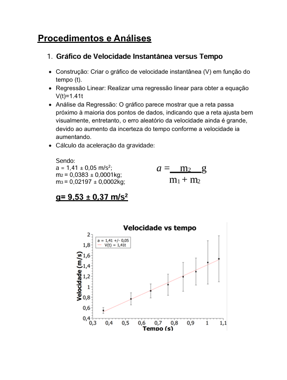<p>Procedimentos e Análises 1. Gráfico de Velocidade Instantânea versus Tempo Construção: Criar o gráfico de velocidade instantânea (V) em função do tempo (t). Regressão Linear: Realizar uma regressão linear para obter a equação V(t)=1.41t Análise da Regressão: gráfico parece mostrar que a reta passa próximo à maioria dos pontos de indicando que a reta ajusta bem visualmente, entretanto, erro aleatório da velocidade ainda é grande, devido ao aumento da incerteza do tempo conforme a velocidade Cálculo da aceleração da gravidade: Sendo: m2=0,0383 + 0,0001kg: m3=0,02197 0,0002kg: g=9,53 + 0,37 Velocidade vs tempo 2 1,8 1,6 1,4 1,2 1 0,8 0,6 0,4 0,3 0,4 0,5 0,6 0,7 0,8 0,9 1 1,1 Tempo (s)</p>