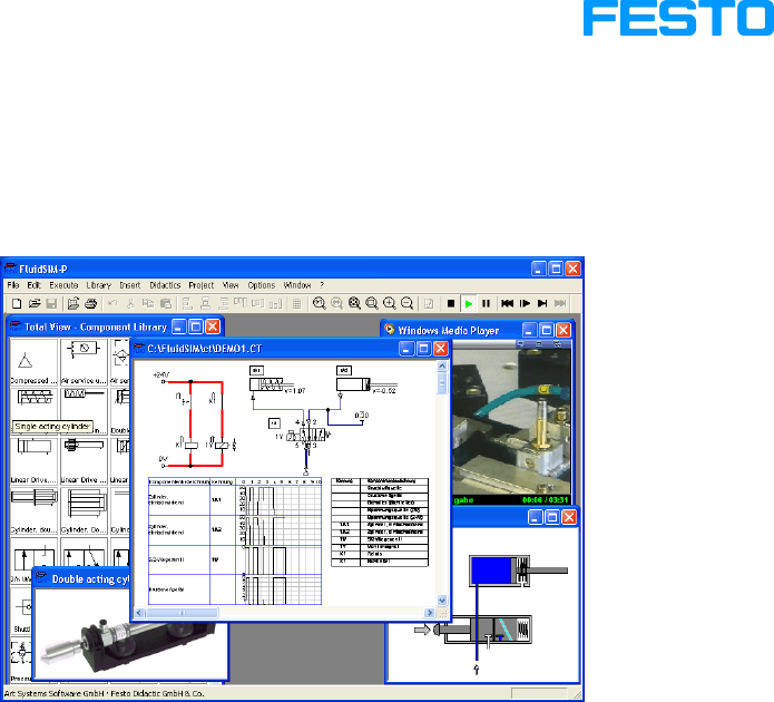 <p>FluidSIM®3.6</p><p>Pneumatics</p><p>User’s Guide</p><p>398029 GB</p><p>04/04</p><p>FluidSIM was launched at the Knowledge-based Systems Department of</p><p>the University of Paderborn.</p><p>Concept and development of FluidSIM®3 Pneumatics is based on</p><p>research work carried out by Dr. Daniel Curatolo, Dr. Marcus Hoffmann,</p><p>and Dr. habil. Benno Stein.</p><p>Order No.: 398029</p><p>Description: HANDBUCH</p><p>Designation: D:HB-FSP3-GB</p><p>Edition: 4/2004</p><p>Author: Art Systems</p><p>Layout: Art Systems</p><p>© Festo Didactic GmbH & Co. KG, D-73770 Denkendorf, 1996-2004</p><p>Internet: www.festo.com/didactic</p><p>e-mail: did@festo.com</p><p>© Art Systems Software GmbH, D-33102 Paderborn, 1995-2004</p><p>Internet: www.art-systems.com, www.fluidsim.com</p><p>e-mail: info@art-systems.com</p><p>The copying, distribution and utilization of this document as well</p><p>as the communication of its contents to others without expressed</p><p>authorization is prohibited. Offenders will be held liable for the payment</p><p>of damages. All rights reserved, in particular the right to carry out</p><p>patent, utility model or ornamental design registration.</p><p>Contents</p><p>1. Welcome! 7</p><p>1.1 About FluidSIM 8</p><p>1.2 Layout of the Handbook 9</p><p>1.3 Conventions 10</p><p>2. Getting Started 11</p><p>2.1 Technical Requirements 11</p><p>2.2 Installation 11</p><p>2.2.1 Installation with Program Activation 11</p><p>2.2.2 Installation with license connector 12</p><p>2.3 Supplied Files 15</p><p>2.4 De-installation of a Single-Position License 17</p><p>3. Introduction to Simulating and Creating Circuits 19</p><p>3.1 Simulating Existing Circuit Diagrams 22</p><p>3.2 The Different Simulation Modes 28</p><p>3.3 Creating new Circuit Diagrams 29</p><p>4. Advanced Concepts in Simulating and Creating Circuits 48</p><p>4.1 Additional Editing Functions 48</p><p>4.2 Additional Simulation Functions 59</p><p>4.3 Linking Components Automatically 61</p><p>4.4 Current Path Numbering and Switching Elements Table 62</p><p>4.5 Displaying Quantity Values 63</p><p>4.6 Displaying State Diagrams 66</p><p>4.7 Superficial Circuit Checking 68</p><p>4.8 Coupling Pneumatics, Electrics and Mechanics 70</p><p>4.9 Operating Switches 76</p><p>4.10 Adjustable Components 80</p><p>4.11 Settings for Simulation 81</p><p>4.12 OPC and DDE communication with Other Applications 84</p><p>4.13 Settings for the OPC/DDE communication 86</p><p>5. Learning, Teaching, and Visualizing Pneumatics 88</p><p>5.1 Information about Single Components 89</p><p>5.2 Selecting Didactics Material from a List 96</p><p>5.3 Presentations: Combining Instructional Material 103</p><p>5.4 Playback of Educational Films 107</p><p>5.5 Settings for Didactics 110</p><p>© Festo Didactic GmbH & Co. KG and Art Systems • FluidSIM 3</p><p>Contents</p><p>6. Special Functions 112</p><p>6.1 Drawing Layers 112</p><p>6.2 Graphic Primitives 113</p><p>6.3 Text Components and Identifications 117</p><p>6.4 Parts Lists 119</p><p>6.5 Printing a Window’s Contents 123</p><p>6.6 DXF Export 125</p><p>6.7 DXF Import 126</p><p>6.8 Using and Organizing Component Libraries 129</p><p>6.9 Managing Projects 137</p><p>6.10 Saving Settings 139</p><p>7. Help and Advanced Tips 142</p><p>7.1 The Most Frequently Occurring Problems 142</p><p>7.2 Tips for the Advanced User 146</p><p>A. FluidSIMMenus 151</p><p>A.1 File 151</p><p>A.2 Edit 153</p><p>A.3 Execute 155</p><p>A.4 Library 156</p><p>A.5 Insert 157</p><p>A.6 Didactics 157</p><p>A.7 Project 159</p><p>A.8 View 160</p><p>A.9 Options 163</p><p>A.10 Window 165</p><p>A.11 ? 165</p><p>B. The Component Library 166</p><p>B.1 Pneumatic Components 166</p><p>B.2 Electrical Components 186</p><p>B.3 Electrical Components (American Standard) 195</p><p>B.4 Digital Components 199</p><p>B.5 Miscellaneous 210</p><p>C. Didactics Material Survey 212</p><p>C.1 Basics 212</p><p>C.2 Diagram Symbols 214</p><p>4 © Festo Didactic GmbH & Co. KG and Art Systems • FluidSIM</p><p>Contents</p><p>C.3 Circuits 217</p><p>C.4 Air Service Units 224</p><p>C.5 Valves 228</p><p>C.6 Actuators 241</p><p>C.7 Exercises 244</p><p>C.8 Extensions 253</p><p>C.9 Educational Films 253</p><p>C.10 Standard Presentations 254</p><p>D. Messages 255</p><p>D.1 Electrical Errors 255</p><p>D.2 Drawing Errors 255</p><p>D.3 Operating Errors 257</p><p>D.4 Opening and Saving Files 258</p><p>D.5 System Errors 259</p><p>Index 261</p><p>© Festo Didactic GmbH & Co. KG and Art Systems • FluidSIM 5</p><p>Contents</p><p>6 © Festo Didactic GmbH & Co. KG and Art Systems • FluidSIM</p><p>1.Welcome!</p><p>Welcome to FluidSIM !</p><p>Thank you for purchasing the FluidSIM®3 Pneumatics training software.</p><p>This handbook functions both as an introduction to FluidSIM and as a</p><p>reference manual outlining the possibilities, concepts, and operation of</p><p>the software package. This handbook, however, is not intended to help</p><p>in defining special aspects of pneumatics. Concerns of this nature can</p><p>be found in the Festo Didactic GmbH & Co. KG textbook series.</p><p>Users of this software are encouraged to contribute tips, criticism, and</p><p>suggestions for improvement of the program via email at</p><p>info@fluidsim.com</p><p>did@festo.com</p><p>Moreover, the newest updates can be found at our Internet site at</p><p>www.fluidsim.com</p><p>www.festo.com/didactic</p><p>April 2004 The Authors</p><p>© Festo Didactic GmbH & Co. KG and Art Systems • FluidSIM 7</p><p>mailto:info@fluidsim.com</p><p>mailto:did@festo.com</p><p>http://www.fluidsim.com</p><p>http://www.festo.com/didactic</p><p>1.Welcome!</p><p>1.1</p><p>About FluidSIM</p><p>FluidSIM®3 Pneumatics is a teaching tool for simulating pneumatics</p><p>basics and runs using Microsoft Windows®. It can be used in combina-</p><p>tion with the Festo Didactic GmbH & Co. KG training hardware, but also</p><p>independently. FluidSIM was developed as a joint venture between the</p><p>University of Paderborn, Festo Didactic GmbH &