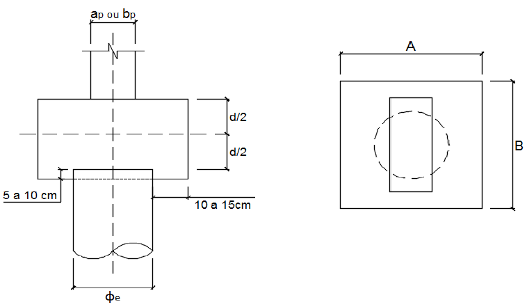 <p>A = 70 cm</p><p>B = 84 cm</p><p>ap = 30 cm</p><p>bp = 20 cm</p><p>d = 36,0 cm</p><p>φe = 30 cm</p><p>lb,pilar = 33 cm</p><p>c = 4 cm</p><p>fck = 25 MPa</p><p>fyk = 250 MPa</p><p>γf = 1,4</p><p>γS = 1,15</p><p>OBS.: Coeficientes obtidos dos itens 11.7 e 12.4.1 da NBR 6118:2014</p><p>Bloco P1 (19x19)</p><p>• Propriedades geométricas:</p><p>• Propriedade dos materiais:</p><p>(Lado do bloco paralelo ao lado ap do pilar)</p><p>(Lado do bloco paralelo ao lado bp do pilar)</p><p>(Lado do pilar paralelo ao lado A do bloco)</p><p>(Lado do pilar paralelo ao lado B do bloco)</p><p>(Diâmetro da estaca)</p><p>(Comprimento básico de ancoragem das barras do pilar)</p><p>(Cobrimento da armadura)</p><p>(Altura útil)</p><p>(Resistência característica do concreto à compressão)</p><p>(Tensão de escoamento do aço - Valor característico)</p><p>• Coeficientes de ponderação:</p><p>(Coeficiente de ponderação dos esforços e do concreto)</p><p>(Coeficiente de ponderação do aço)</p><p>A carga axial que o pilar aplica no bloco faz surgir em seu interior uma região comprimida que tende a se</p><p>uniformizar a medida que se aproxima da estaca (Princípio de Saint-Venant). Isso ocorre quando a altura últil d</p><p>tem um valor próximo do diâmetro da estaca (1 a 1,1.φe)</p><p>Perpendicularmente a direção da carga axial surgem esforços de tração que são resistidos por uma armadura</p><p>horizontal na forma de estribos. O valor desses esforços pode ser obtido através de um modelo de bielas e</p><p>tirantes que será apresentado a seguir</p><p>𝑑 ≥ ቊ</p><p>1,2 . 𝜙𝑒</p><p>𝑙𝑏,𝑝𝑖𝑙𝑎𝑟</p><p>Nk = 200,00 kN</p><p>Nd = 280,00 kN</p><p>Td = 70,00 kN</p><p>As = 3,22 cm²</p><p>• Cálculo da força de tração horizontal:</p><p>OBS.: Como Tka e Tkb costumam assumir valores muito pequenos,</p><p>o cálculo da área de aço dos estribos horizontais será feito</p><p>considerando que a força de tração horizontal corresponde a 1/4</p><p>da carga axial do pilar</p><p>OBS.: Tka e Tkb são as forças de tração horizontal nas direções</p><p>paralelas ao lado A e lado B, respectivamente</p><p>• Cálculo da área de aço:</p><p>(Área de aço dos estribos horizontais)</p><p>OBS.: Por simplicidade será adotada para os estribos verticais (Armadura construtiva), a mesma área de aço dos</p><p>estribos horizontais</p><p>Τ𝑁𝑘 2</p><p>Τ𝑑 2</p><p>=</p><p>𝑇𝑘</p><p>Τ(𝜙𝑒 − 𝑎𝑝) 4</p><p>𝑇𝑘𝑎 =</p><p>𝑁𝑘</p><p>4</p><p>𝜙𝑒 − 𝑎𝑝</p><p>𝑑</p><p>𝑇𝑘𝑏 =</p><p>𝑁𝑘</p><p>4</p><p>𝜙𝑒 − 𝑏𝑝</p><p>𝑑</p><p>𝑇𝑘 ≌</p><p>𝑁𝑘</p><p>4</p><p>𝑇𝑑 ≌ 𝛾𝑓 . 𝑇𝑘</p><p>𝐴𝑆 =</p><p>𝑇𝑑</p><p>𝑓𝑦𝑑</p><p>8 mm</p><p>12,5 mm</p><p>4</p><p>5</p><p>5</p><p>10,67 cm</p><p>18,49 cm</p><p>14,99 cm</p><p>OK</p><p>OK</p><p>Não OK</p><p>Não OK</p><p>OK</p><p>OK</p><p>A seção ou área das bielas varia ao longo da altura do bloco e, por isso, devem ser verificadas as seções junto ao</p><p>pilar e junto à estaca</p><p>φe < A ≤ φe+30cm</p><p>É recomendado que o lado A do bloco seja maior que o diâmetro da estaca e menor ou igual ao diâmetro da</p><p>estaca somado a 30cm</p><p>φe < B ≤ φe+30cm</p><p>É recomendado que o lado B do bloco seja maior que o diâmetro da estaca e menor ou igual ao diâmetro da</p><p>estaca somado a 30cm</p><p>Verificação da biela de compressão:</p><p>(Bitola dos estribos verticais)</p><p>A ≥ ap+6cm</p><p>É recomendado que o lado A do bloco seja maior ou igual a soma do lado ap do pilar com 6cm</p><p>É recomendado que o lado B do bloco seja maior ou igual a soma do lado bp do pilar com 6cm</p><p>B ≥ ap+6cm</p><p>Nº de estribos horizontais N1 =</p><p>OBS.: Foi adotado pelo menos 1 estribo horizontal a cada 15cm e 1 estribo vertical a cada 20cm</p><p>• Verificações:</p><p>Nº de estribos verticais N3 =</p><p>Esp. Estribo horizontal = (Espaçamento entre os estribos horizontais)</p><p>Esp. Estribo vertical N2 = (Espaçamento entre os estribos verticais N2)</p><p>Esp. Estribo vertical N3 = (Espaçamento entre os estribos verticais N3)</p><p>Nº de estribos verticais N2 =</p><p>σcd,b,pilar ≤ σcd,b,lim</p><p>σcd,b,estaca ≤ σcd,b,lim</p><p>φ estribos horizontais =</p><p>φ estribos verticais =</p><p>(Bitola dos estribos horizontais)</p><p>𝜎𝑐𝑑,𝑏,𝑝𝑖𝑙𝑎𝑟 =</p><p>𝑁𝑑</p><p>𝐴𝑝</p><p>; Ap = Área da seção transversal do pilar</p><p>𝜎𝑐𝑑,𝑏,𝑒𝑠𝑡𝑎𝑐𝑎 =</p><p>𝑁𝑑</p><p>𝐴𝑒</p><p>; Ae = Área da seção transversal da estaca</p><p>𝜎𝑐𝑑,𝑏,𝑙𝑖𝑚 = 𝑓𝑐𝑑 ; 𝑓𝑐𝑑 =</p><p>𝑓𝑐𝑘</p><p>𝛾𝑓</p><p>0,47 kN/cm²</p><p>0,40 kN/cm²</p><p>1,79 kN/cm²</p><p>OBS.: Devido ao confinamento em torno da biela é possível que a tensão resistente de cálculo seja ainda maior do que fcd</p><p>(Ver item 21.2.1 da NBR 6118:2014)</p><p>σcd,b,estaca =</p><p>σcd,b,lim =</p><p>(Tensão de compressão na seção da biela em contato com o pilar)</p><p>(Tensão de compressão na seção da biela em contato com a estaca)</p><p>(Resistência de cálculo da biela - Item 21.2.1 da NBR 6118:2014)</p><p>σcd,b,pilar =</p>