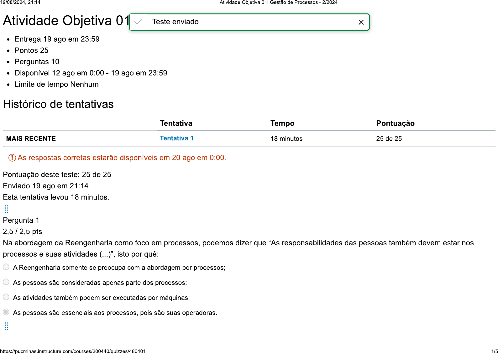 <p>21:14 Atividade Objetiva 01: Gestão de Processos - 2/2024 Atividade Objetiva 01 Teste enviado X Entrega 19 ago em 23:59 Pontos 25 Perguntas 10 Disponível 12 ago em 0:00 - 19 ago em 23:59 Limite de tempo Nenhum Histórico de tentativas Tentativa Tempo Pontuação MAIS RECENTE Tentativa 1 18 minutos 25 de 25 ! As respostas corretas estarão disponíveis em 20 ago em 0:00. Pontuação deste teste: 25 de 25 Enviado 19 ago em 21:14 Esta tentativa levou 18 minutos. Pergunta 1 2,5 / 2,5 pts Na abordagem da Reengenharia como foco em processos, podemos dizer que "As responsabilidades das pessoas também devem estar nos processos e suas atividades (...)", isto por quê: A Reengenharia somente se preocupa com a abordagem por processos; As pessoas são consideradas apenas parte dos processos; As atividades também podem ser executadas por máquinas; As pessoas são essenciais aos processos, pois são suas operadoras. https://pucminas.instructure.com/courses/200440/quizzes/480401 1/5</p><p>19/08/2024, 21:14 Atividade Objetiva 01: Gestão de Processos - 2/2024 Pergunta 2 2,5/2,5 pts Teste enviado Todas as afirmativas abaixo servem para nos demonstrar por quê os processos são importantes. Com exceção de: Permitem melhor simulação do funcionamento de operações na empresa; Apresentam um nível descritivo para análise de forma muito eficaz; Permitem uma visão gerencial da empresa de forma mais integrada; Têm um foco restrito em tarefas operacionais; Pergunta 3 2,5 / 2,5 pts Podemos dizer que a Reengenharia: Tem foco principal na abordagem sobre negócios; Envolve processos somente em nível específico de seu estudo; Se aplica a diferentes abordagens no ambiente da empresa; Ela não se preocupa, por ex. com a Inovação Estrutural Pergunta 4 A prática de todas as categorias básicas de processos pressupõe uma fase de transformações nestes, por quê: Uma transformação significa sempre abandonar um processo existente; É um objetivo da prática de administração de processos, melhorar, ou seja, transformar para melhor os processos da empresa; Toda categoria de processos pressupõe funcionários altamente especializados em soluções informatizadas; Nenhuma das categorias de processos pode influenciar em uma alteração profunda na prática da atividade. https://pucminas.instructure.com/courses/200440/quizzes/480401 2/5</p><p>19/08/2024, 21:14 Atividade Objetiva 01: Gestão de Processos 2/2024 Pergunta 5 2,5/2,5 pts Teste enviado A participação da alta administração na Administração de Processos, é uma das precauções para as quais um analista deve estar atento. Todas as opções abaixo justificam esta preocupação quando do trabalho em processos, com exceção de: A disponibilização dos recursos necessários à atividade de processos, de forma geral, passa pela Alta Administração. A Alta Administração é quem, de forma geral, deve aprovar os planos de intervenção; Sem o apoio da Alta Administração as chances de acerto no trabalho diminuem; A Alta Administração é quem sempre executa o trabalho em processos; Pergunta 6 2,5/2,5 pts Se justifica a expressão "As empresas são grandes coleções de processos", por quê, exceto: Para cada processo identificado, de forma incondicional, podemos descartar outro que trate da mesma temática; As atividades organizacionais são interligadas e geram, na maioria das vezes, outros processos a partir de sua identificação. Atividades e tarefas diversas servem à formatação de processos; Para cada prática organizacional identificamos no mínimo um processo; Pergunta 7 2,5 / 2,5 pts Podemos dizer que ainda há muito o que se fazer na aplicação do conceito de processo empresarial, por quê, exceto: Por não conhecerem corretamente o conceito de processos, as empresas têm maior dificuldade em aplicar o que deveria ser a correta prática da administração de processos; As pessoas que trabalham nas empresas, de forma geral, ainda não conhecem plenamente o conceito de processos; Nenhuma empresa se preocupa em contratar consultores especialistas em processos. As empresas tendem a ser muito compartimentalizadas, o que dificulta a prática da gestão de processos; https://pucminas.instructure.com/courses/200440/quizzes/480401 3/5</p><p>19/08/2024, 21:14 Atividade Objetiva 01: Gestão de Processos - 2/2024 Pergunta 8 Teste enviado 2,5/2,5 pts Os processos horizontais podem ser classificados como: Voluntários, formais e coordenados; Voluntários, informais e coordenados; Informais, coordenados e involuntários; Formais, coordenados e involuntários. Pergunta 9 2,5 / 2,5 pts Quando pensamos em precauções na Administração de Processos, sugere-se, como um primeiro passo, o efetivo conhecimento da matéria. Isso se dá, por quê: As normas e procedimentos nunca são claras acerca de uma tarefa. O analista de processos ao assumir um trabalho em determinada área, deve procurar conhecer o assunto/tema para sua melhor performance e resultados; Nenhum profissional de processos pode se comunicar com outras áreas da empresa; Trata-se sempre de uma exigência contratual; Pergunta 10 2,5 / 2,5 pts Em se tratando da conceituação de Processos, é correto afirmar, exceto: As políticas da empresa podem estar inseridas nas atividades concernentes a um processo; A conceituação de processos, se aplica, preferencialmente, para os problemas de clientes internos da empresa; Todo produto ou serviço da empresa pressupõe, no mínimo a existência de um processo empresarial. As definições de input e output podem ser consideradas tanto para produtos, quanto para serviços; https://pucminas.instructure.com/courses/200440/quizzes/480401 4/5</p><p>19/08/2024, 21:14 Atividade Objetiva 01: Gestão de Processos - 2/2024 Pontuação do teste: 25 de 25 Teste enviado https://pucminas.instructure.com/courses/200440/quizzes/480401 5/5</p>