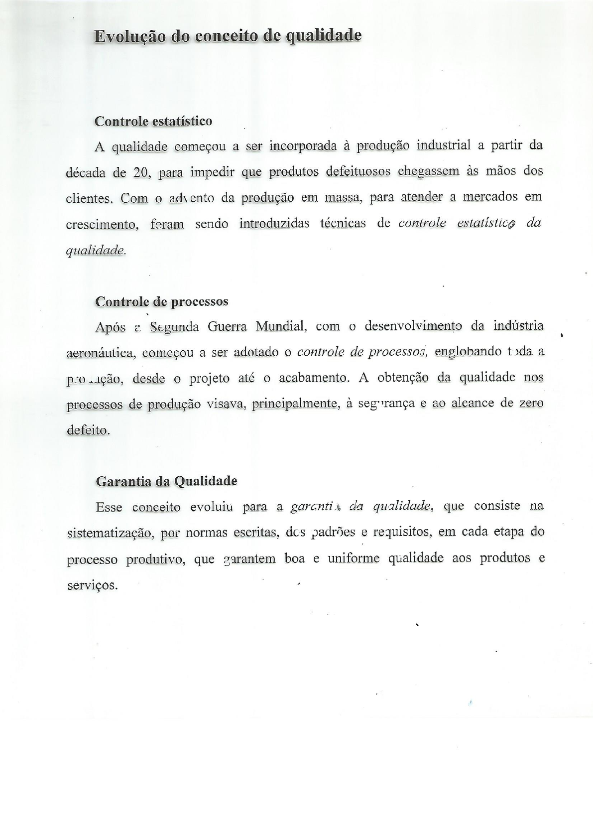 <p>Evolução do conceito de qualidade Controle estatístico A qualidade começou a ser incorporada à produção industrial a partir da década de 20, para impedir que produtos defeituosos chegassem às mãos dos clientes. Com o advento da produção em massa, para atender a mercados em crescimento, feram sendo introduzidas técnicas de controle da qualidade. Controle de processos Após Segunda Guerra Mundial, com o desenvolvimento da indústria começou a ser adotado o controle de processos, englobando toda a desde o projeto até o acabamento. A obtenção da qualidade nos processos de produção visava, principalmente, à segurança e ao alcance de zero defeito. Garantia da Qualidade Esse conceito evoluiu para a da qualidade, que consiste na sistematização, por normas escritas, dos padrões e requisitos, em cada etapa do processo produtivo, que garantem boa e uniforme qualidade aos produtos e serviços.</p><p>Qualidade Total A partir da década de 60, o ambiente de negócios começa a mudar: os mercados nos países desenvolvidos começam a saturar e os clientes demandam produtos diferenciados; alta tecnologia começa a ser adotada nos processos produtivos; as barreiras do comércio internacional são reduzidas; a competição internacional se intensifica. Em assumem a liderança de mercado, empresas que colocam produtos altamente diferenciados a preços competitivos. A qualidade volta-se assim para a plena satisfação do cliente e gestão empresarial m derna. Qualidade Total é o conceito que resume hoje, as condições para que a empresa sobreviva e se desenvolva nesse ambiente competitivo e de rápidas mudanças. 1. Controle do produto - baseada na final de produtos 2. Controle estatístico do processo - segurança e zero defeito 3. Garantia de qualidade -baseada em normas e procedimentos 4. Qualidade Total do cliente e competitividade</p>