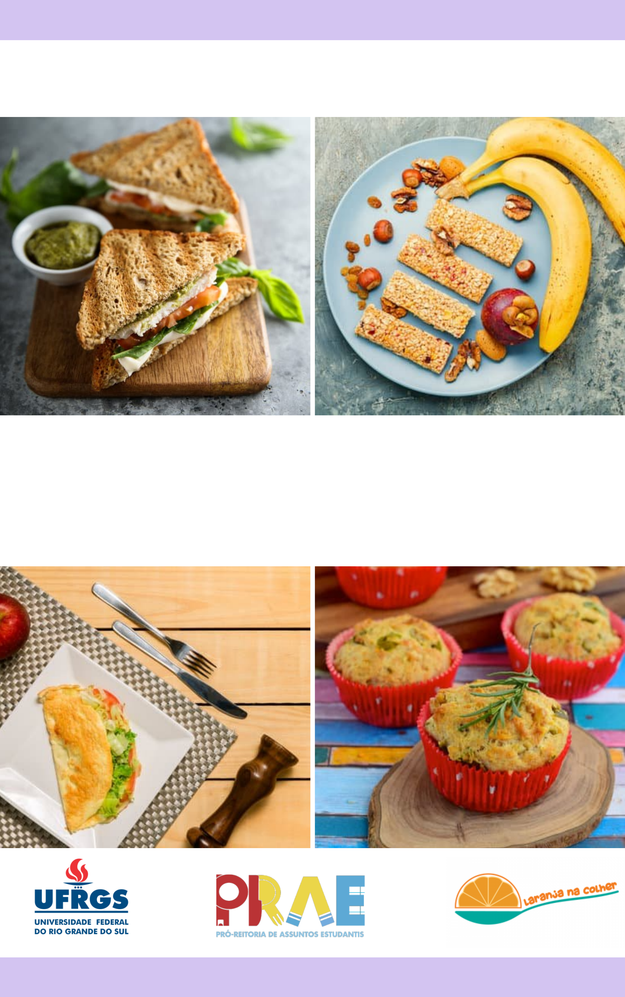 <p>Lanches</p><p>Crepioca</p><p>I N G R E D I E N T E S :</p><p>M O D O D E P R E P A R O :</p><p>1 ovo</p><p>2 colheres de sopa de água</p><p>2 colheres de sopa de goma de tapioca</p><p>1 colher de sobremesa de chia</p><p>sal a gosto</p><p>pimenta-do-reino a gosto</p><p>Recheio:</p><p>1 tomate pequeno picado</p><p>1 fatia de queijo minas frescal</p><p>orégano a gosto</p><p>M i s t u r e e m u m r e c i p i e n t e t o d o s o s i n g r e d i e n t e s d a</p><p>m a s s a .</p><p>A q u e ç a u m a f r i g i d e i r a u n t a d a c o m a z e i t e e m f o g o b a i x o ,</p><p>e d e s p e j e a m a s s a p r e p a r a d a d e m o d o q u e o c u p e t o d a a</p><p>á r e a d a f r i g i d e i r a .</p><p>D o u r e d o s d o i s l a d o s</p><p>D e s l i g u e o f o g o e c o l o q u e o r e c h e i o q u e p r e f e r i r .</p><p>D o b r e o u e n r o l e a c r e p i o c a .</p><p>1 .</p><p>2 .</p><p>3 .</p><p>4 .</p><p>5 .</p><p>Receita elaborado pela Bolsista</p><p>Biscoitinhos de Aveia com</p><p>Creme de Cacau</p><p>I N G R E D I E N T E S :</p><p>Massa:</p><p>4 xícaras de farinha de trigo integral;</p><p>1 xícara e ½ de farelo de aveia;</p><p>250g de óleo de coco;</p><p>½ xícara de açúcar demerara;</p><p>1 ovo;</p><p>1 colher de sobremesa rasa de fermento químico.</p><p>Recheio:</p><p>1 xícara de avelã tostada e sem casca;</p><p>½ xícara de açúcar (demerara ou mascavo);</p><p>1 xícara e ½ de chocolate 70% cacau derretido;</p><p>1 xícara de leite vegetal;</p><p>1 / 2 xícara de óleo de coco.</p><p>.</p><p>M a s s a :</p><p>M i s t u r a r o ó l e o d e c o c o , o a ç ú c a r e o o v o a t é f o r m a r u m c r e m e</p><p>h o m o g ê n e o .</p><p>R e s e r v a r .</p><p>M i s t u r a r a f a r i n h a d e t r i g o i n t e g r a l c o m o f a r e l o d e a v e i a e o</p><p>f e r m e n t o .</p><p>A d i c i o n a r à m i s t u r a a o s p o u c o s a t é f o r m a r u m a m a s s a</p><p>h o m o g ê n e a e q u e d e s p r e n d a d a s m ã o s .</p><p>A b r i r a m a s s a c o m u m r o l o , c u i d a n d o p a r a n ã o d e i x a r m u i t o</p><p>f i n a n e m m u i t o g r o s s a . C o r t a r c o m m o l d e q u a d r a d o .</p><p>A s s a r e m f o r n o p r é a q u e c i d o ( 1 8 0 ° C ) p o r 1 5 m i n u t o s o u a t é</p><p>d o u r a r .</p><p>R e c h e i o :</p><p>D e r r e t a o c h o c o l a t e e m b a n h o m a r i a e r e s e r v e .</p><p>E m s e g u i d a , b a t a a s a v e l ã s e m l i q u i d i f i c a d o r a t é v i r a r u m a</p><p>p a s t a e d e p o i s a c r e s c e n t e o a ç ú c a r , o c h o c o l a t e d e r r e t i d o , o</p><p>l e i t e v e g e t a l e o ó l e o d e c o c o . B a t a a t é c h e g a r n a c o n s i s t ê n c i a</p><p>d e s e j a d a .</p><p>1 .</p><p>2 .</p><p>3 .</p><p>4 .</p><p>5 .</p><p>6 .</p><p>7 .</p><p>1 .</p><p>2 .</p><p>3 .</p><p>M O D O D E P R E P A R O :</p><p>Receita do Ebook - Mais de 50 receitas que nutrem o corpo e a alma de toda a família - Annie Bello.</p><p>Barra de Cereal Caseira</p><p>I N G R E D I E N T E S :</p><p>M O D O D E P R E P A R O :</p><p>½ xícara de ameixa seca, cozida, sem açúcar</p><p>½ xícara de amêndoa em pedaços</p><p>1 e ½ xícara de aveia</p><p>3 gramas de canela em pó</p><p>5 colheres de sopa de mel (ou melaço)</p><p>½ xícara de chá de semente de girassol</p><p>½ xícara de chá de uva passas</p><p>.</p><p>T r i t u r e a s a m e i x a s a t é q u e o b t e n h a u m a p a s t a . J u n t e o m e l</p><p>( o u m e l a ç o ) e r e s e r v e . P i q u e a s a m ê n d o a s e m p e d a ç o s ,</p><p>j u n t e a s s e m e n t e s d e g i r a s s o l , a s u v a s p a s s a s , a v e i a e a</p><p>p i t a d a d e c a n e l a . R e s e r v e .</p><p>E m u m r e c i p i e n t e , m i s t u r e a m a s s a d e m e l e a m e i x a s c o m a</p><p>m i s t u r a d e a m ê n d o a s , s e m e n t e s , u v a s p a s s a s e a v e i a . M e x a</p><p>b e m p a r a m i s t u r a r t o d o s o s i n g r e d i e n t e s .</p><p>C u b r a u m t a b u l e i r o c o m p a p e l v e g e t a l e c o l o q u e a m i s t u r a .</p><p>P r e n s e a m i s t u r a c o m a s c o s t a s d e u m a c o l h e r a t é q u e e l a</p><p>f i q u e l i s a e u n i f o r m e .</p><p>L e v e a o f o r n o e m t e m p e r a t u r a d e 1 6 0 º , d e 2 0 - 2 5 m i n u t o s ,</p><p>a t é q u e d o u r e .</p><p>R e t i r e d o f o r n o e e s p e r e e s f r i a r . S e p r e f e r i r , c o l o q u e n o</p><p>f r e e z e r p o r 1 5 a 2 0 m i n u t o s . C o r t e e m f o r m a t o d e</p><p>b a r r i n h a s .</p><p>1 .</p><p>2 .</p><p>3 .</p><p>4 .</p><p>5 .</p><p>Receita do Blog Hospital Nossa Senhora da Conceição</p><p>Sanduíche de Pasta de</p><p>Amendoim com Banana</p><p>I N G R E D I E N T E S :</p><p>M O D O D E P R E P A R O :</p><p>1 fatia de pão integral</p><p>1 colher de sobremesa de pasta de amendoim</p><p>1 banana pequena</p><p>Chia a gosto</p><p>Canela a gosto</p><p>N a f a t i a d e p ã o , e s p a l h e c o m a u x í l i o d e u m a c o l h e r a p a s t a d e</p><p>a m e n d o i m .</p><p>C o m a b a n a n a j á c o r t a d a e m r o d e l a s , c o l o q u e a s f a t i a s n o</p><p>p ã o .</p><p>A d i c i o n e a c h i a e a c a n e l a a g o s t o .</p><p>1 .</p><p>2 .</p><p>3 .</p><p>Receita adaptada do Canal Nutricionista Marina Morais</p><p>Biscoito Integral</p><p>I N G R E D I E N T E S :</p><p>M O D O D E P R E P A R O :</p><p>1 e 1/2 xícara de farinha de trigo integral</p><p>1 xícara de farelo de aveia</p><p>1 colher sopa gergelim preto (também pode ser o branco)</p><p>1 colher de sopa de linhaça dourada</p><p>1 colher chá sal marinho</p><p>1/2 xícara de água</p><p>1/3 xícara azeite de oliva extravirgem</p><p>E m u m r e c i p i e n t e m i s t u r e t o d o s o s i n g r e d i e n t e s .</p><p>C o m o a u x í l i o d e u m a c o l h e r , v á m i s t u r a n d o a m a s s a .</p><p>Q u a n d o n ã o f o r m 