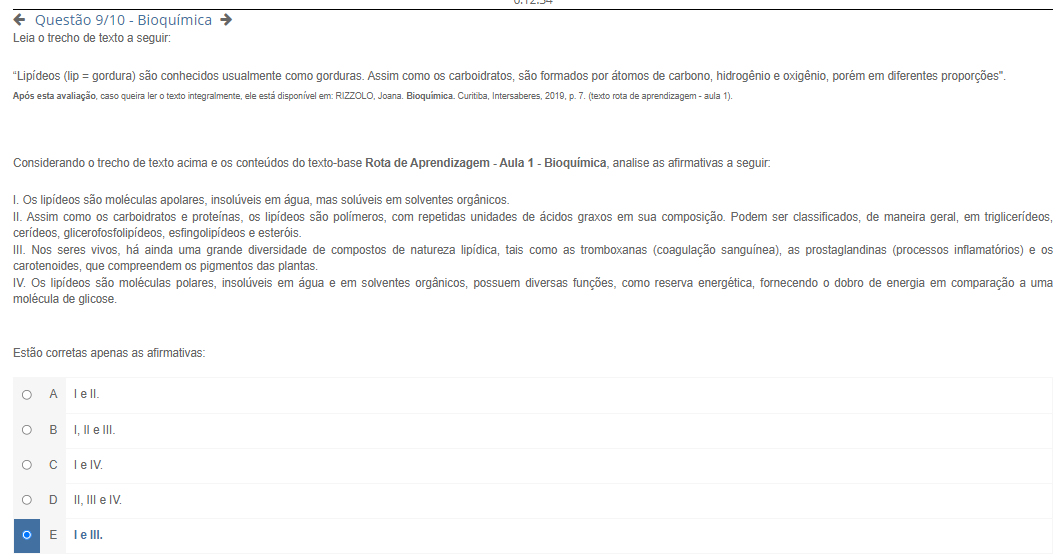 <p>Questão 9/10 Bioquímica Leia trecho de texto a seguir: (lip = gordura) são conhecidos usualmente como Assim como são formados por atomos de hidrogênio e oxigênio, porém em diferentes Após esta caso queira texto ele está disponível em: Joana. Curitiba, 2019, p.7. (texto rota de aprendizagem aula 1). Considerando 0 trecho de texto acima e os conteúdos do texto-base Rota de Aprendizagem - Aula 1 Bioquímica, analise as afirmativas a seguir. I. Os são apolares, insolúveis em água, mas solúveis em solventes II. Assim como os carboidratos e são com repetidas unidades de ácidos graxos em sua composição. Podem ser de maneira geral, em glicerofosfolipideos, esfingolipideos e III. Nos seres vivos, há ainda uma grande diversidade de compostos de natureza tais como as tromboxanas (coagulação sanguínea), as prostaglandinas (processos inflamatórios) e os que compreendem os pigmentos das IV. Os são polares, insolúveis em água e em solventes orgânicos, possuem diversas funções, como reserva energética, fornecendo 0 dobro de energia em comparação a uma de Estão corretas apenas as afirmativas: A ell. B III. I IV. D II. III IV. E</p>