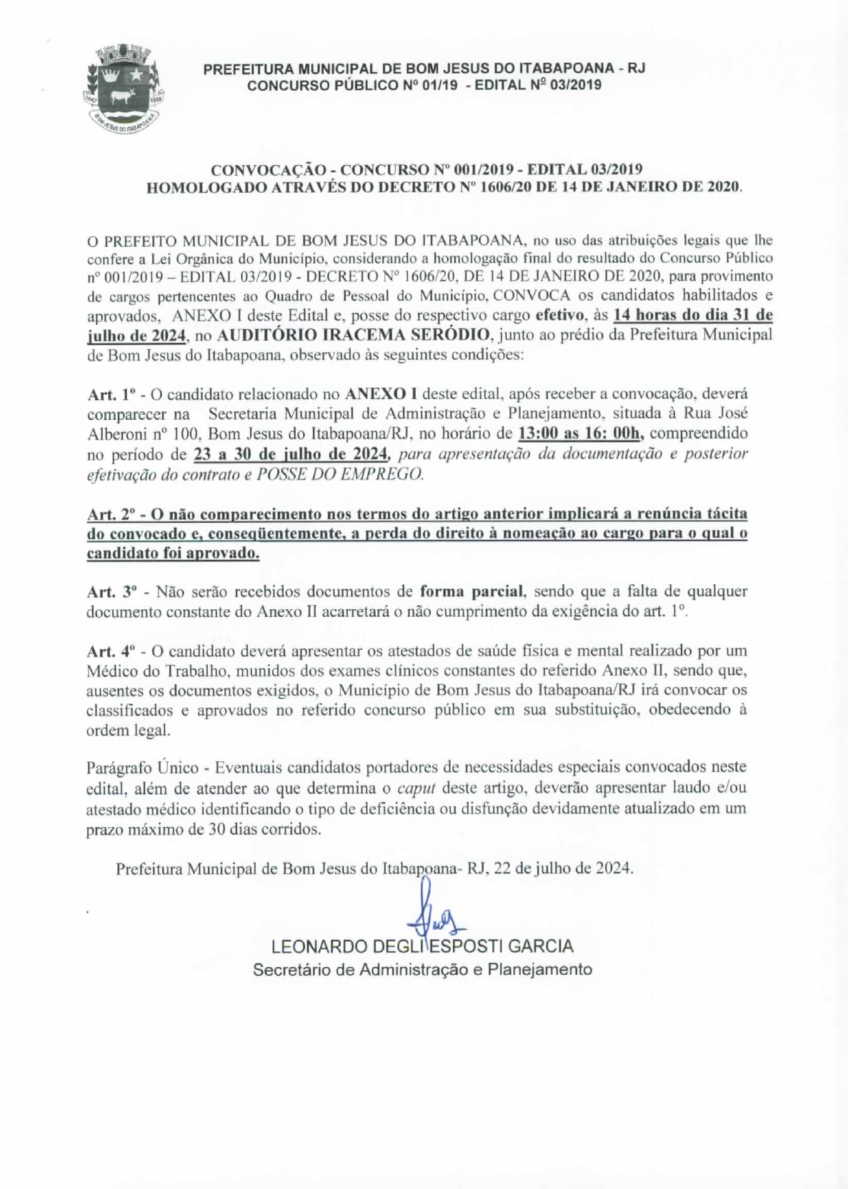 <p>PREFEITURA MUNICIPAL DE BOM JESUS DO ITABAPOANA RJ CONCURSO PÚBLICO N° 01/19 EDITAL N° 03/2019 CONVOCAÇÃO CONCURSO 001/2019 EDITAL 03/2019 HOMOLOGADO ATRAVÉS DO DECRETO 1606/20 DE 14 DE JANEIRO DE 2020. PREFEITO MUNICIPAL DE BOM JESUS DO no uso das atribuições legais que lhe confere a Lei Orgânica do Município, considerando a homologação final do resultado do Concurso Público n° 001/2019 EDITAL 03/2019 DECRETO N° 1606/20, DE 14 DE JANEIRO DE 2020, para provimento de cargos pertencentes ao Quadro de Pessoal do Município, CONVOCA os candidatos habilitados e aprovados, ANEXO I deste Edital e, posse do respectivo cargo efetivo, às 14 horas do dia 31 de julho de no AUDITÓRIO IRACEMA SERÓDIO, junto ao prédio da Prefeitura Municipal de Bom Jesus do Itabapoana, observado às seguintes condições: Art. 1° candidato relacionado no ANEXO I deste edital, após receber a convocação, deverá comparecer na Secretaria Municipal de Administração e Planejamento, situada à Rua José Alberoni n° 100, Bom Jesus do Itabapoana/RJ, no horário de 13:00 as 16: 00h, compreendido no período de 23 a 30 de julho de 2024, para apresentação da documentação e posterior efetivação do contrato e POSSE DO Art. 2° o não comparecimento nos termos do artigo anterior implicará a renúncia tácita do convocado a perda do direito à nomeação ao cargo para o qual o candidato foi aprovado. Art. 3° Não serão recebidos documentos de forma parcial, sendo que a falta de qualquer documento constante do Anexo II acarretará o não cumprimento da exigência do art. Art. 4° candidato deverá apresentar os atestados de saúde física e mental realizado por um Médico do Trabalho, munidos dos exames clínicos constantes do referido Anexo sendo que, ausentes os documentos exigidos, o Município de Bom Jesus do Itabapoana/RJ irá convocar os classificados e aprovados no referido concurso público em sua substituição, obedecendo à ordem legal. Parágrafo Único Eventuais candidatos portadores de necessidades especiais convocados neste edital, além de atender ao que determina o caput deste artigo, deverão apresentar laudo e/ou atestado médico identificando o tipo de deficiência ou disfunção devidamente atualizado em um prazo máximo de 30 dias corridos. Prefeitura Municipal de Bom Jesus do Itabapoana- RJ, 22 de julho de 2024. LEONARDO GARCIA Secretário de Administração e Planejamento</p><p>PREFEITURA MUNICIPAL DE BOM JESUS DO ITABAPOANA - RJ CONCURSO PÚBLICO N° 01/19 - EDITAL N° 03/2019 ANEXO I JORNADA DE REQUISITOS VAGAS DE AMPLA TRABALHO CLASSIFICAÇÃO EMPREGO/CARGO (ESCOLARIDADE/ CONCORRÊNCIA FORMAÇÃO) (HORAS SEMANAIS) Código 206 Agente Administrativo Nível médio completo. 03 40H 78° COLOCADO LUCIANA TAVARES COLLARES CARDOSO Por motivo de desclassificação 74° colocado 79° COLOCADO DARA DELLABENETA SANTOS Por motivo de desclassificação 75° colocado 80° COLOCADO POLYANA PEREIRA ARAUJO Por motivo de desclassificação 76° colocado Nível Fundamental Completo e experiência de 1 (UM) ANO no exercício Código 215 MOTORISTA 40H de atividades similares 03 para o emprego de Motorista 35° COLOCADO MARCIO COELHO SOARES Por motivo de desclassificação 29° colocado 36 COLOCADO FABRICIO POLYCARPO DOS SANTO Por motivo de desclassificação 31° colocado COLOCADO LEANDRO RODRIGUES MACHADO Por motivo de desclassificação 33 colocado Técnico de Nivel médio completo com Código 212 40H Informatica curso área. 02 GILBERTO FURTADO DA SILVA Por motivo de desclassificação 8° colocado 10° COLOCADO SAULO FIGUEIREDO DIAS Por motivo de desclassificação 9° colocado 11° COLOCADO</p><p>PREFEITURA MUNICIPAL DE BOM JESUS DO ITABAPOANA - RJ CONCURSO PÚBLICO N° 01/19 EDITAL N° 03/2019 ANEXO II 1 - - Os candidatos convocados deverão apresentar documentos conforme previsto no Edital do concurso: Título de Eleitor (cópia e original); Carteira de Identidade (cópia e Carteira de Trabalho e Previdência Social (cópia e original); Cadastro de Pessoa Física; CPF (cópia e original); Cartão PIS/PASEP para os já inscritos (cópia e original); Certidão de nascimento e/ou casamento (cópia e original); Certidão de nascimento dos filhos menores de 14 anos (cópia e original); Cartão de vacina e comprovante de escolaridade dos filhos menores de 14 anos (cópia e original); Quitação com as obrigações militares, somente para homens (cópia e Quitação com as obrigações eleitorais (cópia e original); Comprovante de residência atualizado (cópia e original); Um foto 3x4 Diploma comprobatório da escolaridade exigida para o emprego (cópia e original); Certidão de antecedentes criminais; Comprovante de Tiragem Sanguínea e Fator RH: Laudo Médico no caso de candidato com deficiência "2. REQUISITOS BÁSICOS PARA INVESTIDURA NO EMPREGO PÚBLICO 2.1. Ter nacionalidade brasileira ou equivalente; 2.2. Estar em pleno gozo dos direitos políticos; 2.3. Estar quites com as obrigações militares e 2.4. Ter nível de escolaridade e capacitação técnica exigida para o exercício do 2.4.1. candidato que não comprovar a escolaridade exigida para o emprego, no ato da contratação, será eliminado do Concurso Público. 2.5. Ter idade mínima de 18 (dezoito) anos completos até a data da contratação; 2.6. Ter aptidão física e mental para o exercício das atribuições do emprego; 2.7. Apresentar, quando se tratar de profissão regulamentada, no ato da contratação, o competente registro de inscrição no respectivo órgão fiscalizador; 2.8. Apresentar, quando se tratar dos empregos de Advogado do Município, Eletricista, Motorista II e Operador de Máquinas Pesadas, na convocação para entrega de documentos, Carteira de Trabalho e Previdência Social ou ato de investidura em cargo ou emprego público, comprovando a experiência exigida; 2.9. Apresentar declaração de não possuir acúmulo de cargo ou emprego público, exceto aqueles admitidos constitucionalmente: 2.10. "No ato