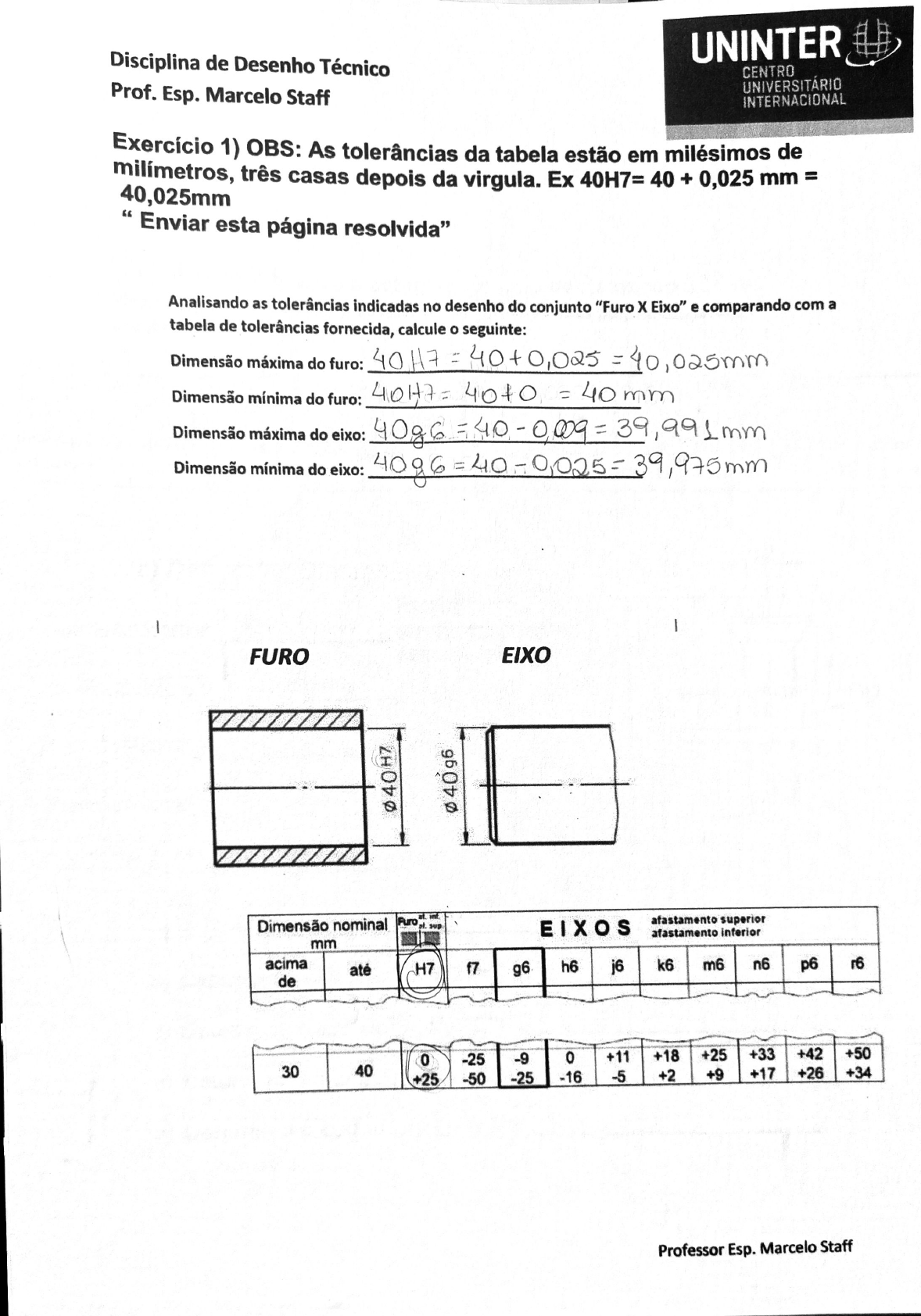 <p>Disciplina de Desenho Técnico UNINTER CENTRO Prof. Esp. Marcelo Staff UNIVERSITÁRIO INTERNACIONAL Exercício 1) OBS: As tolerâncias da tabela estão em milésimos de milímetros, três casas depois da virgula. Ex 40H7= 40 + 0,025 mm = 40,025mm " Enviar esta página resolvida" Analisando as tolerâncias indicadas no desenho do conjunto "Furo X Eixo" e comparando com a tabela de tolerâncias fornecida, calcule o seguinte: Dimensão máxima do furo: 40+0,025 = 40,025mm Dimensão mínima do furo: mm Dimensão máxima do eixo: Dimensão mínima do eixo: I FURO EIXO Dimensão nominal Puro sup EIXOS afastamento superior afastamento inferior mm acima até H7 f7 g6 h6 j6 k6 m6 n6 p6 r6 de 0 -25 -9 0 +11 +18 +25 +33 +42 +50 30 40 +25 -50 -25 -16 -5 +2 +9 +17 +26 +34 Professor Esp. Marcelo Staff</p><p>UNINTER Disciplina de Desenho Técnico CENTRO UNIVERSITÁRIO INTERNACIONAL Prof. Esp. Marcelo Staff Exercício 2). Observe a cotagem do pino de Retenção ECO e determine os valores solicitados. " Enviar esta página resolvida" Ex Afastamento superior = -0,02 mm. Material L3 H digo do artigo Forma do corpo Versão D D1 D2 L L1 L2 básico 632.001903 Aço 3 M6x0,75 14 34,5 12 5 10 3, A endurecida inoxidável D2 a) Determine Dimensão D Forma A Afastamento Superior: - 0,02 mm sem ranhura de engate sem contraporca Afastamento Inferior: - 0,04mm SW1 12 Dimensão Máxima: 17 Dimensão Mínima: mm H Tolerância: mm D-0,02 -0,04 D1 b) Determine a dimensão "D2 "= 14 c) Determine o comprimento "L"= 34,5 d) Determine o comprimento "H"= 3,5 e) Determine o comprimento "L3"= 10 Professor Esp. Marcelo Staff</p><p>VISTA FRONTAL VISTA LATERAL 60 20 3 4 30 15 01 SENSOR DE PRESENCA 01 Plastiprene Peça Denominação Qdte Material Data Peça: 30108124 Empresa: UNINTER 3 Unidade: Aluno: Esc: mm Katia Kamile dos S. Lavandoski 1:1 Titulo: UNINTER CENTRO Atividade UNIVERSITARIO 4</p><p>15 LATERAL 75 30 D VISTA SUPERIOR S 25 01 15 1045 Peça Denominação Qdte Material Data Peça: Ex 4 30108124 Empresa: UNINTER Unidade: Aluno: Esc: 1:1 mm Kaha Kamile d Santos Titulo: O UNINTER Atividade CENTRO UNIVERSITARIO</p><p>vista FRONTAL 015 30 15 30 35 SUPERIOR 5 010 01 do SENSOR 5 AGO 1045 Peça Denominação Qdte Material Data Peça: EX 5 Empresa: UNINTER Unidade: Aluno: Esc: mm Kaha Kamile d. Santos Titulo: UNINTER CENTRO to Atividade UNIVERSITARIO</p>