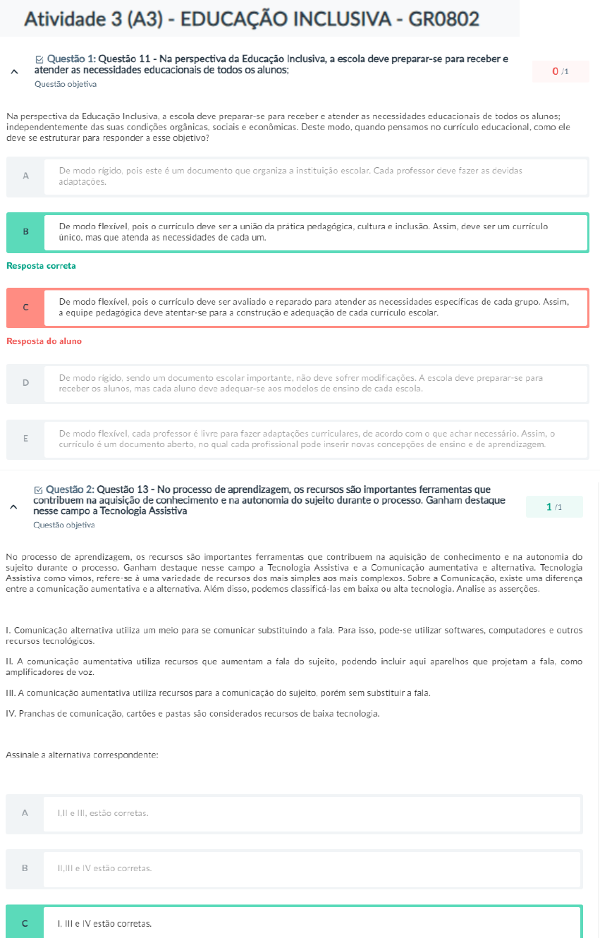 <p>Atividade 3 (A3) - EDUCAÇÃO INCLUSIVA - GR0802 Questão 1: Questão 11 Na perspectiva da Educação Inclusiva, a escola deve preparar-se para receber e atender as necessidades educacionais de todos os alunos; 0 /1 Questão objetiva Na perspectiva da Educação a escola deve preparar-se para receber e atender as necessidades educacionais de todos os independentemente das suas condições orgânicas, sociais e Deste modo, quando pensamos no currículo como ele deve se estruturar para responder a esse objetivo? A De modo pois este é um documento que organiza a instituição escolar. Cada professor deve fazer as devidas De modo flexível, pois o currículo deve ser a união da prática cultura e Assim, deve ser um currículo B único, mas que atenda as necessidades de cada um. Resposta correta De modo flexível, pois o currículo deve ser avaliado e reparado para atender as necessidades específicas de cada grupo. Assim, a equipe pedagógica deve atentar-se para a construção e adequação de cada currículo escolar. Resposta do aluno De modo sendo um documento escolar importante, não deve sofrer A escola deve preparar-se para D receber os mas cada aluno deve adequar-se aos modelos de ensino de cada escola. E De modo cada professor é livre para fazer adaptações de acordo com que achar Assim, currículo é um documento aberto, no qual cada profissional pode inserir novas concepções de ensino e de aprendizagem. Questão 2: Questão 13 No processo de aprendizagem, os recursos são importantes ferramentas que contribuem na aquisição de conhecimento e na autonomia do sujeito durante processo. Ganham destaque 1 /1 nesse campo a Tecnologia Assistiva Questão objetiva No processo de aprendizagem, os recursos são importantes ferramentas que contribuem na aquisição de conhecimento e na autonomia do sujeito durante processo. Ganham destaque nesse campo a Tecnologia Assistiva e a Comunicação aumentativa e alternativa. Tecnologia Assistiva como vimos, refere-se à uma variedade de recursos dos mais simples aos mais complexos. Sobre a Comunicação, existe uma diferença entre a comunicação aumentativa e a alternativa. Além disso, podemos classificá-las em baixa ou alta tecnologia. Analise as asserções. I. Comunicação alternativa utiliza um meio para se comunicar substituindo a fala. Para isso, pode-se utilizar computadores e outros recursos tecnológicos. II. A comunicação aumentativa utiliza recursos que aumentam a fala do sujeito, podendo incluir aqui aparelhos que projetam a fala, como amplificadores de voz. III. A comunicação aumentativa utiliza recursos para a comunicação do sujeito, porém sem substituir a fala. IV. Pranchas de cartões e pastas são considerados recursos de baixa tecnologia. Assinale a alternativa correspondente: A e III. estão corretas. B e IV estão C III e IV estão</p><p>C III e IV estão corretas. Resposta correta D II. e IV estão E Todas as asserções estão Questão 3: Questão 9 Atendendo aos pressupostos básicos da Educação Inclusiva o Atendimento Educacional Especializado é uma forma de suprir as necessidades 1 /1 Questão objetiva Atendendo aos pressupostos básicos da Educação Inclusiva Atendimento Educacional Especializado é uma forma de suprir as necessidades específicas de cada aluno, já que no AEE os alunos têm atenção individualizada e específica. De acordo com Decreto n° 7611/2011 são objetivos do AEE: I. Prover condições de acesso, participação e aprendizagem no ensino regular e garantir serviços de apoio especializados, de acordo com as necessidades individuais dos II. Garantir a transversalidade das ações da educação especial no ensino regular; III. Fomentar desenvolvimento de recursos didáticos e pedagógicos que eliminem as barreiras no processo de ensino e aprendizagem; IV. Assegurar condições para a continuidade de estudos nos demais níveis, etapas e modalidades de ensino. Para conseguir cumprir com estes objetivos, professor de AEE deve: A planejar suas ações e os recursos organizar e acompanhar a aplicabilidade dos recursos multifuncionais; orientar professores e familiares; ensinar quanto ao uso de Tecnologia Assistiva e interagir com professores da sala regular. Resposta correta planejar suas ações e os acompanhar as orientar os alunos e professores do ensino regular e indicar outras B formas de tratamento adequados. adequar escolar: analisar quais atividades estão sendo feitas na sala regular e trazê-las para de modo C adaptado. orientar professores e familiares com relação às tecnologias assistivas: transferir ensino da sala regular para a sala de recursos D</p><p>Questão 4: Questão 15 "Mais de 9 milhões de brasileiros declararam ter deficiência auditiva ao IBGE no Censo Demográfico realizado em 2010. Destes, 2,1 milhões (21%) afirmaram ter deficiência auditiva severa, sendo 344,2 mil surdos e 1,7 milhão com grande 0 /1 Questão objetiva "Mais de 9 milhões de brasileiros declararam ter deficiência auditiva ao IBGE no Censo Demográfico realizado em 2010. Destes, 2,1 milhões (21%) afirmaram ter deficiência auditiva severa, sendo 344,2 mil surdos e 1.7 milhão com grande dificuldade em ouvir. Em 2015, a Relação Anual de Informações Sociais (Rais) informou que apenas 80 mil pessoas com algum nível de surdez trabalhavam com carteira assinada. Antes de ser um problema apenas do mercado, a baixa contratação de surdos e deficientes auditivos têm a sua raíz no acesso a educação básica e superior." H. Educação de surdos: entenda os desafios no Brasil. 2018 Disponível em de-surdos-entenda-os-desafios-no-brasil> Acesso em julho/2019. A respeito da educação de surdos, analise as informações. I. A surdez pode ser classificada a partir de suas causas, sendo: congênita, adquirida, ou cultura surda. II. surdo deve ser educado nos modelos da linguagem que ele melhor compreenda, seja a língua portuguesa ou LIBRAS. III. No os alunos surdos devem receber a explica