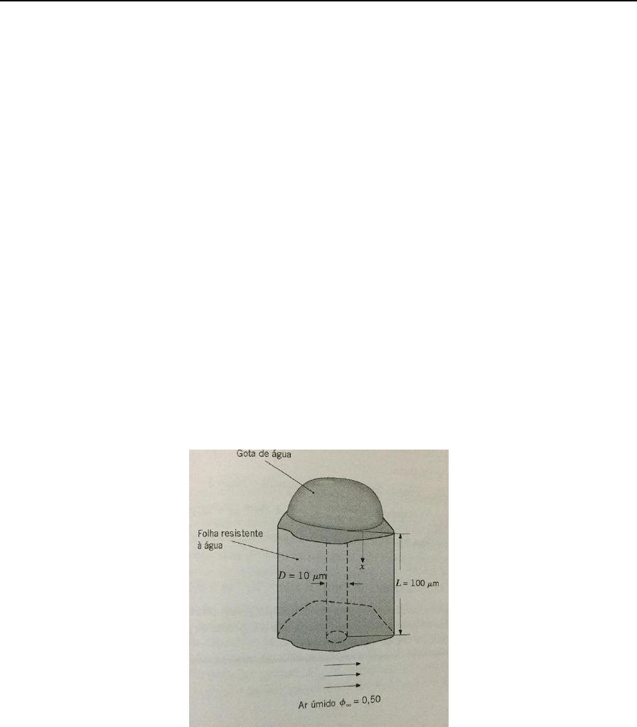 <p>UNIVERSIDADE FEDERAL DO RIO GRANDE</p><p>ESCOLA DE QUÍMICA E ALIMENTOS</p><p>DISCIPLINA DE FENÔMENOS DE TRANSPORTE III</p><p>Lista de Exercícios I (2024/01) – Equações da Continuidade em Transferência de Massa</p><p>1 – Obtenha a expressão da distribuição de fração molar do dióxido de carbono que difunde em uma</p><p>película estagnada de ar seco de 1 cm de profundidade a 1 atm e 25oC. Essa película está em um capilar, o</p><p>qual contém ácido sulfúrico. O CO2 é absorvido instantaneamente ao atingir o líquido. A concentração de</p><p>CO2 na boca do capilar é 1% em mol. Determine o fluxo global molar de CO2 absorvido na interface gás-</p><p>líquido, dado que DAB = 0,159cm2/s. (R: 6,54 x 10-8 mols/cm2 s)</p><p>2 – Monóxido de carbono difunde através de uma película de ar estagnado de 0,04 cm de espessura em</p><p>direção a uma corrente de ácido sulfúrico, onde é instantaneamente absorvido. Se a fração molar do CO</p><p>no lado oposto ao H2SO4 é 0,03, obtenha expressões para o seu fluxo molar e distribuição da fração</p><p>molar.</p><p>3 – Uma folha resistente à água usada para aplicações à prova d’água é formada com um material</p><p>polimérico impermeável. A microestrutura da folha é manipulada para fornecer poros abertos de diâmetro</p><p>D = 10 µm que se estendem por toda a espessura da folha, que é igual a L = 100 µm. O diâmetro do poro</p><p>é grande o suficiente para permitir que o vapor d’água seja transferido através do poro, mas é</p><p>suficientemente pequeno para proibir que água líquida penetre na folha. Determine a taxa na qual o vapor</p><p>d’água é transferido através de um único poro, quando líquido saturado está presente na superfície</p><p>superior da folha e ar úmido, a uma umidade relativa de 50%, está em contato com a superfície inferior da</p><p>folha. Calcule a taxa de transferência a uma temperatura T = 298 K e a uma pressão de 1 atm. Compare a</p><p>taxa de transferência à que é prevista desprezando-se o movimento molar médio da mistura no poro. (R:</p><p>13,4 x 10-15 kmol/s e 13 x 10-15 kmol/s).</p><p>4 – Um equipamento de laboratório para medir coeficientes de difusão de misturas vapor-gás,</p><p>denominado de Tubo de Stefan, é constituído por uma coluna vertical, com diâmetro pequeno, na qual há</p><p>uma fase líquida que evapora para um gás escoando sobre a boca da coluna. A vazão do gás é suficiente</p><p>para manter uma concentração do vapor desprezível no plano de saída. A coluna tem L= 150 mm de</p><p>altura, medida a partir da superfície líquida, conforme a figura, e a temperatura e a pressão na câmara são</p><p>mantidas a 320 K e 0,25 atm, respectivamente. Com o objetivo de calibração, foi solicitado a você que</p><p>calculasse a taxa de evaporação esperada (kg/(h m2)) em um teste com água e ar sob as condições</p><p>especificadas, usando o valor conhecido de DAB (1,157 x 10-4 m2/s) para a mistura vapor-ar. (R: 0,257 kg/h</p><p>m2).</p><p>5 – Uma panela aberta com 0,2 m de diâmetro e 80 mm de altura (acima da água a 27oC) está exposta ao</p><p>ar ambiente a 27oC e com 25% de umidade relativa. Determine a taxa de evaporação, admitindo que</p><p>ocorra somente difusão mássica. Determine a taxa de evaporação considerando também o movimento</p><p>global. (R: 1,102 x 10-5 mol/s e 1,127 x 10-5 mol/s).</p><p>6 – Um Tubo de Stefan de 3 cm de diâmetro é usado para medir o coeficiente de difusão binário de vapor</p><p>de água no ar a 20oC, a uma altitude de 1600 metros, em que a pressão atmosférica é 83,5 kPa. O tubo é</p><p>parcialmente preenchido com água, e a distância entre a superfície da água e a extremidade aberta do tubo</p><p>é 40 cm. Ar seco é soprado sobre a extremidade aberta do tubo, de forma que o vapor de água que sobe</p><p>até o topo seja removido imediatamente e a concentração de vapor na parte superior do tubo seja zero. Em</p><p>15 dias de operação contínua a pressão e temperatura constantes, a quantidade de água evaporada é</p><p>medida como sendo 1,23 g. Determine o coeficiente de difusão do vapor de água a 20oC e 83,5 kPa. (R:</p><p>3,06 x 10-5 m2/s).</p><p>7 – Certo gás A é dissolvido em um líquido B contido em uma proveta. Na medida em que A se difunde,</p><p>ele sofre reação química irreversível na forma A + B → L, até desaparecer completamente depois de</p><p>penetrar a uma distância δ da interface gás-líquido. Considerando: a) a cinética de reação é de ordem zero</p><p>com respeito a A ou jA = - k, como é o caso da oxidação na fase líquida de hidrocarbonetos por oxigênio e</p><p>ar; b) reação química lenta; c) a concentração do gás A dissolvido é pequena se comparada à do liquido</p><p>B; d) o produto da reação L é altamente solúvel no liquido, o que o leva a não influenciar a difusão do</p><p>soluto A; obtenha expressões para:</p><p>a) A distribuição de concentração molar de A;</p><p>b) O fluxo global molar de A na interface gás-líquido;</p><p>8 – Certo gás A é dissolvido em um líquido B contido em uma proveta. Na medida em que A difunde ele</p><p>sofre reação química irreversível na forma A + B → D, até desaparecer completamente depois de penetrar</p><p>a uma distância L da interface gás/líquido. Considerando: (a) a cinética da reação é de ordem zero com</p><p>respeito a A ou RA = -k0, como é o caso da oxidação na fase líquida de hidrocarbonetos por oxigênio e ar;</p><p>(b) reação química lenta; (c) a concentração do gás A dissolvido é pequena se comparada à do líquido B;</p><p>(d) o produto D da reação é altamente solúvel no líquido, o que o leva a não influenciar a difusão do</p><p>soluto A. Obtenha expressões para:</p><p>a) A distribuição da concentração molar de A entre z = 0 e z = L;</p><p>b) O fluxo global molar de A na interface gás-líquido.</p><p>9 - Considere o problema 