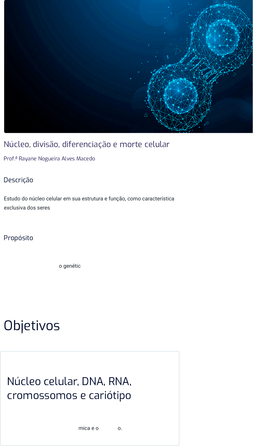 <p>Núcleo, divisão, diferenciação e morte celular</p><p>Prof.ª Rayane Nogueira Alves Macedo</p><p>Descrição</p><p>Estudo do núcleo celular em sua estrutura e função, como característica</p><p>exclusiva dos seres eucariontes; e da divisão, diferenciação e morte</p><p>celular.</p><p>Propósito</p><p>Reconhecer a estrutura do núcleo celular, assim como sua importância</p><p>em abrigar a informação genética responsável pela transmissão dos</p><p>caracteres hereditários e funcionamento dos organismos; além de</p><p>entender a divisão, diferenciação e morte celular como processos vitais</p><p>para os seres vivos.</p><p>Objetivos</p><p>Módulo 1</p><p>Núcleo celular, DNA, RNA,</p><p>cromossomos e cariótipo</p><p>Descrever a estrutura do núcleo da célula, as moléculas de DNA e</p><p>RNA, a organização cromossômica e o cariótipo.</p><p>Módulo 2</p><p>Ciclo e divisão celular</p><p>Identificar as etapas do ciclo e da divisão celular.</p><p>Módulo 3</p><p>Diferenciação e morte celular</p><p>Descrever os processos de diferenciação celular e de morte celular.</p><p>Introdução</p><p>Estudaremos, a partir de agora, conceitos relacionados à</p><p>estrutura do núcleo da célula eucarionte. Sabemos que todos os</p><p>seres vivos são constituídos por células, podendo se apresentar</p><p>de forma unicelular ou pluricelular. Sendo assim, as células são</p><p>classificadas como unidade básica para a vida, pois são dotadas</p><p>de informações necessárias à formação de um ser vivo.</p><p>Neste conteúdo, além de aprofundar nossos conhecimentos</p><p>sobre o núcleo (estrutura celular onde são armazenadas as</p><p>informações genéticas); entenderemos as diferenças entre as</p><p>moléculas de DNA e RNA; desvendaremos a organização dos</p><p>cromossomos, sua constituição e sua relação com o cariótipo;</p><p>conheceremos o ciclo celular e as etapas da divisão celular</p><p>(mitose e meiose). Por fim, fecharemos nossos estudos</p><p>compreendendo melhor os processos que levam à diferenciação</p><p>celular e morte celular, descobrindo por qual razão são tão</p><p>importantes para a manutenção da diversidade de seres vivos</p><p>que habitam a Terra, inclusive da espécie humana.</p><p></p><p>1 - Núcleo celular, DNA, RNA, cromossomos e</p><p>cariótipo</p><p>Ao �nal deste módulo, você será capaz de descrever a estrutura do</p><p>núcleo da célula, as moléculas de DNA e RNA, a organização</p><p>cromossômica e o cariótipo.</p><p>Estrutura do núcleo celular</p><p>O núcleo é uma organela que mede entre 5 e 10µm de diâmetro,</p><p>conforme a intensidade do metabolismo celular, ou seja, células com</p><p>alto metabolismo possuem núcleo maior em relação às células com</p><p>baixo metabolismo. O formato do núcleo, em geral, é compatível com a</p><p>morfologia da célula, por exemplo, células de formato prismático</p><p>possuem núcleo alongado.</p><p>Núcleo e retículo endoplasmático rugoso.</p><p>Nas células animais, é comum que o núcleo ocupe posição central no</p><p>citoplasma, enquanto nas células vegetais localiza-se na periferia. Em</p><p>geral, as células eucarióticas possuem somente um núcleo, que delimita</p><p>o espaço onde está abrigado o genoma (o material genético); com</p><p>exceção dos eritrócitos de mamíferos, células vermelhas do sangue que</p><p>perdem o seu núcleo durante a etapa de diferenciação celular. Por outro</p><p>lado, algumas células, como as do fígado e das fibras musculares</p><p>estriadas, caracterizam-se por serem polinucleadas, ou seja,</p><p>apresentarem mais de um núcleo.</p><p>A delimitação do genoma pelo núcleo faz dele o centro de controle da</p><p>célula. Uma de suas principais vantagens é o maior controle da</p><p>expressão gênica, com a replicação do DNA e a transcrição do DNA em</p><p>RNA ocorrendo dentro do núcleo, enquanto a tradução ou síntese de</p><p>proteínas, etapa final da expressão gênica, ocorrendo no citoplasma.</p><p>O núcleo celular terá características distintas, dependendo da etapa do</p><p>ciclo em que se encontra a célula. Veja a seguir as etapas do ciclo</p><p>celular:</p><p>Intérfase</p><p>Período entre divisões celulares, em que é observado o núcleo</p><p>interfásico. Nesta etapa, a célula se prepara para se dividir em duas</p><p>células-filhas, e há a replicação (autoduplicação) do DNA e a transcrição</p><p>do DNA em RNA.</p><p>Mitose</p><p>Período em que a célula começa e termina a divisão, dando origem a</p><p>duas células-filhas, quando observamos o núcleo mitótico.</p><p>Vamos estudar o ciclo celular e a divisão celular mais a fundo no</p><p>próximo tópico, mas antes precisamos conhecer a estrutura do núcleo</p><p>interfásico, em que estão presentes os seguintes componentes:</p><p>envelope nuclear, cromatina, nucleoplasma e nucléolo.</p><p>Estrutura do núcleo celular.</p><p>Envelope nuclear</p><p>Também chamado envoltório nuclear, separa o conteúdo nuclear do</p><p>citoplasma, sendo visível somente em microscopia eletrônica. É</p><p>formado por dupla membrana lipoproteica, constituída de 30% de</p><p>lipídeos e 70% de proteínas, onde estão presentes poros.</p><p>A membrana nuclear externa caracteriza-se por ser contínua com o</p><p>retículo endoplasmático rugoso e pode apresentar ribossomos aderidos</p><p>à face voltada para o citoplasma.</p><p>A membrana nuclear interna caracteriza-se por possuir, na face interna,</p><p>voltada para o nucleoplasma, uma rede fibrosa proteica de filamentos</p><p>intermediários denominada lâmina nuclear, descontínua na região dos</p><p>poros. Essa lâmina nuclear mantém a forma e a estrutura do envelope. É</p><p>responsável pela ligação da cromatina ao envelope. Durante a mitose,</p><p>ocorre redução na interação entre os componentes da lâmina nuclear,</p><p>fazendo com que se desfaça e, consequentemente, também o e