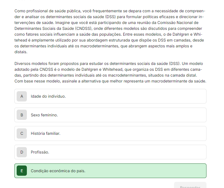 <p>Como profissional de saúde pública, você frequentemente se depara com a necessidade de compreen- der e analisar os determinantes sociais da saúde (DSS) para formular políticas eficazes e direcionar in- tervenções de saúde. Imagine que você está participando de uma reunião da Comissão Nacional de Determinantes Sociais da Saúde (CNDSS), onde diferentes modelos são discutidos para compreender como fatores sociais influenciam a saúde das populações. Entre esses modelos, de Dahlgren e Whi- tehead é amplamente utilizado por sua abordagem estruturada que dispõe os DSS em camadas, desde os determinantes individuais até os macrodeterminantes, que abrangem aspectos mais amplos e distais. Diversos modelos foram propostos para estudar os determinantes sociais da saúde (DSS). Um modelo adotado pela CNDSS é O modelo de Dahlgren e Whitehead, que organiza os DSS em diferentes cama- das, partindo dos determinantes individuais até os macrodeterminantes, situados na camada Com base nesse modelo, assinale a alternativa que melhor representa um macrodeterminante da A Idade do B Sexo C História familiar. D E Condição econômica do país.</p>