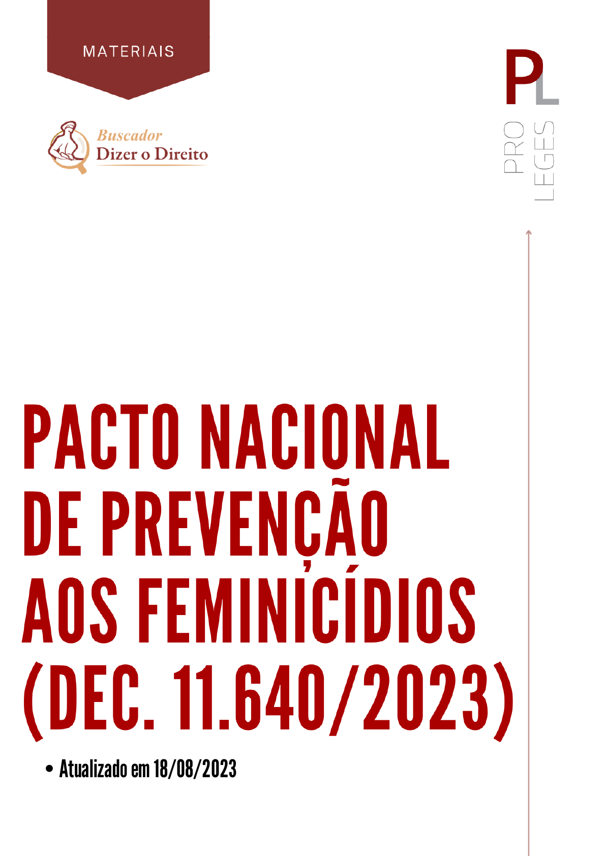 <p> Atualizado em 18/08/2023</p><p>B</p><p>u</p><p>scad</p><p>o</p><p>r D</p><p>izer o</p><p>D</p><p>ireito</p><p>- w</p><p>w</p><p>w</p><p>.b</p><p>u</p><p>scad</p><p>o</p><p>rd</p><p>izero</p><p>d</p><p>ireito</p><p>.co</p><p>m</p><p>.b</p><p>r</p><p>D</p><p>isponibilizado para: E</p><p>D</p><p>N</p><p>A</p><p>R</p><p>D</p><p>O</p><p>S</p><p>ILV</p><p>A</p><p>C</p><p>O</p><p>S</p><p>T</p><p>A</p><p>| ednardo.costa262@</p><p>gm</p><p>ail.com</p><p>| C</p><p>P</p><p>F</p><p>: 095.575.497-69</p><p>Pág. 1 de 16</p><p>www.proleges.com.br</p><p>PACTO NACIONAL DE PREVENÇÃO AOS FEMINICÍDIOS – DEC. 11.640/2023</p><p>(SUMÁRIO)</p><p>PACTO NACIONAL DE PREVENÇÃO AOS FEMINICÍDIOS (DECRETO 11.640/2023) ....................................... 2</p><p>CAPÍTULO I DO PACTO NACIONAL DE PREVENÇÃO AOS FEMINICÍDIOS ........................................................................................................... 2</p><p>CAPÍTULO II DOS EIXOS ESTRUTURANTES ......................................................................................................................................................... 4</p><p>CAPÍTULO III DO COMITÊ GESTOR .................................................................................................................................................................... 7</p><p>CAPÍTULO IV DISPOSIÇÕES FINAIS .................................................................................................................................................................... 9</p><p>OUTRAS LEIS ...................................................................................................................................................................... 10</p><p>INFORMATIVOS ................................................................................................................................................................. 14</p><p>Dúvidas, sugestões e críticas:</p><p> Favor enviar para: marcoavtorrano@gmail.com</p><p> Instagram: @marcoavtorrano / @proleges</p><p>B</p><p>u</p><p>scad</p><p>o</p><p>r D</p><p>izer o</p><p>D</p><p>ireito</p><p>- w</p><p>w</p><p>w</p><p>.b</p><p>u</p><p>scad</p><p>o</p><p>rd</p><p>izero</p><p>d</p><p>ireito</p><p>.co</p><p>m</p><p>.b</p><p>r</p><p>D</p><p>isponibilizado para: E</p><p>D</p><p>N</p><p>A</p><p>R</p><p>D</p><p>O</p><p>S</p><p>ILV</p><p>A</p><p>C</p><p>O</p><p>S</p><p>T</p><p>A</p><p>| ednardo.costa262@</p><p>gm</p><p>ail.com</p><p>| C</p><p>P</p><p>F</p><p>: 095.575.497-69</p><p>proleges.com.br pág. 2 de 16</p><p>DIREITOS HUMANOS</p><p>E DIREITO PENAL</p><p>PACTO NACIONAL DE PREVENÇÃO AOS FEMINICÍDIOS</p><p>(DECRETO 11.640/2023)</p><p>CAPÍTULO I</p><p>DO PACTO NACIONAL DE PREVENÇÃO AOS FEMINICÍDIOS</p><p>Art. 1º Fica instituído o Pacto Nacional de Prevenção aos Feminicídios, com o objetivo de prevenir todas</p><p>as formas de discriminação, misoginia e violência de gênero contra as mulheres por meio da implementação</p><p>de ações governamentais intersetoriais, da perspectiva de gênero e de suas interseccionalidades.</p><p>Pacto Nacional de Prevenção aos Feminicídios</p><p>(Dec. 11.640/2023)</p><p>Objetivo Objetivos específicos</p><p>Art. 1º Fica instituído o Pacto Nacional de Prevenção</p><p>aos Feminicídios, com o objetivo de prevenir todas</p><p>as formas de discriminação, misoginia e violência de</p><p>gênero contra as mulheres por meio da implementa-</p><p>ção de ações governamentais intersetoriais, da pers-</p><p>pectiva de gênero e de suas interseccionalidades.</p><p>Art. 3º São objetivos específicos do Pacto Nacional</p><p>de Prevenção aos Feminicídios:</p><p>I - fomentar o desenvolvimento de ações governa-</p><p>mentais de prevenção primária, secundária e terciá-</p><p>ria a todas as formas de discriminação, misoginia e</p><p>violência de gênero contra as mulheres, em sua di-</p><p>versidade, de forma articulada, intersetorial, multi-</p><p>disciplinar, interministerial e interfederativa, envol-</p><p>vidos os órgãos da administração pública federal, os</p><p>governos estaduais, municipais e distrital; e</p><p>II - envolver a sociedade civil nos processos de parti-</p><p>cipação e controle social das ações de prevenção pri-</p><p>mária, secundária e terciária a todas as formas de</p><p>discriminação, misoginia e violência de gênero con-</p><p>tra as mulheres, em sua diversidade.</p><p>Parágrafo único. As ações governamentais do Pacto Nacional de Prevenção aos Feminicídios serão</p><p>implementadas com vistas a prevenir as mortes violentas de mulheres em razão da desigualdade de gênero</p><p>e garantir os direitos e o acesso à justiça às mulheres em situação de violência e aos seus familiares.</p><p>Art. 2º O Pacto Nacional de Prevenção aos Feminicídios é um instrumento de articulação e</p><p>operacionalização dos objetivos, das diretrizes e dos princípios descritos na Política Nacional de</p><p>Enfrentamento à Violência contra as Mulheres.</p><p>Princípios da Política Nacional de Enfrentamento à Violência contra as Mulheres</p><p>A Política Nacional para as Mulheres orienta-se pelos princípios propostos no Plano Nacional de Políticas</p><p>para as Mulheres (2004) nos seguintes pontos fundamentais:</p><p>1. Igualdade e respeito à diversidade</p><p>Mulheres e homens são iguais em seus direitos. A promoção da</p><p>igualdade implica no respeito à diversidade cultural, étnica, ra-</p><p>cial, inserção social, situação econômica e regional, assim como</p><p>os diferentes momentos da vida das mulheres.</p><p>AUTOR: MARCO TORRANO</p><p>INSTAGRAM: @MARCOAVTORRANO/@PROLEGES</p><p>E-MAIL: MARCOAVTORRANO@GMAIL.COM</p><p>B</p><p>u</p><p>scad</p><p>o</p><p>r D</p><p>izer o</p><p>D</p><p>ireito</p><p>- w</p><p>w</p><p>w</p><p>.b</p><p>u</p><p>scad</p><p>o</p><p>rd</p><p>izero</p><p>d</p><p>ireito</p><p>.co</p><p>m</p><p>.b</p><p>r</p><p>D</p><p>isponibilizado para: E</p><p