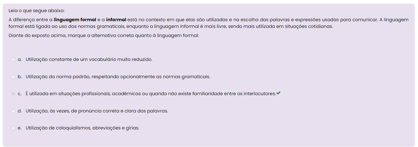 <p>Leia que segue abaixo: A diferença entre a linguagem formal e a informal está no contexto em que elas são utilizadas e na escolha das palavras e expressões usadas para comunicar. A linguagem formal está ligada ao uso das normas gramaticais, enquanto a linguagem informal é mais livre, sendo mais utilizada em situações Diante do exposto acima, marque a alternativa correta quanto à linguagem formal: a. Utilização constante de um vocabulário muito reduzido. b. Utilização da norma padrão, respeitando opcionalmente as normas gramaticais. C. É utilizada em situações profissionais, acadêmicas ou quando não existe familiaridade entre os interlocutores. d. Utilização, às vezes, de pronúncia correta e clara das palavras. e. Utilização de coloquialismos, abreviações e</p>