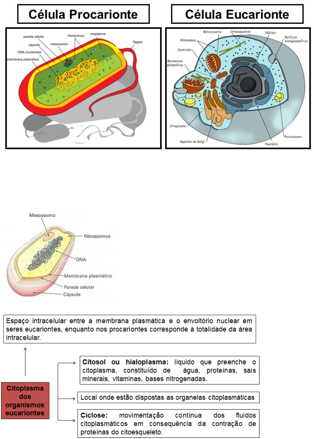 <p>CCiittooppllaassmmaa ee oorrggaanneellaass cciittooppllaassmmááttiiccaass</p><p>CITOPLASMA – ORGANISMOS PROCARIONTES</p><p>Ribossomos - Realiza a síntese de proteínas;</p><p>Mesossomo - invaginação da membrana plasmática e tem como função realizar a respiração celular de</p><p>seres procariontes;</p><p>Nucleóide - Tem como função o comando geral da célula;</p><p>CITOESQUELETO</p><p>Um verdadeiro “esqueleto” formado por vários tipos de fibras de proteínas cruza a célula em</p><p>diversas direções, dando-lhe consistência e firmeza.</p><p>Entre as fibras protéicas componentes desse “citoesqueleto” podem ser citados os:</p><p>- Microfilamentos.</p><p>- Filamentos intermediários.</p><p>- Microtúbulos</p><p>MICROFILAMENTOS:</p><p>- Proteínas actina e miosina</p><p>- Contração muscular nos seres pluricelulares</p><p>- Miócitos: fibras musculares</p><p>Cada sarcômero ou miômero é constituído por um complexo de proteínas, entre as</p><p>quais actina e miosina, alinhados em série para formar uma estrutura cilíndrica designada miofibrila, no</p><p>interior das células musculares.</p><p>O retículo sarcoplasmático é o retículo endoplasmático das células musculares. É especializado no</p><p>armazenamento de íons cálcio, e quando libera esse cálcio para o citoplasma dá-se a contração muscular</p><p>(deslizamento da actina sobre a miosina.</p><p>FILAMENTOS INTERMEDIÁRIOS:</p><p>- Proteínas fibrosas;</p><p>- Queratina;</p><p>- Células epiteliais;</p><p>- Fornece resistência.</p><p>MICROTÚBULOS:</p><p>- Proteína tubulina;</p><p>- Formação dos centríolos;</p><p>- Formação de cílios e flagelos.</p><p>CENTRÍOLOS</p><p>- Ocorrem nos protistas, animais, vegetais inferiores;</p><p>- Ausentes nos vegetais superiores;</p><p>- Célula animal: tem um par de centríolos (diplossomos)</p><p>- Localização: centro celular ou centrossoma.</p><p>9 x 3 = 27 microtúbulos = centríolos</p><p>FUNÇÕES DOS CENTRÍOLOS</p><p>- Auxilia nas divisões celulares (Mitose e meiose).</p><p>- Formação do fuso acromático e orientação dos cromossomos.</p><p>FORMAÇÃO DE CÍLIOS DE FLAGELOS.</p><p>Tanto os cílios como flagelos são originados por uma região organizadora no interior da célula, conhecida</p><p>como corpúsculo basal ou cinetossoma.</p><p>Flagelos</p><p>- Poucos e longos</p><p>- Função: Locomoção</p><p>Pluricelulares (espermatozoides)</p><p>Unicelulares (Tripanossoma cruzi)</p><p>Cílios</p><p>- Muitos e curtos</p><p>- Função: Locomoção e nutrição nos seres unicelulares (Paramécio)</p><p>- Seres pluricelulares: Tubas uterinas e vias respiratórias.</p><p>ORGANELAS CITOPLASMÁTICAS - CÉLULAS EUCARIONTES</p><p>RIBOSSOMO</p><p>- Função: Síntese de proteínas;</p><p>- Formado por RNA ribossômico e proteínas;</p><p>- Dispersos no hialoplasma e em conjuntos (polirribossomos ou polissomos) nesse caso as proteínas</p><p>produzidas em geral são para consumo interno.</p><p>- Aderidos a membrana do retículo endoplasmático rugoso. As proteínas produzidas geralmente são para</p><p>exportação.</p><p>COMO SURGIU AS ORGANELAS MEMBRANOSAS?</p><p>TEORIA ENDOSSIMBIÓTICA (LYNN MARGULIS) mitocôndrias e cloroplastos.</p><p>Existem algumas evidências que sustentam essa hipótese: Apresentam DNA (semelhante com o</p><p>das bactérias atuais) e ribossomos próprios; realizam a síntese de proteínas; são capazes</p><p>autoduplicação dentro da célula e presença de duas membranas.</p><p>MITOCÔNDRIA</p><p>- Principal função é a geração de energia através da síntese do trifosfato de adenosina (ATP).</p><p>- Realiza a respiração celular aeróbica.</p><p>- Todo o conteúdo citoplasmático do embrião é oriundo do óvulo, inclusive suas organelas.</p><p>- O espermatozoide leva somente o seu núcleo para dentro do óvulo no momento da fecundação.</p><p>DOENÇAS CAUSADAS POR MUTAÇÕES NO DNA MITOCONDRIAL</p><p>- Mal de Alzheimer: Perda progressiva da capacidade cognitiva.</p><p>- Diabetes mitocondriais” é um caso raro da doença que é causada por uma mutação no DNA da</p><p>mitocôndria de células beta pancreáticas, e é transmitido maternalmente. Diabetes Mitocondrial não é</p><p>caracterizada pela resistência e sim pela diminuição da produção de insulina.</p><p>CLOROPLASTO</p><p>- São organelas presentes nas células de vegetais e de outros organismos que realizam</p><p>fotossíntese como, por exemplo, as algas.</p><p>TEORIA DA INVAGINAÇÃO (ROBERTSON)</p><p>RETICULO ENDOPLASMÁTICO</p><p>COMPLEXO GOLGIENSE</p><p>- Constituído de vários conjuntos de sáculos achatados e empilhados. Cada um desses conjuntos constitui</p><p>um sáculo lameliforme, antes chamado de dictiossomos ou golgiossomos.</p><p>Funções:</p><p>- Armazena processa empacota secreta;</p><p>- Formação do lisossoma;</p><p>- Formação do acrossoma;</p><p>- Síntese de polissacarídeos;</p><p>- Formação e renovação do glicocálix;</p><p>- Formação do fragmoplasto.</p><p>Armazena processa empacota secreta</p><p>1- R. E. Rugoso sintetiza e transporta proteínas, através de vesículas de transferência.</p><p>3- se fundem às membranas do complexo golgiense;</p><p>2- Golgi armazena e modifica as proteínas;</p><p>4- grânulos aderem à membrana plasmática e ocorre a exocitose.</p><p>5- outras proteínas tem uso interno – contidas em vesículas denominadas lisossomas (organelas</p><p>fundamentais para digestão intracelular).</p><p>Armazena processa empacota secreta</p><p>- Suco pancreático (repleto de enzimas digestivas) produzido no pâncreas lançado no intestino</p><p>delgado.</p><p>- As enzimas digestivas (proteínas) são produzidas no retículo endoplasmático rugoso e transferida para o</p><p>complexo golgiense por vesículas de transferência.</p><p>- Depois de armazenadas no Golgi podem sofrer transformações, são empacotadas e formam grânulos de</p><p>secreção. Após fundem-se na membrana e o conteúdo é liberado 