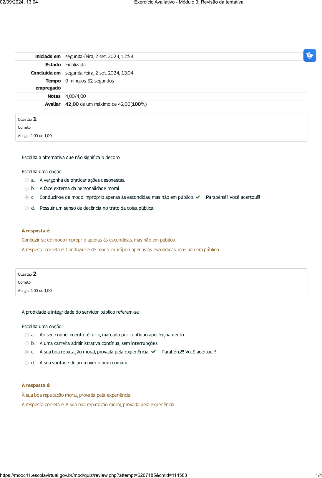 <p>Iniciado em segunda-feira, 2 set. 2024, 12:54</p><p>Estado Finalizada</p><p>Concluída em segunda-feira, 2 set. 2024, 13:04</p><p>Tempo</p><p>empregado</p><p>9 minutos 52 segundos</p><p>Notas 4,00/4,00</p><p>Avaliar 42,00 de um máximo de 42,00(100%)</p><p>Questão 1</p><p>Correto</p><p>Atingiu 1,00 de 1,00</p><p>Questão 2</p><p>Correto</p><p>Atingiu 1,00 de 1,00</p><p>Escolha a alternativa que não signi�ca o decoro:</p><p>Escolha uma opção:</p><p>a. A vergonha de praticar ações desonestas.</p><p>b. A face externa da personalidade moral.</p><p>c. Conduzir-se de modo impróprio apenas às escondidas, mas não em público. Parabéns!!! Você acertou!!!</p><p>d. Possuir um senso de decência no trato da coisa pública.</p><p>A resposta é:</p><p>Conduzir-se de modo impróprio apenas às escondidas, mas não em público.</p><p>A resposta correta é: Conduzir-se de modo impróprio apenas às escondidas, mas não em público.</p><p>A probidade e integridade do servidor público referem-se:</p><p>Escolha uma opção:</p><p>a. Ao seu conhecimento técnico, marcado por contínuo aperfeiçoamento.</p><p>b. A uma carreira administrativa contínua, sem interrupções.</p><p>c. À sua boa reputação moral, provada pela experiência. Parabéns!!! Você acertou!!!</p><p>d. À sua vontade de promover o bem comum.</p><p>A resposta é:</p><p>À sua boa reputação moral, provada pela experiência.</p><p>A resposta correta é: À sua boa reputação moral, provada pela experiência.</p><p>02/09/2024, 13:04 Exercício Avaliativo - Módulo 3: Revisão da tentativa</p><p>https://mooc41.escolavirtual.gov.br/mod/quiz/review.php?attempt=6267185&cmid=114583 1/4</p><p>Questão 3</p><p>Correto</p><p>Atingiu 1,00 de 1,00</p><p>Um código de ética pro�ssional é:</p><p>Escolha uma opção:</p><p>a. Um conjunto de regras disciplinares que visa punir os maus servidores públicos.</p><p>b. Um catálogo de ações exemplares numa pro�ssão.</p><p>c. Uma declaração de princípios e valores fundamentais de uma determinada categoria pro�ssional,</p><p>acompanhada de normas que os concretizem.</p><p> Parabéns!!! Você</p><p>acertou!!</p><p>d. Um guia de autoajuda para quem quiser ser bem-sucedido numa determinada pro�ssão.</p><p>A resposta é:</p><p>Uma declaração de princípios e valores fundamentais de uma determinada categoria pro�ssional, acompanhada de normas que os</p><p>concretizem.</p><p>A resposta correta é: Uma declaração de princípios e valores fundamentais de uma determinada categoria pro�ssional, acompanhada</p><p>de normas que os concretizem.</p><p>02/09/2024, 13:04 Exercício Avaliativo - Módulo 3: Revisão da tentativa</p><p>https://mooc41.escolavirtual.gov.br/mod/quiz/review.php?attempt=6267185&cmid=114583 2/4</p><p>Questão 4</p><p>Correto</p><p>Atingiu 1,00 de 1,00</p><p>Assinale com V para verdadeiro ou F para falso as a�rmações abaixo:</p><p>Para o aperfeiçoamento da conduta ética do servidor público, é importante que ele cumpra o que está previsto na</p><p>lei e desenvolva uma capacidade de re�exão sobre a correção de seus atos enquanto pro�ssional.</p><p></p><p>Regras imperativas orientam o indivíduo quanto a como fazer algo e regras constitutivas simplesmente proíbem</p><p>ou ordenam.</p><p></p><p>A ambição de um pro�ssional de acumular riquezas e ser competitivo é adequada aos valores da administração</p><p>pública.</p><p></p><p>A atuação pro�ssional do servidor público exige que ele aja com imparcialidade, baseado não nos seus interesses e</p><p>preferências pessoais, mas no interesse e bem públicos.</p><p></p><p>A administração pública exige daqueles que se dedicam ao seu exercício competência e objetividade racional.</p><p></p><p>Os códigos de conduta ética do servidor público são meios para orientá-lo a discernir quanto à probidade e</p><p>integridade de suas ações.</p><p></p><p>O esforço que cada servidor público �zer para aperfeiçoar o decoro, a probidade e a integridade de suas ações não</p><p>in�ui em nada no modo como o Estado é visto pelos cidadãos.</p><p></p><p>O servidor público pode justi�car um ato ilegal, alegando que estava seguindo o Código de Ética.</p><p></p><p>A Comissão de Ética Pública (CEP) atua como instância consultiva e normativa acerca da conduta ética de</p><p>autoridades do Poder Executivo.</p><p></p><p>Verdadeiro</p><p>Falso</p><p>Falso</p><p>Verdadeiro</p><p>Verdadeiro</p><p>Verdadeiro</p><p>Falso</p><p>Falso</p><p>Verdadeiro</p><p>Para o aperfeiçoamento da conduta ética do servidor público, é importante que ele cumpra o que está previsto na lei e desenvolva uma</p><p>capacidade de re�exão sobre a correção de seus atos enquanto pro�ssional. - Verdadeiro</p><p>Regras imperativas orientam o indivíduo quanto a como fazer algo e regras constitutivas simplesmente proíbem ou ordenam. - Falso</p><p>A ambição de um pro�ssional de acumular riquezas e ser competitivo é adequada aos valores da administração pública. - Falso</p><p>A atuação pro�ssional do servidor público exige que ele aja com imparcialidade, baseado não nos seus interesses e preferências</p><p>pessoais, mas no interesse e bem públicos. - Verdadeiro</p><p>A administração pública exige daqueles que se dedicam ao seu exercício competência e objetividade racional. - Verdadeiro</p><p>Os códigos de conduta ética do servidor público são meios para orientá-lo a discernir quanto à probidade e integridade de suas ações.-</p><p>Verdadeiro</p><p>O esforço que cada servidor público �zer para aperfeiçoar o decoro, a probidade e a integridade de suas ações não in�ui em nada no</p><p>modo como o Estado é visto pelos cidadãos.- Falso</p><p>O servidor público pode justi�car um ato ilegal, alegando que estava seguindo o Código de Ética.- Falso</p><p>A Comissão de Ética Pública (CEP) atua como instância consultiva e normativa acerca da conduta ética de autoridades do