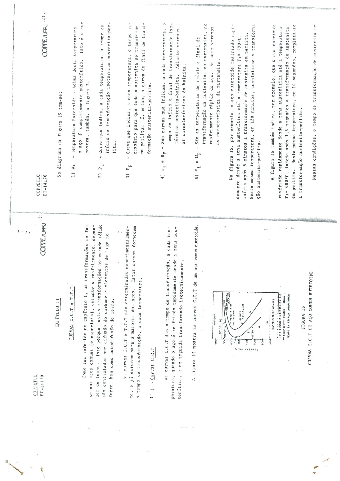 <p>COPPETEC COPPETEC .20 ET-14170 COPPE/UFRJ ET-14170 COPPE/UFRJ CAPÍTULO II No diagrama da figura 15 CURVAS C.C.T e T.T.T 1) A1 - Temperatura Eutetoide - Acima desta temperatura o aço completamente austenítico. Isto o que Como foi referido no capítulo I, as transformações de fa- a figura 7. se nos aços comuns (e especiais) durante o resfriamento, dem de tempo. Isto estas transformações no estado sólido 2) Curva que indica, a cada o tempo de são controlados por difusão do carbono e elementos de liga no início de transformação isotermica austenita-per- ferro. bem como autodifusão do ferro. lita. As curvas C.C.T e T.T.T são determinadas experimentalmen- 3) Curva que a cada o tempo ne- e já existem para a maioria dos aços. Estas curvas fornecem cessário para que toda a austenita se transforme o tempo de a cada temperatura. em perlita. E. a curva de final de trans- formação 11.1 - Curvas C.C.T 4) e F São curvas que a cada As curvas C.C.T dão o tempo de transformação, a cada tem- tempo de início final de transformação iso- peratura, quando o aço é resfriado rapidamente desde a zona aus- Adiante veremos e em seguida transformado isotermicamente. as da A figura 15 mostra as curvas C.C.T de um aço comum eutetoide. 5) e M São as temperaturas de início e final de transformação da em martensita, no resfriamento rápido do Adiante veremos as característica da martensita. A1 AUSTENITA PERLITA FINA Na figura por exemplo, aço eutetoide resfriado rapi- damente desde a zona austenítica até a temperatura T1= 700°C. 500 10 401 inícia após 8 minutos a transformação de austenita em perlita. Nesta mesma temperatura, em 120 completa-se a transforma ção austenita-perlita 200 A figura 15 também indica, por que o aço eutetoide resfriado rapidamente desde a zona austenitica até a temperatura T2= inicia após 1,5 segundos a transformação de austenita TEMPO ESCALA em perlita. Nesta mesma em 10 segundos, completa-se a transformação FIGURA 15 CURVAS C.C.T DE AÇO COMUM EUTETOIDE Nestas condições, o tempo de transformação de austenita em</p><p>COPPETEC COPPETEC ET-14170 COPPE/UFRJ COPPE/UFRJ ET-14170 perlita é tanto quanto menor for a temperatura de transfor Nas figuras 16 e 17, as curvas PF i e B e as tempe mação. raturas M. e M F têm o mesmo visto anteriormente. Por outro lado, a espessura das lamelas de cementita e Na figura 16 ferrita, da perlita, varia com a temperatura. Quanto menor a temperatura. menor a espessura S dessas lamelas. Por a 1. Temperatura - é a temperatura de início de transfor perlita formada a 700°C tem espessura S mm, e a perlita for- mação da austenita em ferrita, tal como indica a figura mada a 600°C tem espessura S mm. Esta espessura das lamelas 7. No aço hipoeutetoide, acima desta temperatura. tem- influe acentuadamente nas propriedades A perlita for- se apenas austenita; mada a 700°C tem dureza Rockwell-C= enquanto a perlita forma- da a 600°C tem dureza 40. o limite de escoamento 2. Curva indica, a cada temperatura, tempo de iní- varia na mesma proporção. cio de transformação isotermica da austenita em ferrita. As figuras 16 e 17, indicam as curvas C.C.T de Na figura 17 tem-se: ção de um aço comum e de um aço comum hipereutetoide. 1. Temperatura ACm - a temperatura de início de transfor mação da austenita em tal como o indica a fi gura 7. No aço acima desta tem-se apenas austenita; 2. Curva - indica, a cada temperatura. tempo de iní- cio de transformação isotermica da austenita em cementi AUSTENITA AUSTENITA ta. 900 P. As curvas C.C.T dos aços comuns hipoeutetoides e hipereute 500 toides estão, em à esquerda das curvas C.C.T dos aços comuns eutetoides. E o que se evidencia através das figuras 100 16 e 17. Isto significa que, no aço comum eutetoide, as 200 200 formações isotermicas de austenita em perlita e bainita são, em 100 mais lentas que nos aços comuns hipoeutetoides e hipereute is 30 4 15 toides. TEMPO EM ESCALA TEMPO EM ESCALA LOGARITINICA Nos aços a temperatura mínima de transformação aus FIGURA 16 FIGURA 17 tenita-perlita, está em torno de E a temperatura corres CURVAS C.C.T- CURVAS C.C.T- pondente ao cotovelo da curva C.C.T (figura 15). ACO COMUM HIPOEUTETOIDE ACO COMUM HIPEREUTETOIDE</p><p>COPPETEC COPPETEC ET-14170 COPPE/UFRJ ET-14170 COPPE/UFRJ - Curvas T.T.T As curvas B i e B F são de início e final de transformação da austenita em bainita, em resfriamento contínuo ou em transfor- As curvas T.T.T indicam tempo de início e final de trans mação isotermica. As temperaturas M. e MF têm o mesmo signi- formação da austenita, em resfriamento contínuo. A figura 18 mos ficado que nas curvas C.C.T. tra as curvas T.T.T de um aço comum eutetoide. As curvas nontilha das são as C.C.T do mesmo aço. Nestas as curvas e F de resfriamento nuo, estão deslocados para direita, em relação às mesmas curvas de transformação isotermica. As figuras 19 e 20 mostram as curvas T.T.T de resfriamento 100 contínuo de um aço comum hipeutetoide e hipereutetoide. Nestas 600 as curvas são também de final de da aus tenita em ferrita (curva 19) e cementita (curva para o resfria 500 mento 400 300 200 T°C 100 900 2 A3 800 - Minutes - - TEMPO EM ESCALA LOGARITIMICA 700 Pf 600 FIGURA 18 500 CURVAS T.T.T COMUM EUTETOIDE 400 Bi Bf 300 200 A figura 18 evidencia a semelhança entre as curvas C.C.T 100 T.T.T. Na figura 18. tem-se Int 2 4 8 15 30 2 4 15 2 15 30 SEGUNDOS MINUTOS HORAS de início de transformação da aus- tenita em perlita; CURVA 19 Curva de início de transformação da austenita em CURVAS T.T.T DE AÇO COMUM HIPOEUTETOIDE perlita, em resfriamento contínuo; Curva de final de transformação isotermica da auste nita em perlita; PF Curva de final de transformação da austenita em per lita, em resfriamento</p><p>COPPETEC COPPETEC .26. ET-14170 ET-14170 COPPE/UFRJ COPPE/UFRJ Suponhamos que um aço comum hipoeutetoide é resfriado de a zona com as seguintes velocidades V de resfria- me