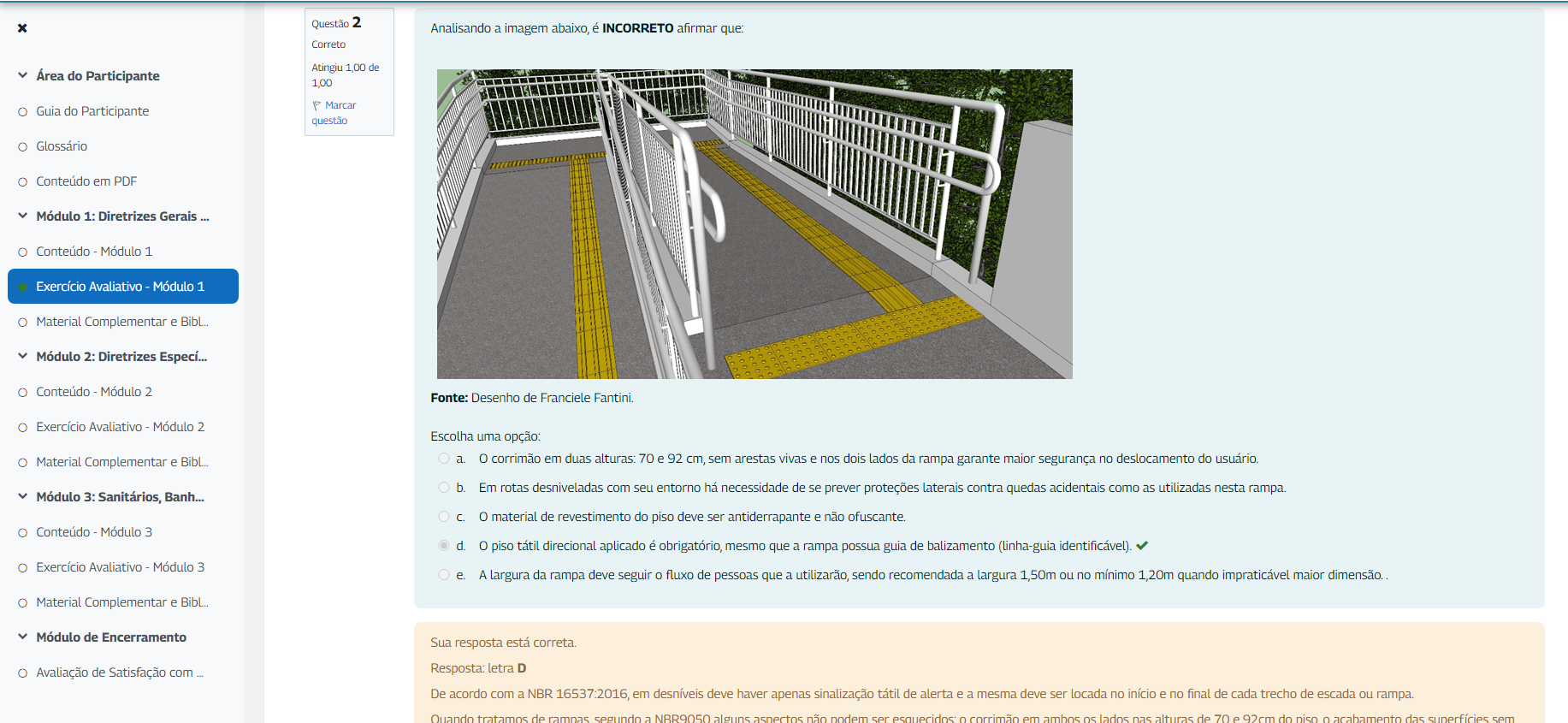 <p>Questao Analisando a imagem abaixo, é INCORRETO afirmar Correto Atingiu 1,00 de Área do Participante 1,00 P Marcar Guia do Participante questão Glossário Conteúdo em PDF Módulo 1: Diretrizes Gerais Conteúdo Módulo 1 Exercício Avaliativo - Módulo 1 Material Complementar e Módulo 2: Diretrizes Especí... Conteúdo - Módulo 2 Fonte: Desenho de Franciele Fantini. Exercício Avaliativo - Módulo 2 Escolha uma opção: Material Complementar e o corrimão em duas alturas: 70 e 92 cm, sem arestas vivas e nos dois lados da rampa garante maior segurança no deslocamento do usuário. b. Em rotas desniveladas com seu entorno há necessidade de se prever proteções laterais contra quedas acidentais como as utilizadas nesta Módulo 3: Sanitários, Banh... o material de revestimento do piso deve ser antiderrapante e não ofuscante. Conteúdo Módulo 3 d. o piso tátil direcional aplicado é obrigatório, mesmo que a rampa possua guia de balizamento (linha-guia identificável). Exercício Avaliativo - Módulo 3 e. A largura da rampa deve seguir fluxo de pessoas que a utilizarão, sendo recomendada a largura 1,50m ou no mínimo 1,20m quando impraticável dimensão. Material Complementar e Bibl... Módulo de Encerramento Sua resposta está correta. Avaliação de Satisfação com Resposta: letra D De acordo com a NBR 16537:2016, em desníveis deve haver apenas sinalização tátil de alerta e a mesma deve ser locada no início e no final de cada trecho de escada ou rampa Quando tratamos de rampas segundo a NBR9050 alguns aspectos não podem ser esquecidos o corrimão em ambos os lados nas alturas de 70 92cm piso</p>