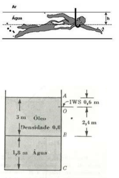 <p>Lista de Exercícios 01 – Mecânica dos Fluidos</p><p>Aluno1:_____________________________Matrícula:_________</p><p>Aluno2:_____________________________Matrícula:_________</p><p>Aluno3:_____________________________Matrícula:_________</p><p>Aluno4:_____________________________Matrícula:_________</p><p>Prof. Ronaldo Moura (e-mail: zzdmoura@gmail.com)</p><p>Data:__/__/2023</p><p>Questões - Hidrostática</p><p>1) Durante uma tempestade de 20 minutos, 10 mm de chuva caíram sobre uma região cuja área total é 100 km2 .Sendo que a densidade da água é de 1,0 g/cm3 , qual a massa de água que caiu?</p><p>2) (Ufpe 2005) É impossível para uma pessoa respirar se a diferença de pressão entre o meio externo e o ar dentro dos pulmões for maior do que 0,05 atm. Calcule a profundidade máxima, h, dentro d'água, em cm, na qual um mergulhador pode respirar por meio de um tubo, cuja extremidade superior é mantida fora da água.</p><p>3) O tanque da Figura abaixo contém óleo e água. Determinar a força resultante no lado ABC que tem 1,2m de largura.</p><p>4) Um adestrador quer saber o peso de um elefante. Utilizando uma prensa hidráulica, consegue equilibrar o elefante sobre um pistão de 2000cm2 de área, exercendo uma força vertical F equivalente a 200N, de cima para baixo, sobre o outro pistão da prensa, cuja área é igual a 25cm2 . Calcule o peso do elefante.</p><p>5) Uma pessoa, com o objetivo de medir a pressão interna de um botijão de gás contendo butano, conecta à válvula do botijão um manômetro em forma de U, contendo mercúrio. Ao abrir o registro R, a pressão do gás provoca um desnível de mercúrio no tubo, como ilustrado na figura. Considere a pressão atmosférica dada por 105 Pa, o desnível h = 104 cm de Hg e a secção do tubo 2 cm2 . Adotando a massa específica do mercúrio igual a 13,6 g/cm3 e g = 10 m/s2 , calcule a pressão do gás, em pascal.</p><p>6) Observando a Figura abaixo:</p><p>a) Determinar a resultante P devida à ação da água na área AB retangular de 1m X 2m;</p><p>b) Determinar a força resultante devida à ação da água na área triangular CD de 1,5m X 2m.</p><p>7) Um objeto prismático de 200mm de espessura, por 200mm de largura e 400mm de comprimento foi pesado na água a uma profundidade de 500mm e se encontrou o peso de 5kg. Qual é seu peso no ar e sua densidade?</p><p>8) A que profundidade um tronco de 2,4m de diâmetro X 4,5m de comprimento e de densidade 0,425 mergulhará em água?</p><p>9) Um navio, com os bordos verticais próximos à linha da água, pesa 3600 t e submerge 6,6m em água salgada (ρ=1,025 g/cm3). A descarga de 182t do lastro da água diminui a profundidade para 6,3m. Qual seria a profundidade d do navio em água doce (ρ=1,000 g/cm3).</p><p>Questões –Análise Dimensional e Semelhança Hidráulica</p><p>10) Exprimir cada uma das seguintes grandezas em termos de massa M, comprimento L, e tempo T. a) Área A em m2</p><p>b) Volume V em m3</p><p>c) Velocidade em m/s</p><p>d) Aceleração a ou g em m/s2</p><p>e) Velocidade angular em rad/s</p><p>f) Força em N</p><p>g) Massa específica em kg/m3</p><p>h) Pressão p em kg/m2</p><p>i) Vazão Q em m3/s</p><p>j) Viscosidade cinemática ν em m2/s</p><p>k) Viscosidade dinâmica μ em kg/s/m2</p><p>11)</p><p>Um na</p><p>vio cujo comprimento do casco é</p><p>de 138m deve navegar a 7,5 m/s.</p><p>a)</p><p>Determinar o nú</p><p>mero de Froude, N</p><p>F;</p><p>𝑁</p><p>𝐹</p><p>=</p><p>𝑉</p><p>√</p><p>𝑔𝐿</p><p>b)</p><p>P</p><p>ara que ha</p><p>ja semelhança dinâmica qual será</p><p>a velocidade de um modelo</p><p>1:30</p><p>, arrastado através da agua.</p><p>Questões</p><p>–</p><p>Escoam</p><p>ento dos Fluidos</p><p>12)</p><p>Em um tubo de 150 mm escoa ar sob uma pressão manométrica de 2 kg/cm</p><p>2</p><p>e</p><p>um</p><p>a</p><p>temperatura de 27°C. Se a pressão barométrica for de 1kg/cm</p><p>2</p><p>e a</p><p>velocidade de 3m/s, quantos quilos de ar por segundo estarão escoando?</p><p>13)</p><p>Qual o menor diâmetro de tubo necessário para transportar 0,3 /s de ar com</p><p>uma velocidade máxima de 6 m/s? O ar está a 27°C e sob uma pressão de 2,4</p><p>kgf/cm</p><p>2</p><p>(</p><p>abs</p><p>).</p><p>14)</p><p>Verificar se a equação da continuidade para fluido incompressível em</p><p>escoamento permanente,</p><p>é satisfeita quando as componentes da velocidade são</p><p>expressas por:</p><p>u</p><p>=</p><p>2x</p><p>2</p><p>-</p><p>xy+z</p><p>2</p><p>v</p><p>=</p><p>x</p><p>2</p><p>-</p><p>4</p><p>xy+y</p><p>2</p><p>w</p><p>=</p><p>-</p><p>2</p><p>xy</p><p>-</p><p>yz+y</p><p>2</p><p>Nota: u, v e w são grandezas vetoriais.</p><p>15)</p><p>O acumulador hidráulico da figura foi projetado para reduzir as pulsações de</p><p>pressão do sistema hidráulico de uma</p><p>máquina operatriz. Para o instante</p><p>indicado, det</p><p>e</p><p>rmine a taxa de perda ou ganho de volume de óleo hidráulico do</p><p>acumulador.</p><p>Resposta: Perda de 0,59 l/s.</p><p>16) Água escoa para dentro de um tanque cilíndrico de Diâmetro D=65cm da figura, através do duto cilíndrico com diâmetro D1=75mm com velocidade de 2m/s e sai através dos dutos cilíndricos de diâmetro D2=50mm, e D3=60mm com velocidade de 0,8 m/s e 1 m/s, respectivamente. O tubo cilíndrico D4=50mm ventila para a atmosfera. Nestas condições, pedem-se:</p><p>a) Determine a velocidade média da superfície livre de água no tanque;</p><p>b) Assumindo-se que o escoamento de ar através do duto de diâmetro D4 é incompressível, determine a velocidade média de escape de ar.</p><p>Respostas: a) 0,0134m/s e b)2,26 m/s</p><p>17) Considerando um perfil parabólico de velocidade V(y)= a + b y2 determinar:</p><p>a) O gradiente de velocidade;</p><p>b) A tensão de cisalhamento em y=0 e em y= -100mm. Considere um fluido com viscosidade dinâmica igual a 8.0x10-3 kg/ms.</p><p>18) Um jato de água emana verticalmente para cima de um orifício circular de 25mm de diâmetro, 